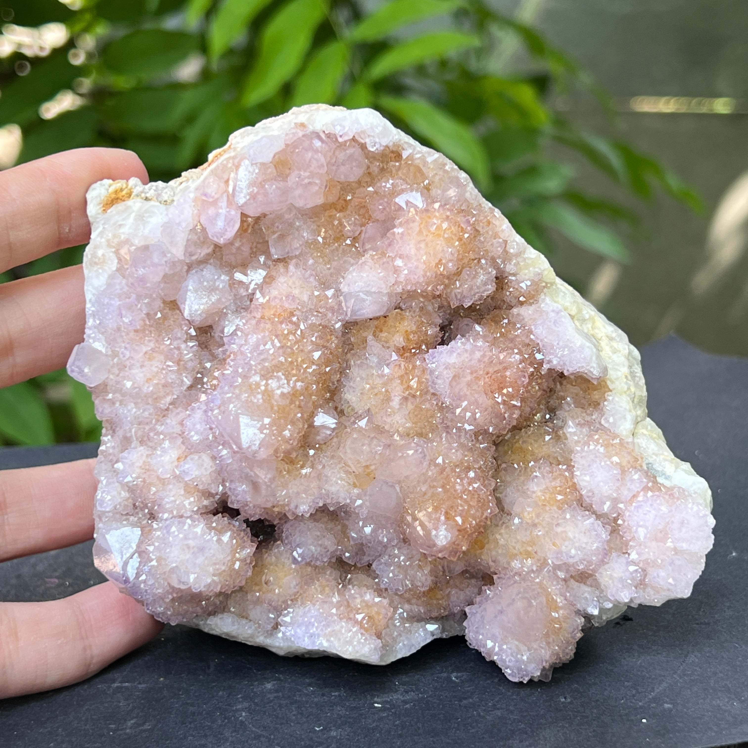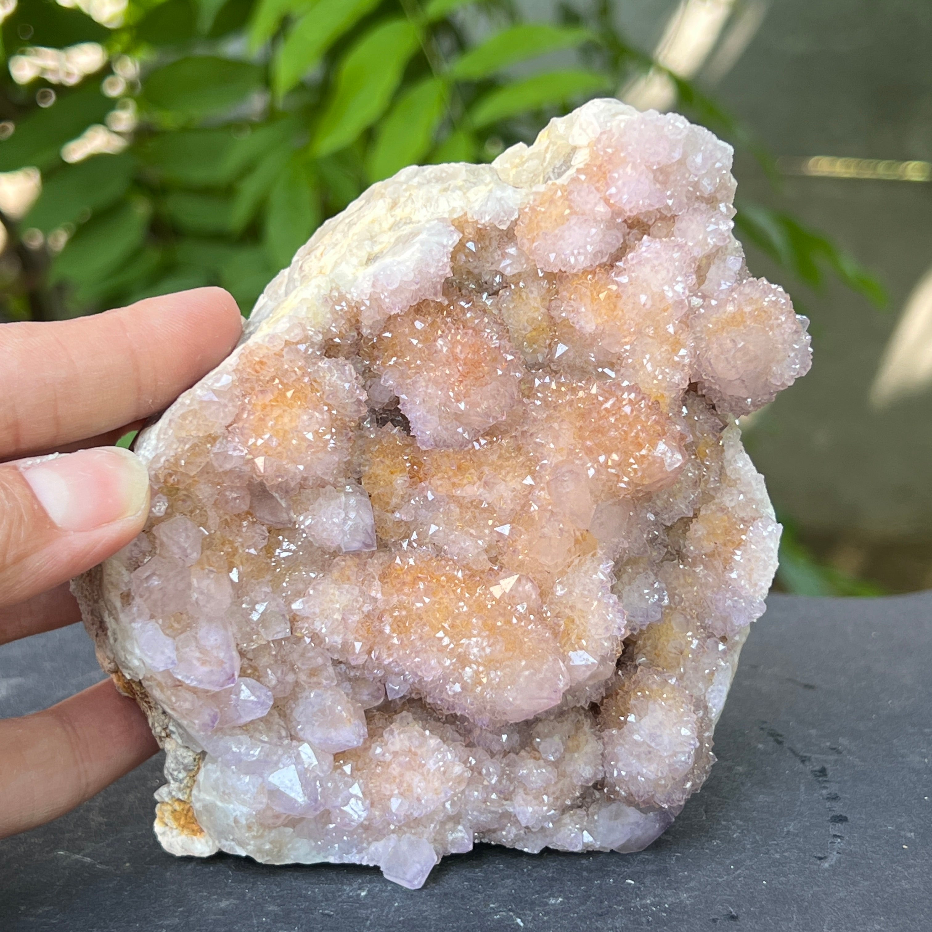 В дълбините на африканската земя, там където тишината на планините крие неразказани истории, се ражда кристал с необичайна красота: Духовният кварцов аметист, известен също като „Кактусов кварц“. Това минерално чудо изглежда обвито в мистична аура – една солидна основа, покрита с хиляди нежни върхове, като общност от кристали, обединени в танца на светлината.