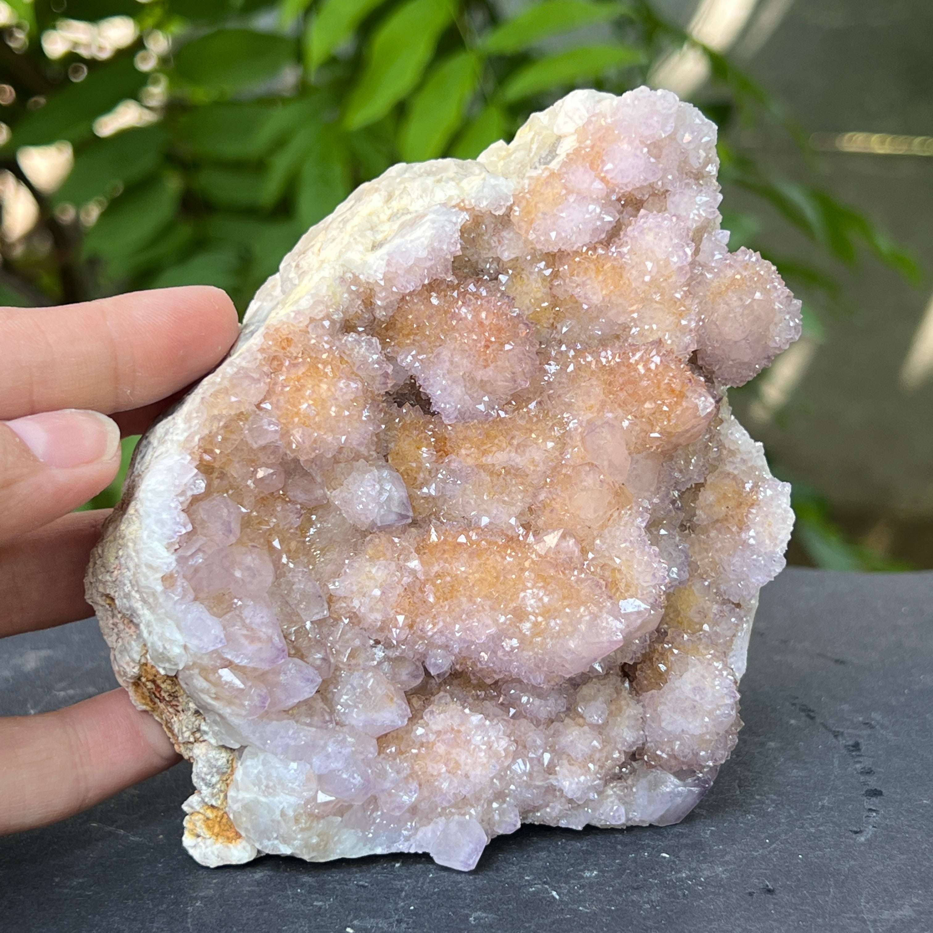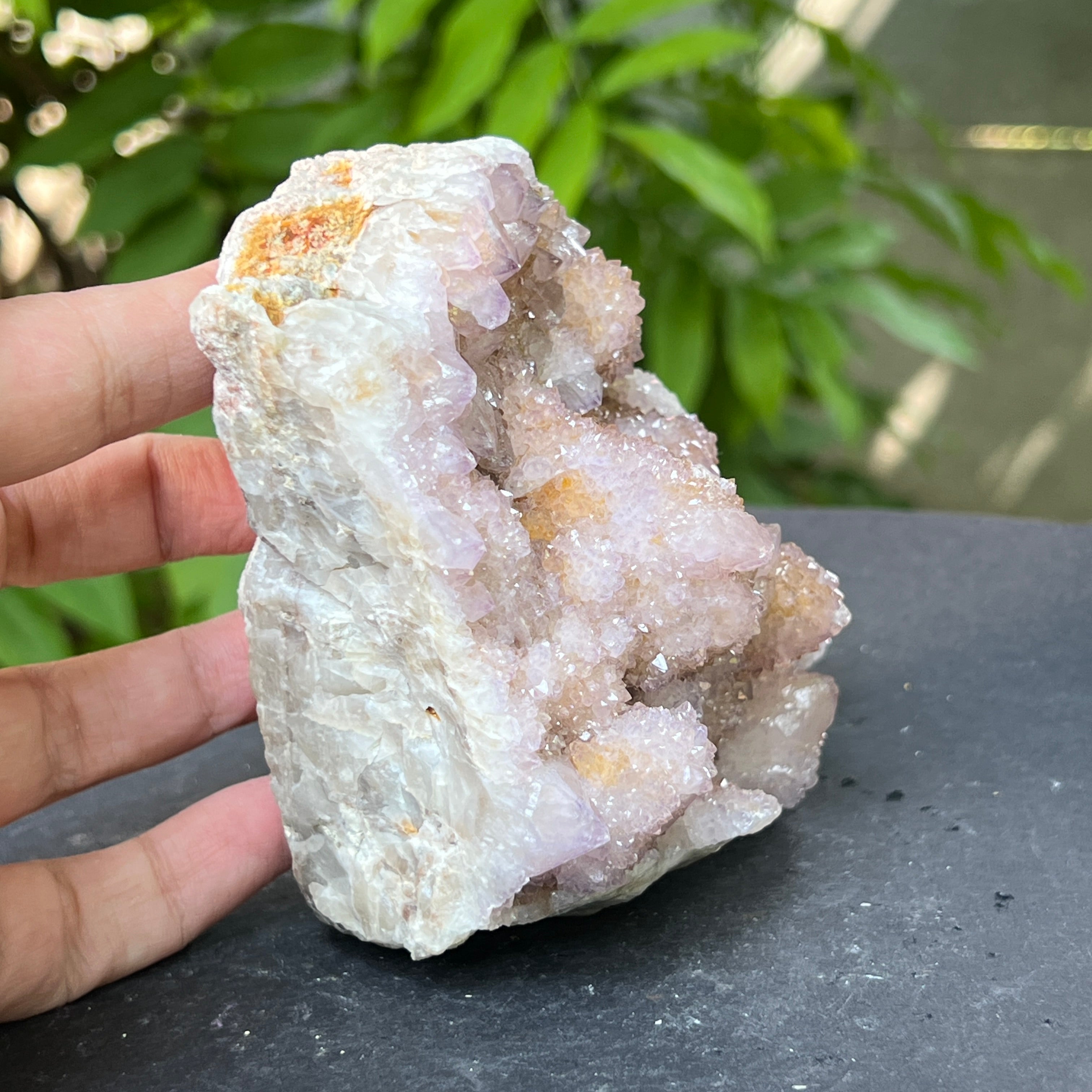 Произход от Южна Африка, този уникален образец съчетава дълбоката енергия на кварца с високите вибрации на аметиста. Това е камък на сътрудничеството и духовното общение, символ на хармонията между индивидуалността и единството. Всеки малък кристал излъчва от общия център, като мрежа от съзнания в перфектен баланс.