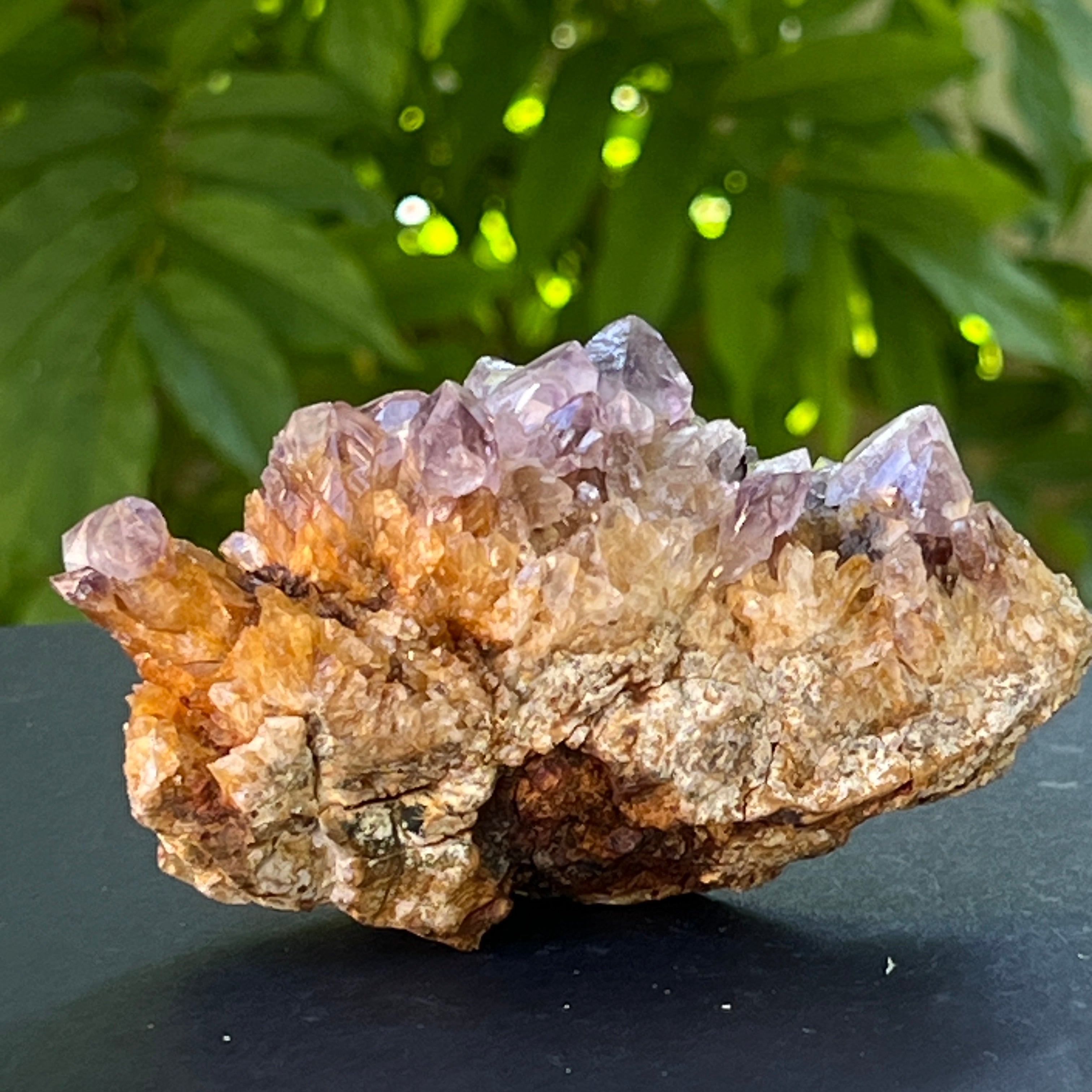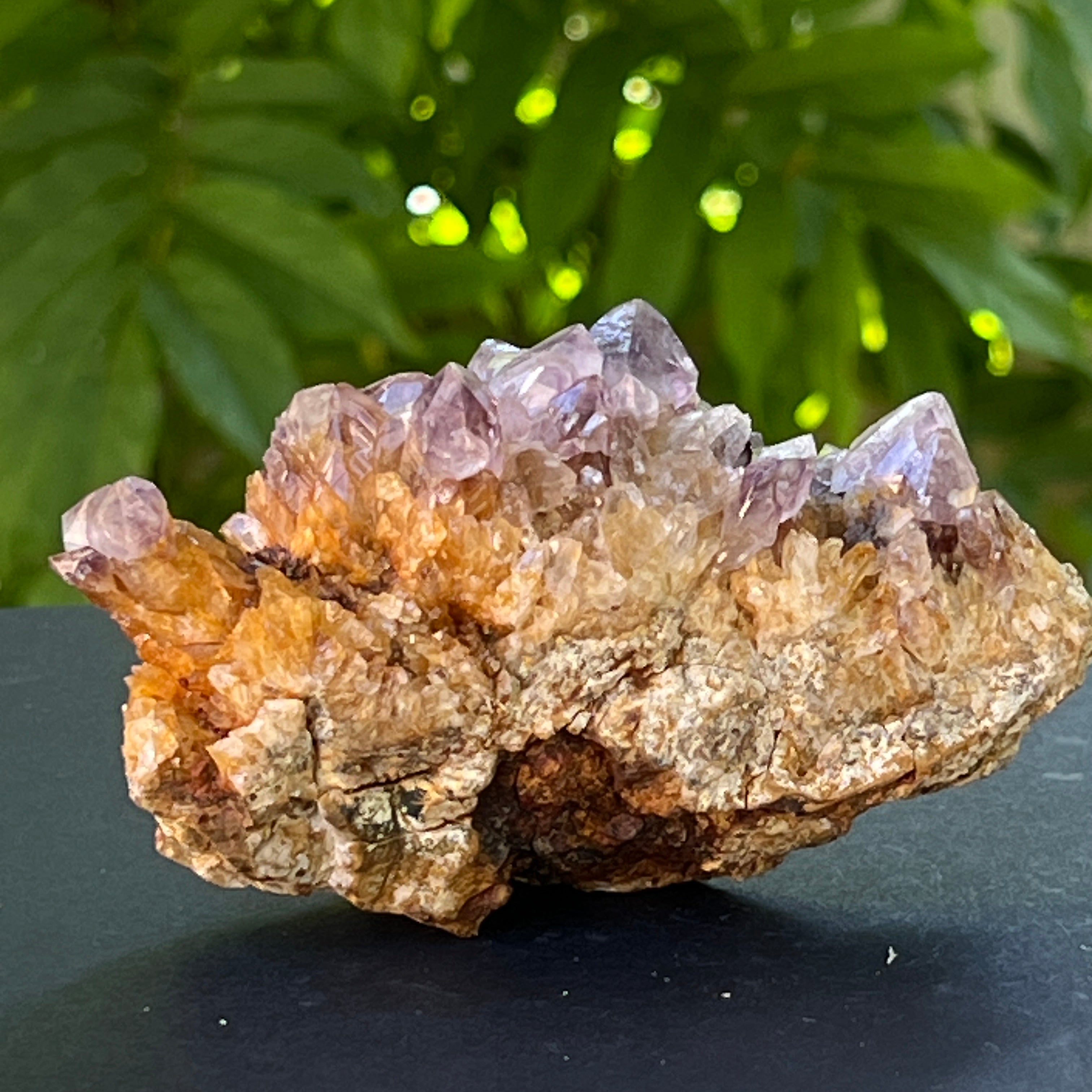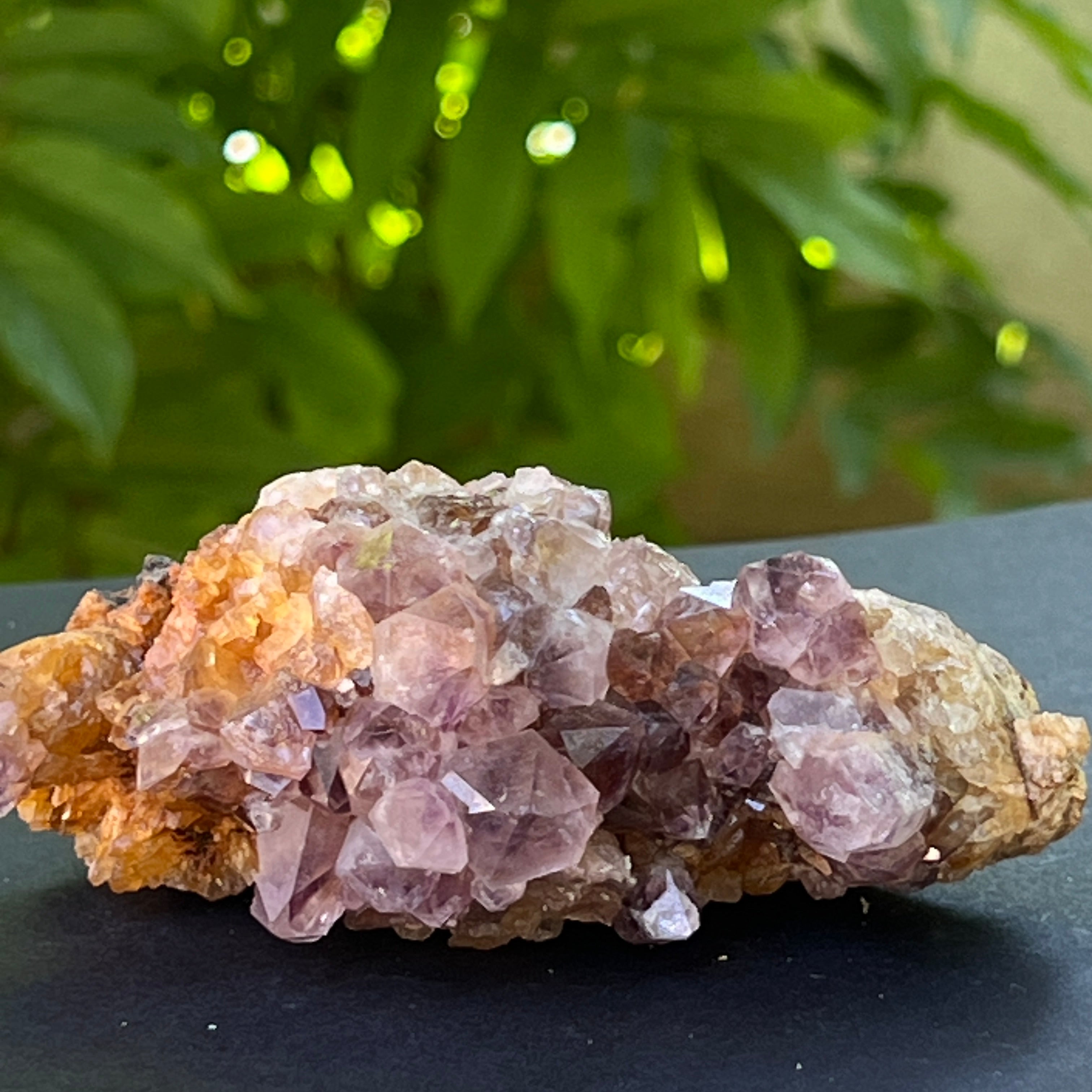 Произхождащ от Южна Африка, този уникален образец съчетава дълбоката енергия на кварца с висшите вибрации на аметиста. Това е камък на сътрудничеството и духовната общност, символ на хармонията между индивидуалността и единството. Всеки малък кристал излъчва от общия център, като мрежа от съзнания в съвършено равновесие.