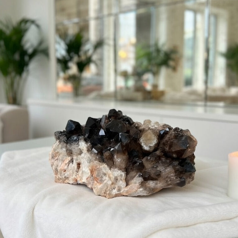 Благодарение на заземяващите си свойства, димният кварц често се свързва с основната чакра, разположена в основата на гръбначния стълб. Смята се, че помага на индивида да се свърже с енергията на Земята и насърчава усещания за сигурност и стабилност.