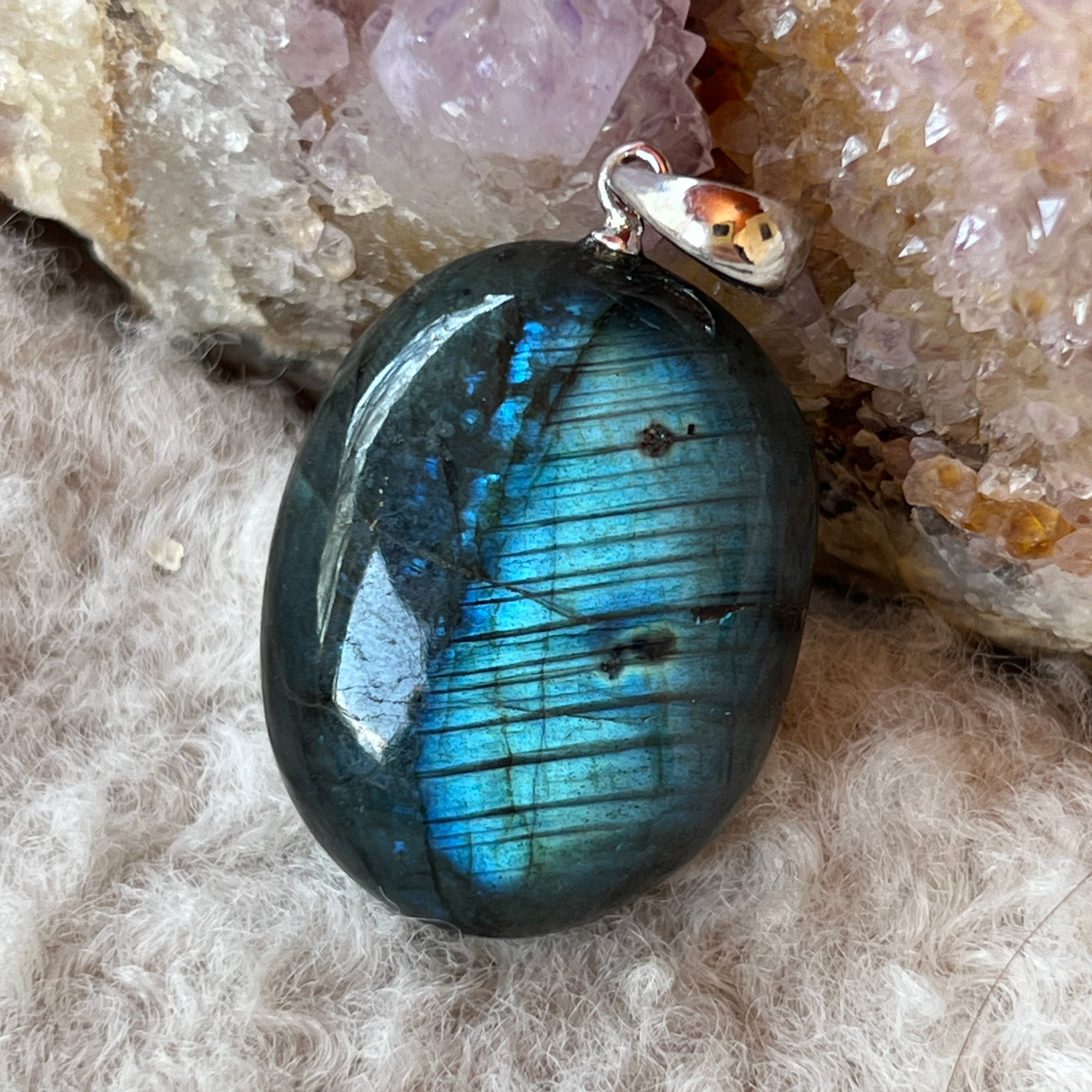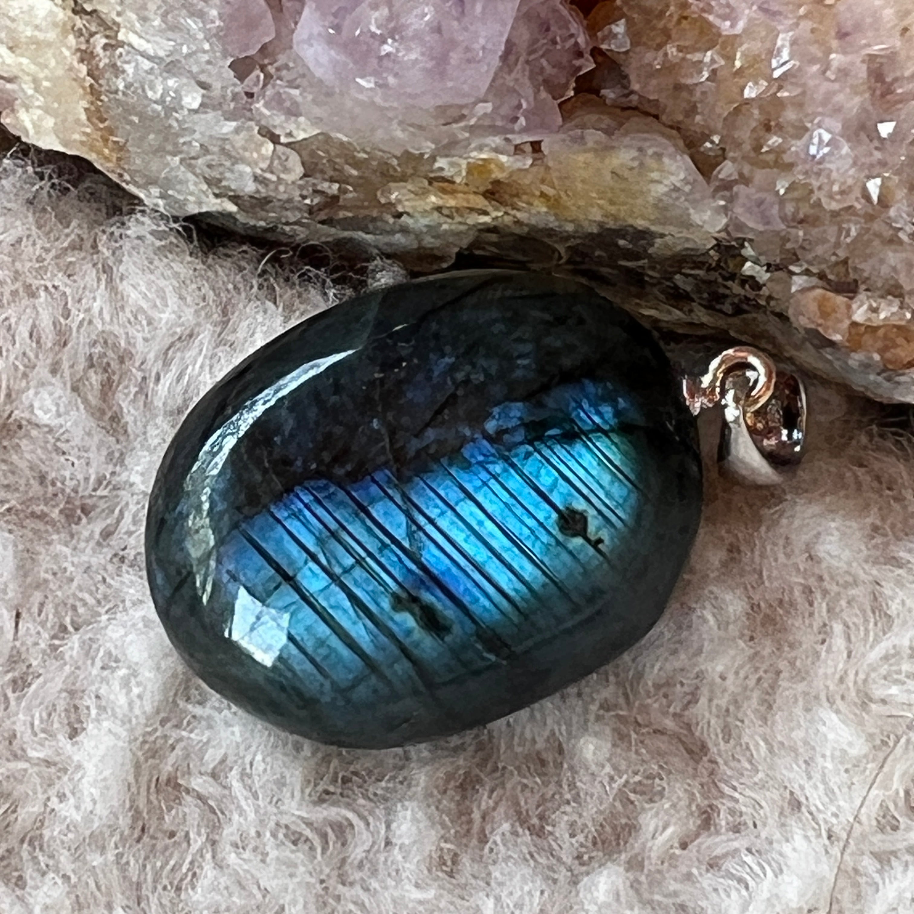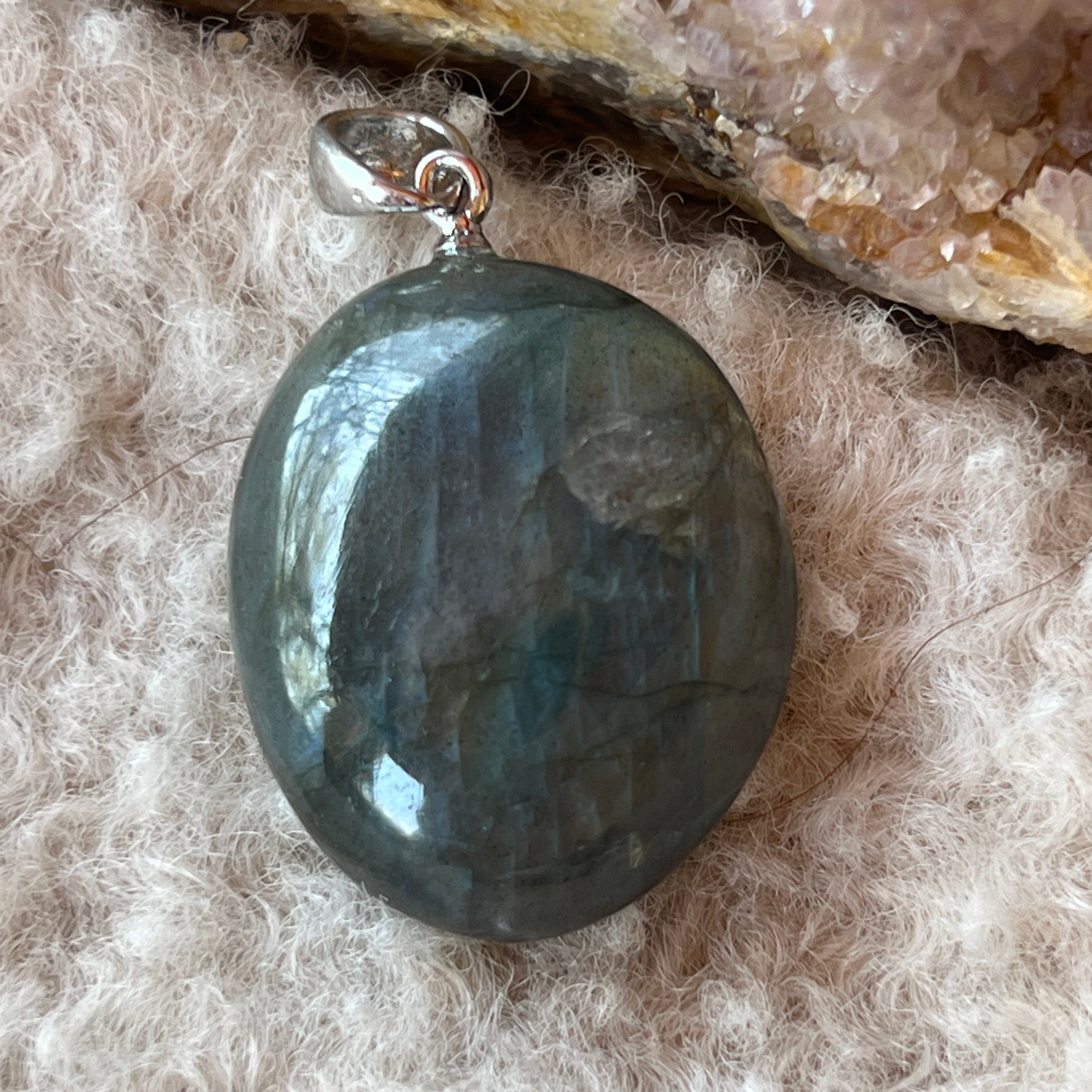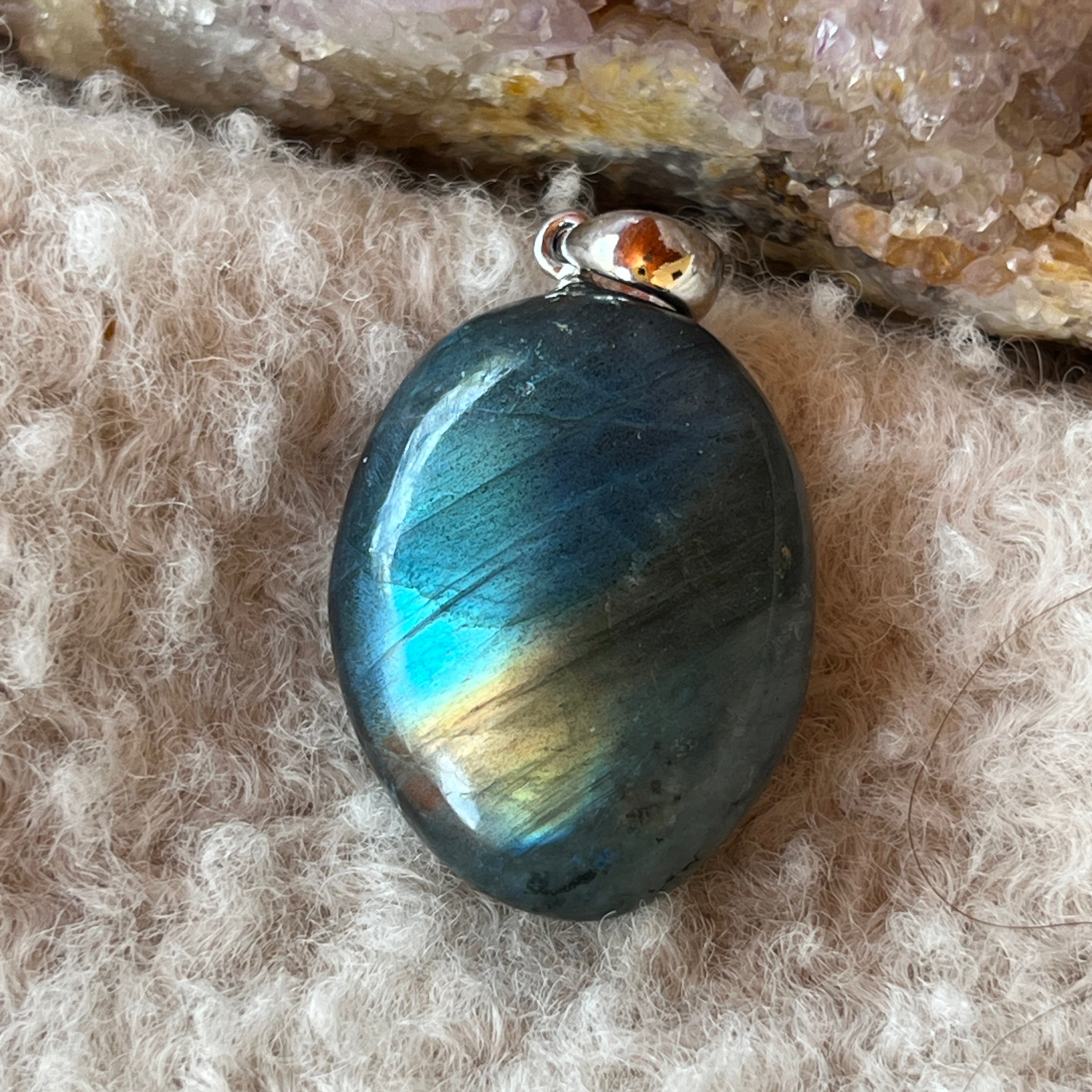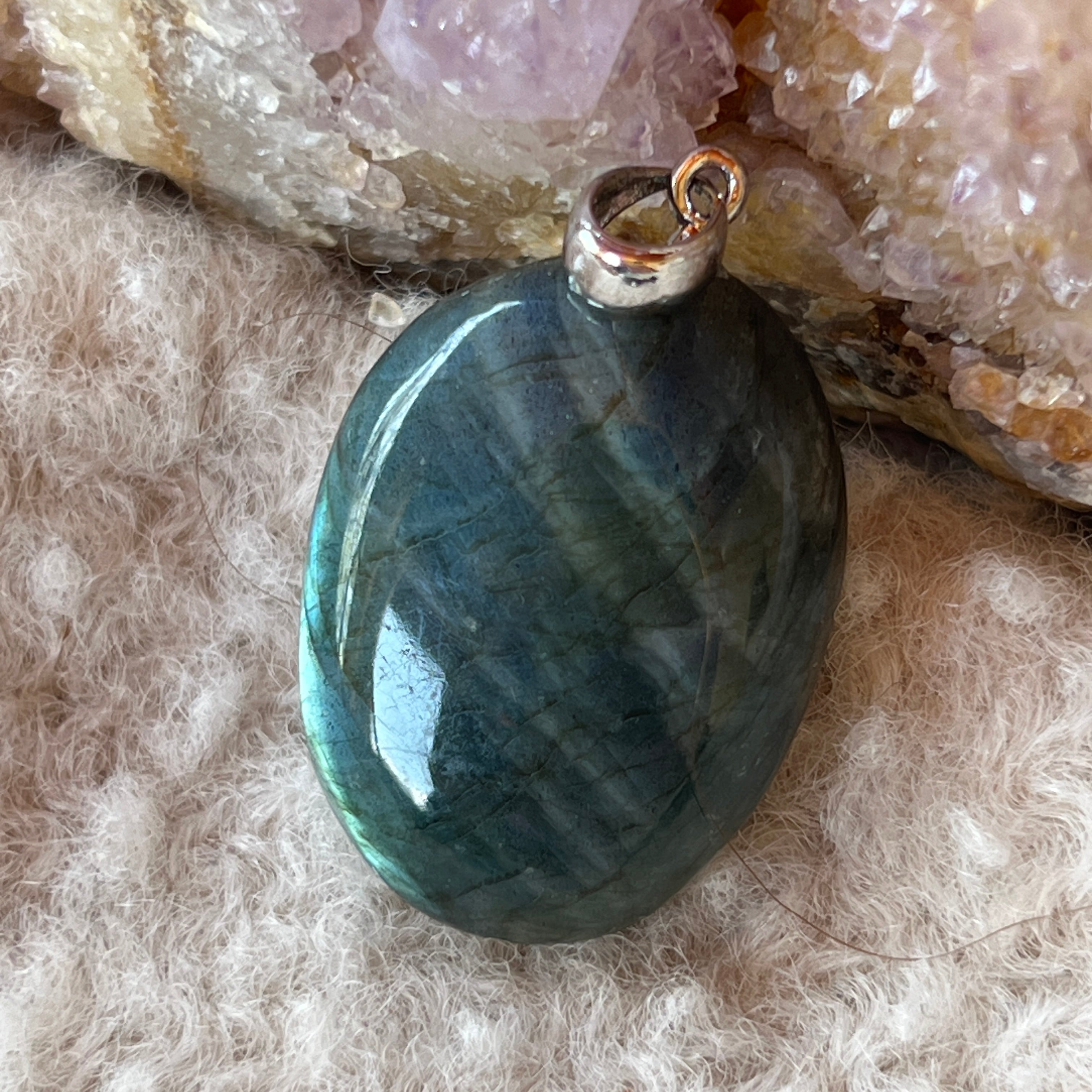 Избери овалния висулка от лабрадорит, за да носиш винаги със себе си магията на иризациите му и трансформиращата енергия на този мистериозен камък ✨🌌.