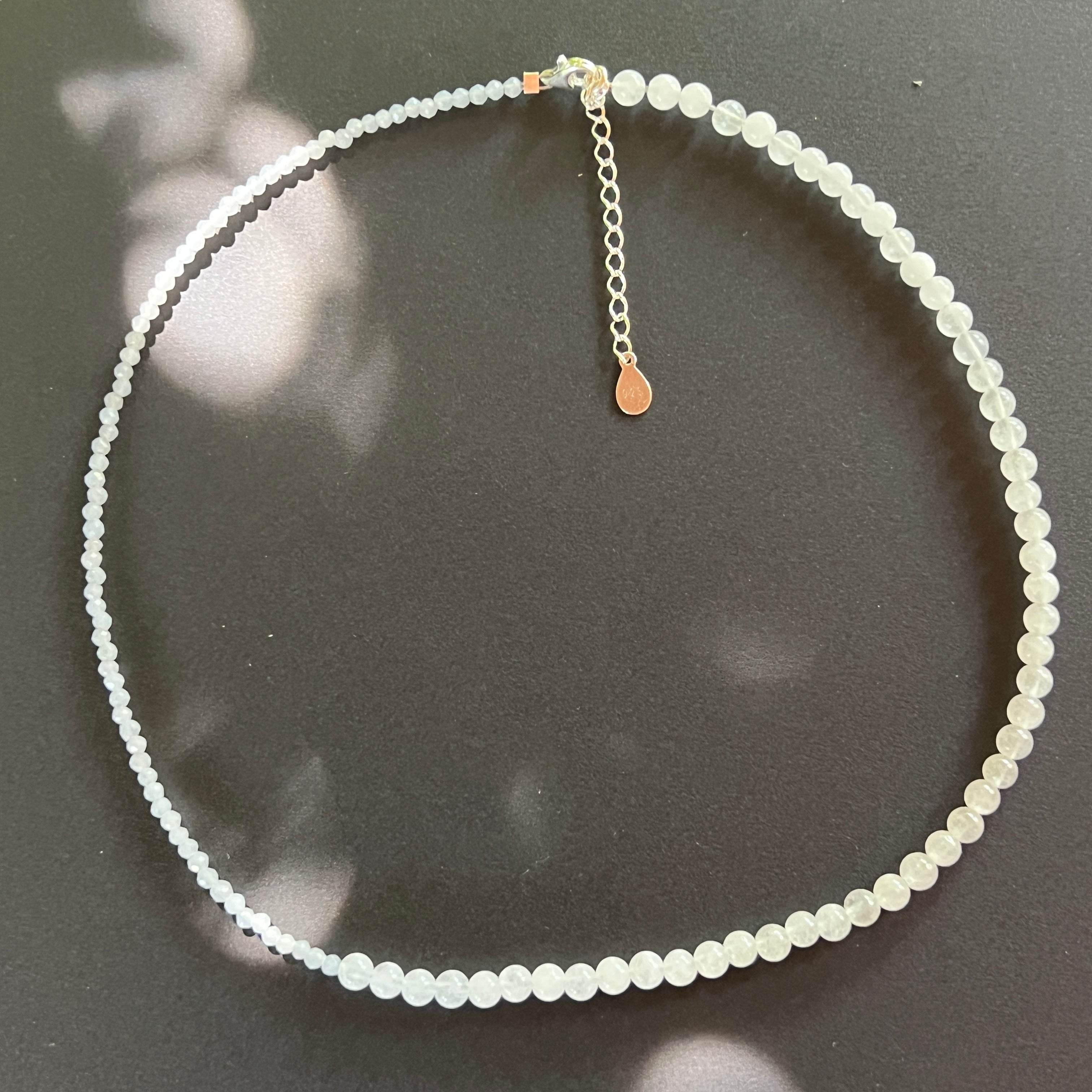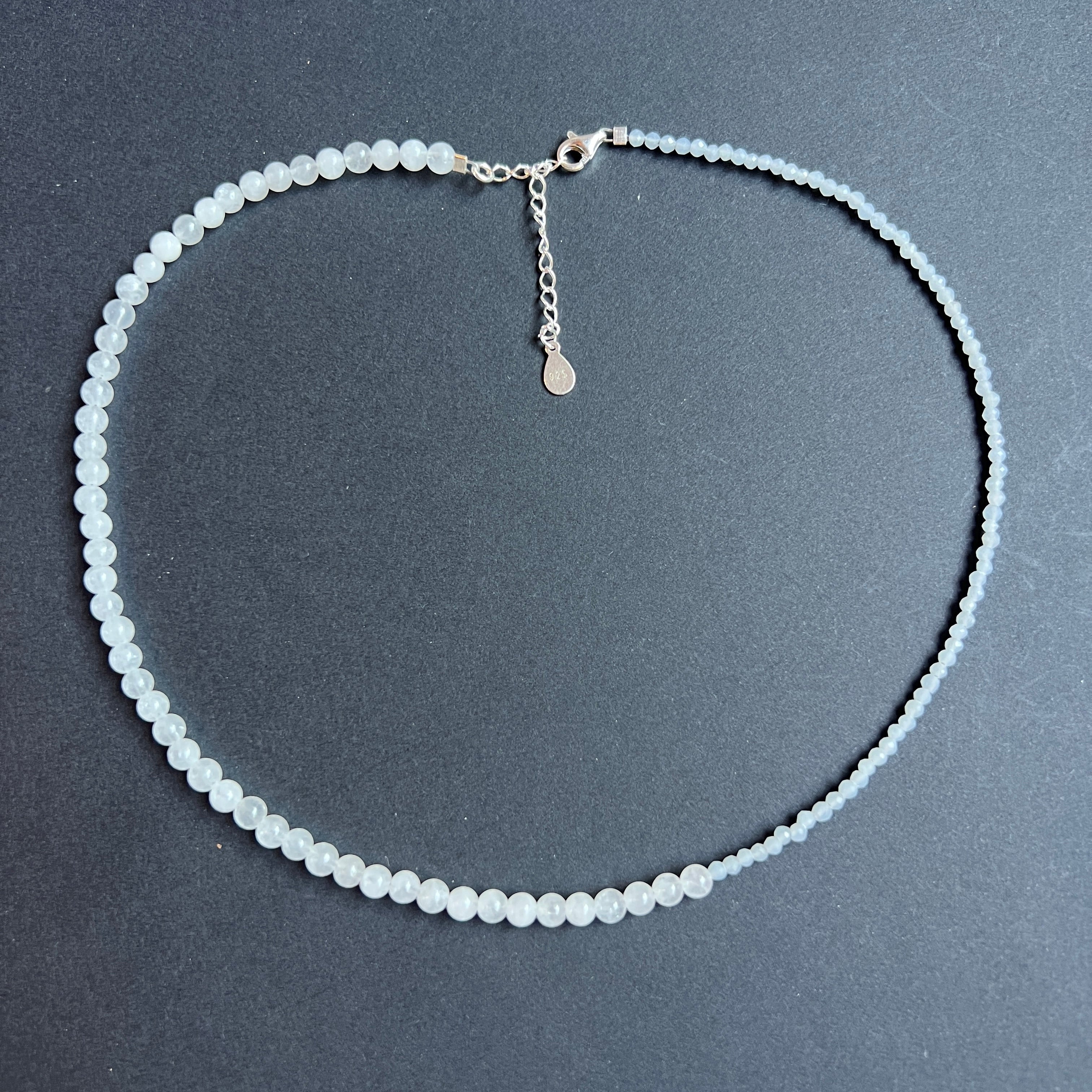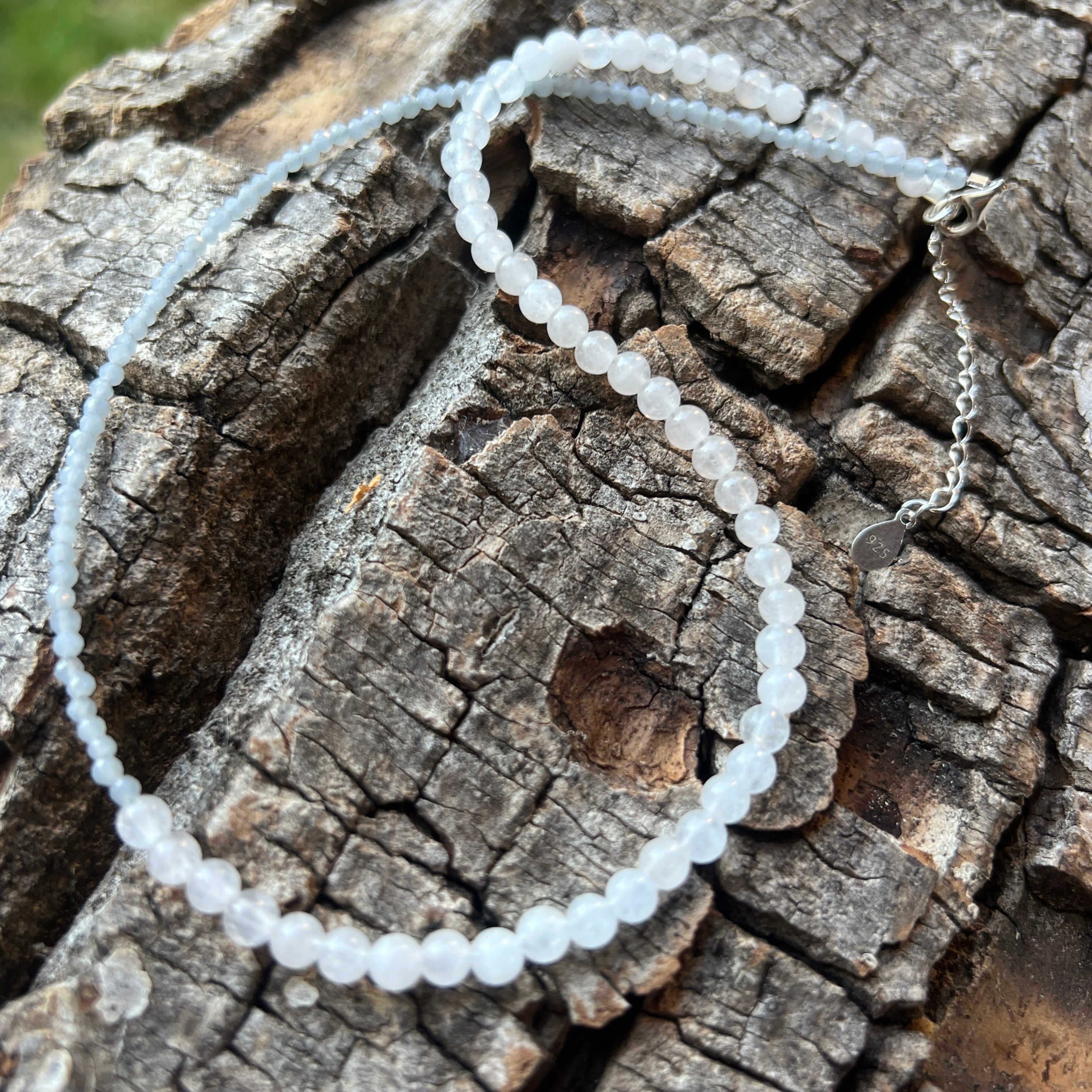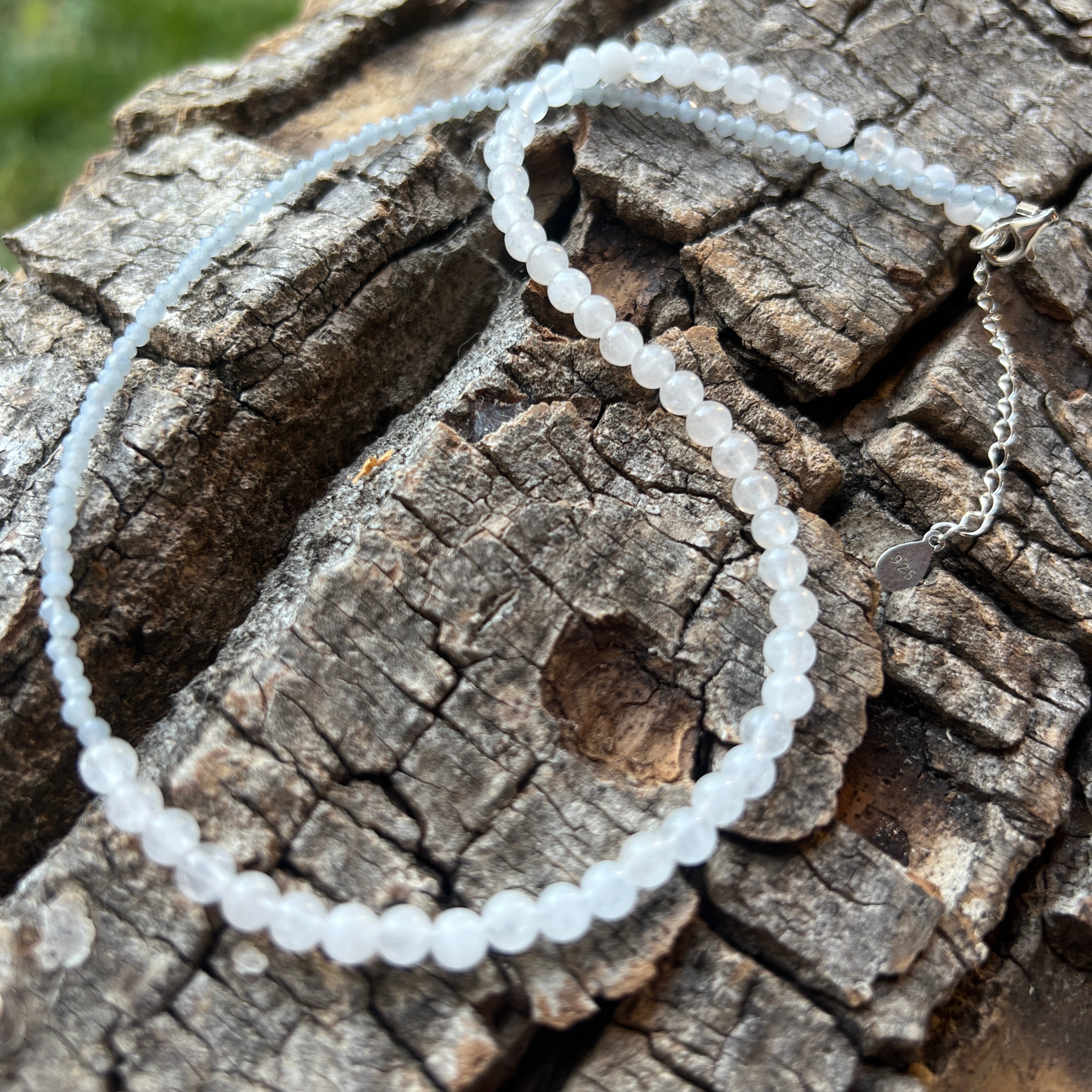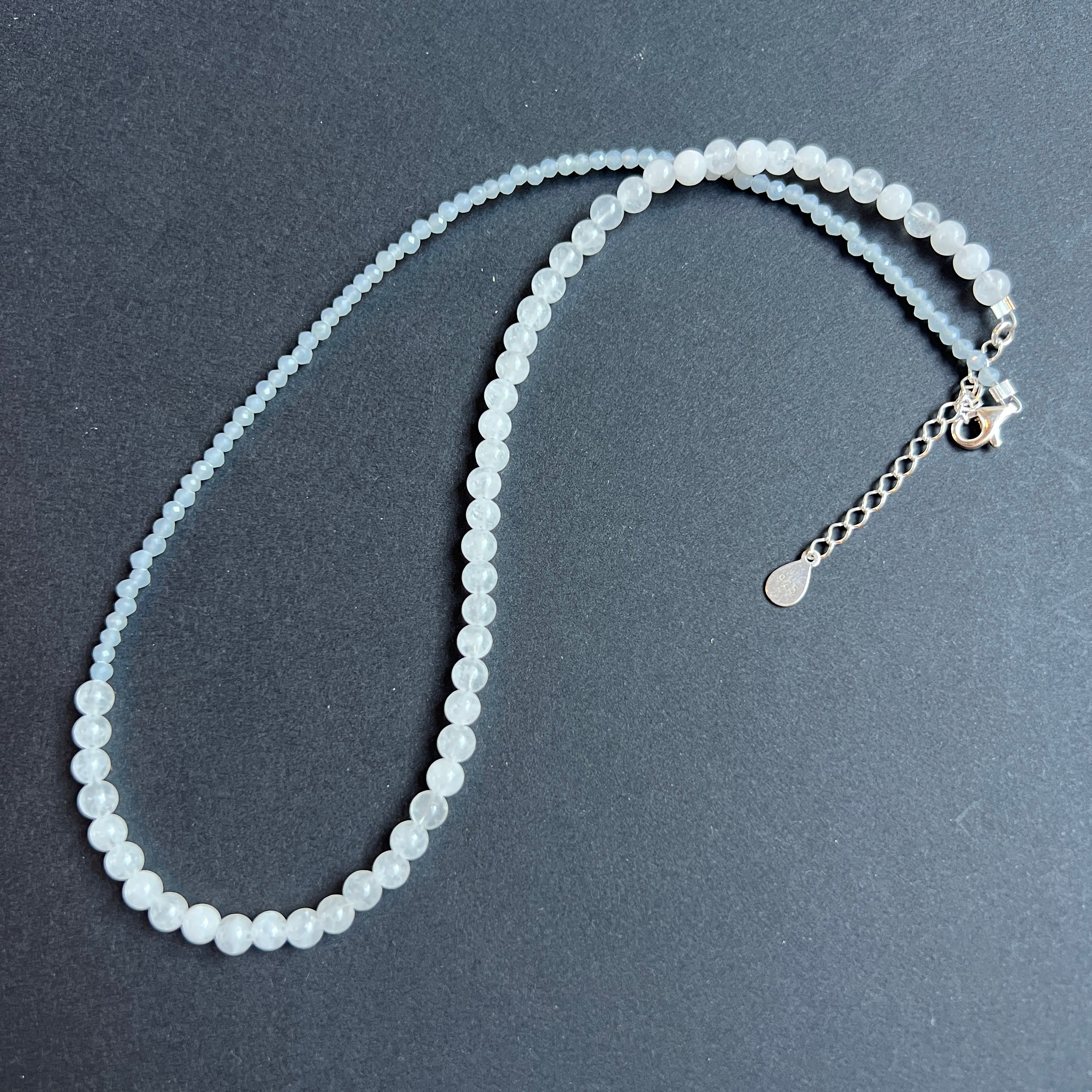 Носи го като преход между състояния – колие, което свързва пречистващото бяло със духовното синьо, като мост между това, което си, и това, което ставаш.
