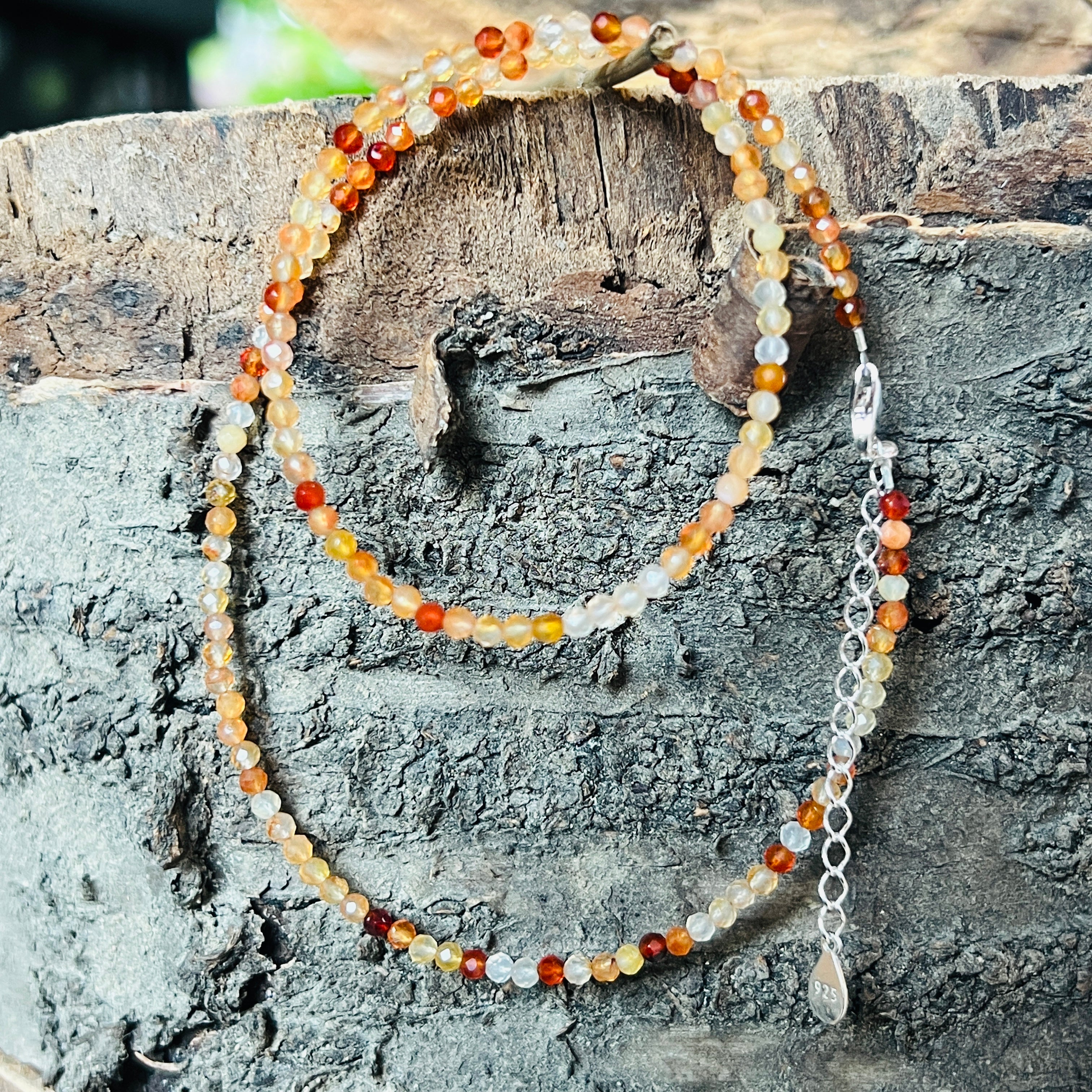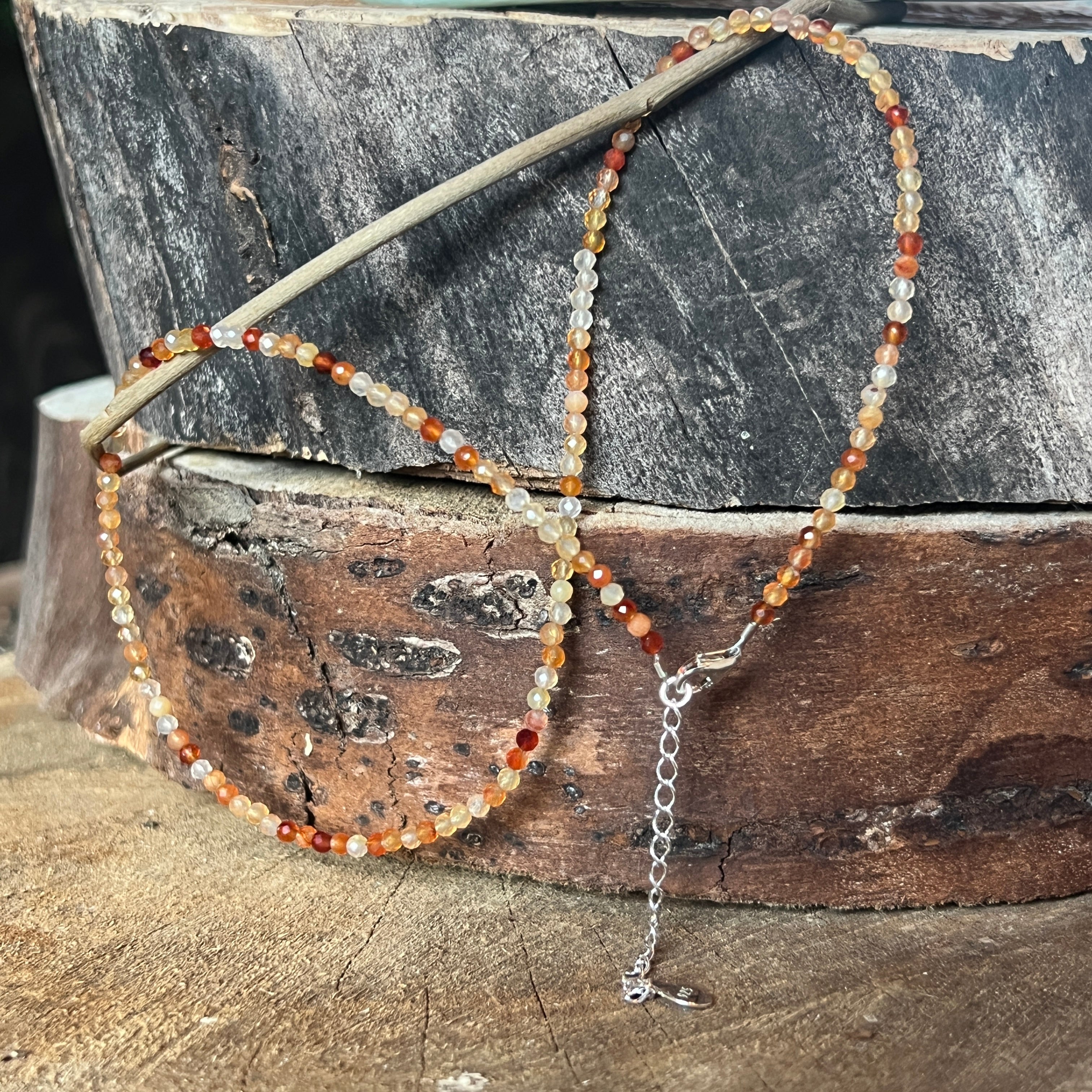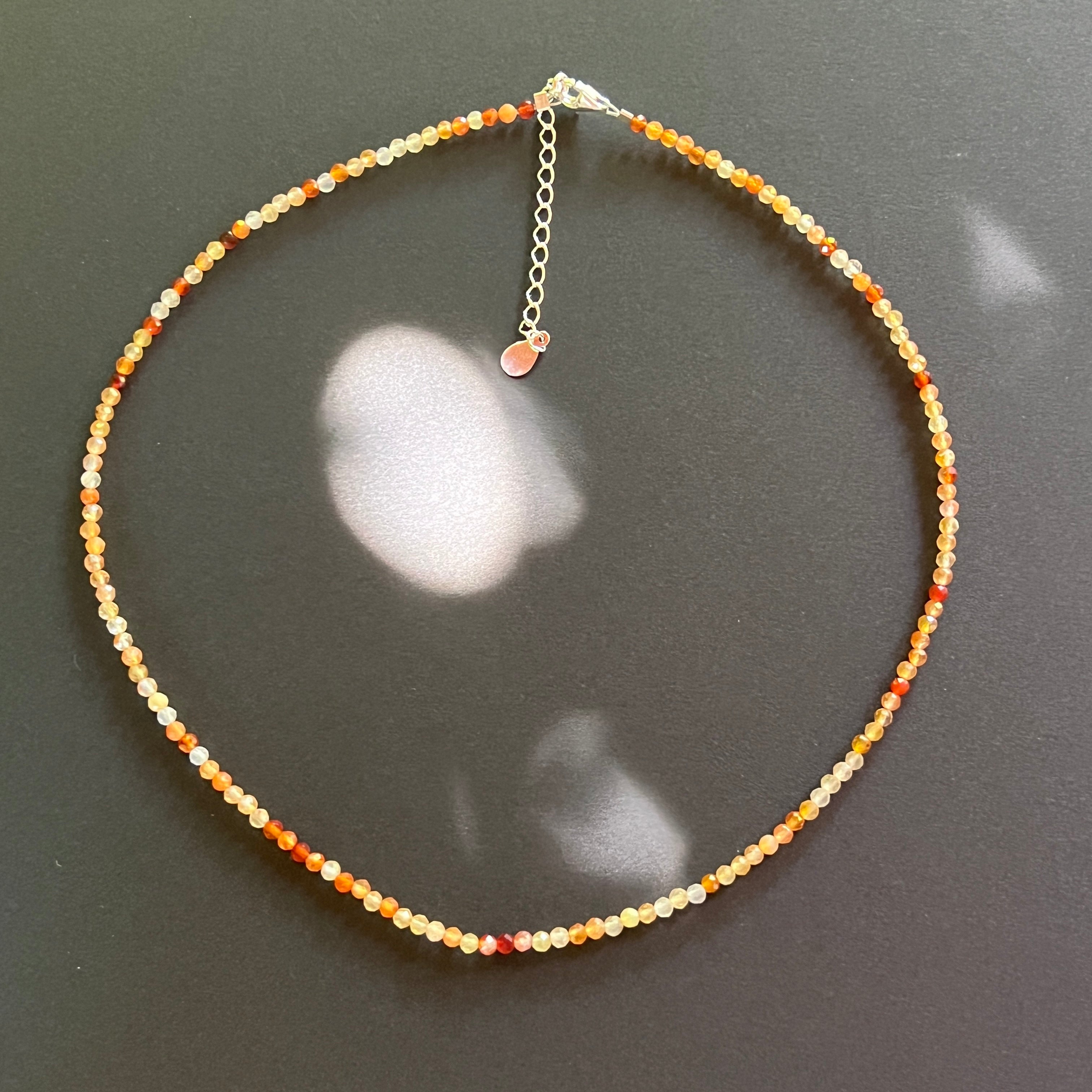 Деликатно, но живо ожерелие, като линия огън, нарисувана с прецизност. Фасетирани мъниста от карнеол, едва 3 мм, блестят дискретно в различни нюанси на оранжево и червено – като капки топла светлина, събрани от тропически залез.