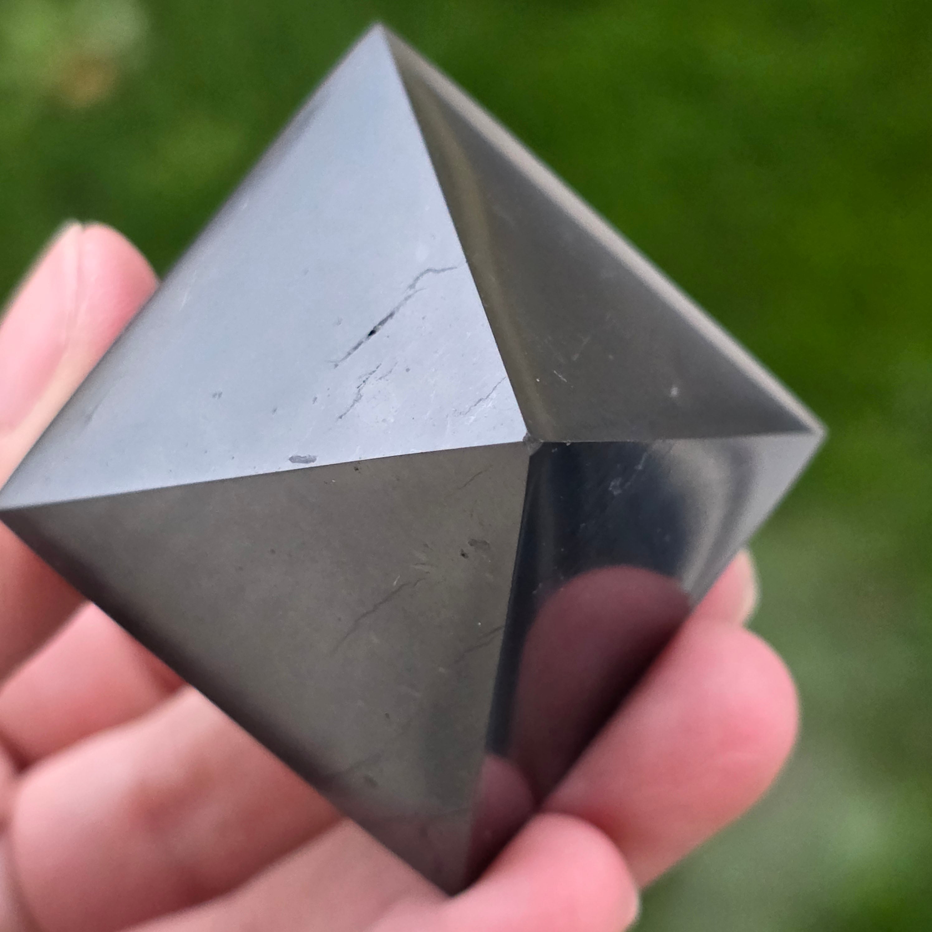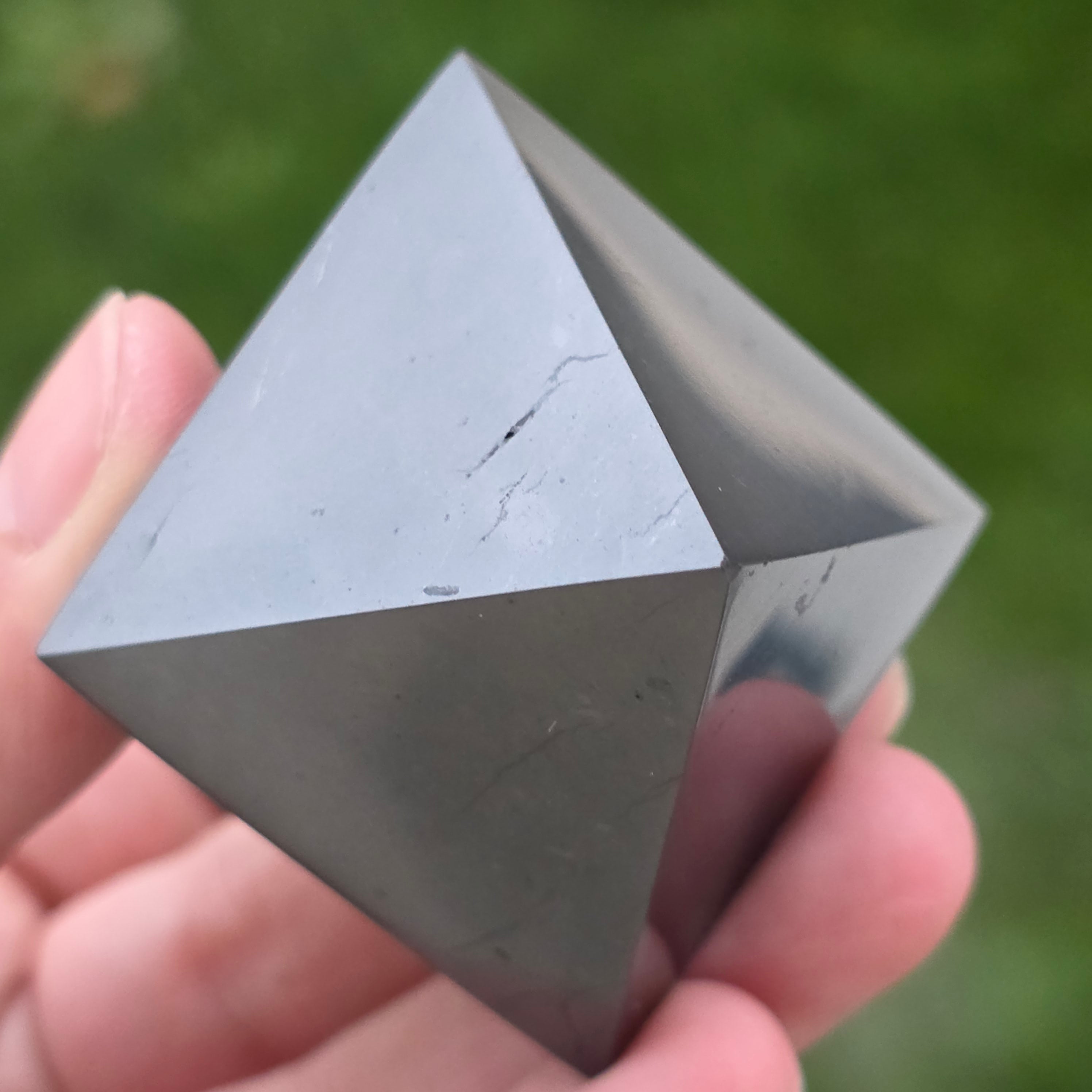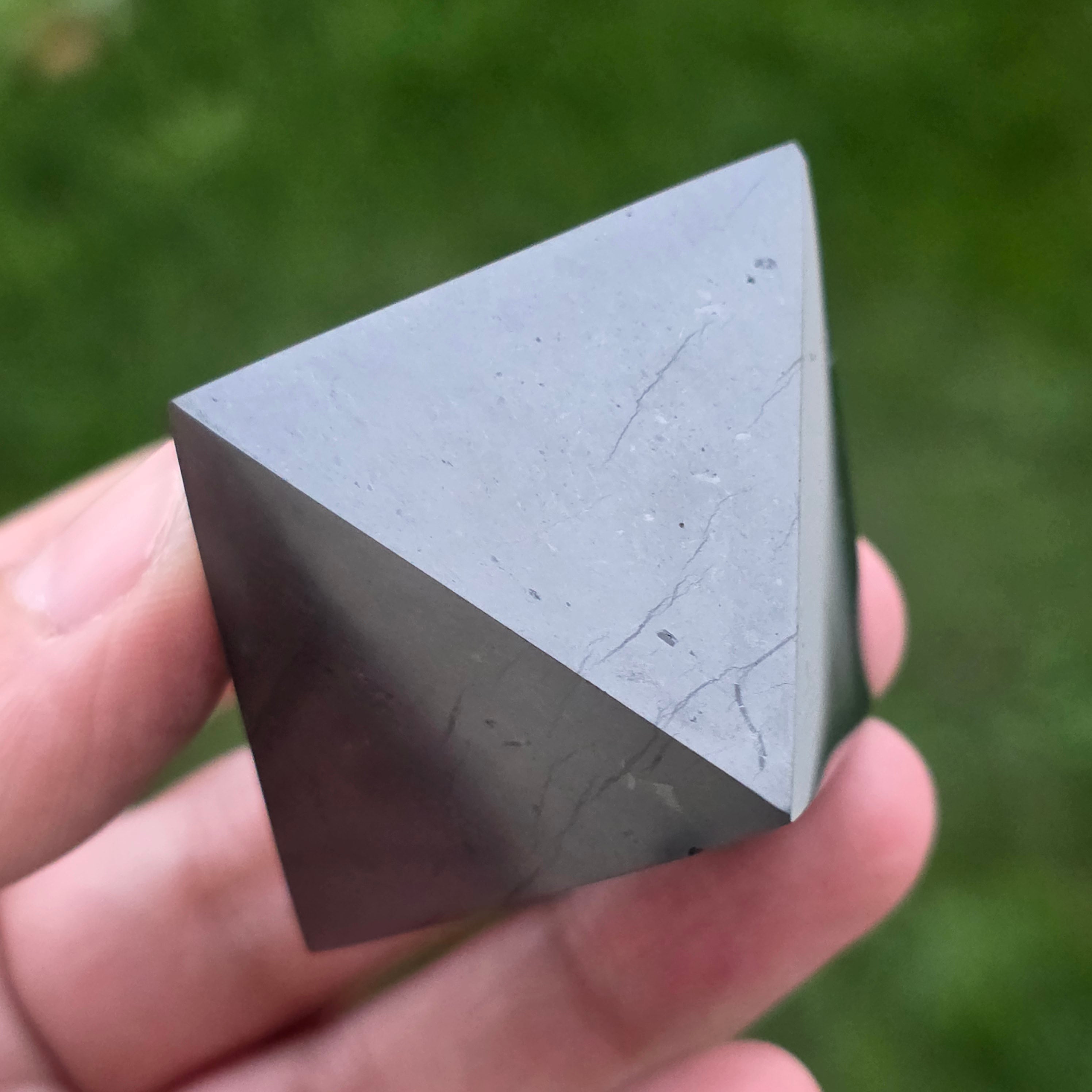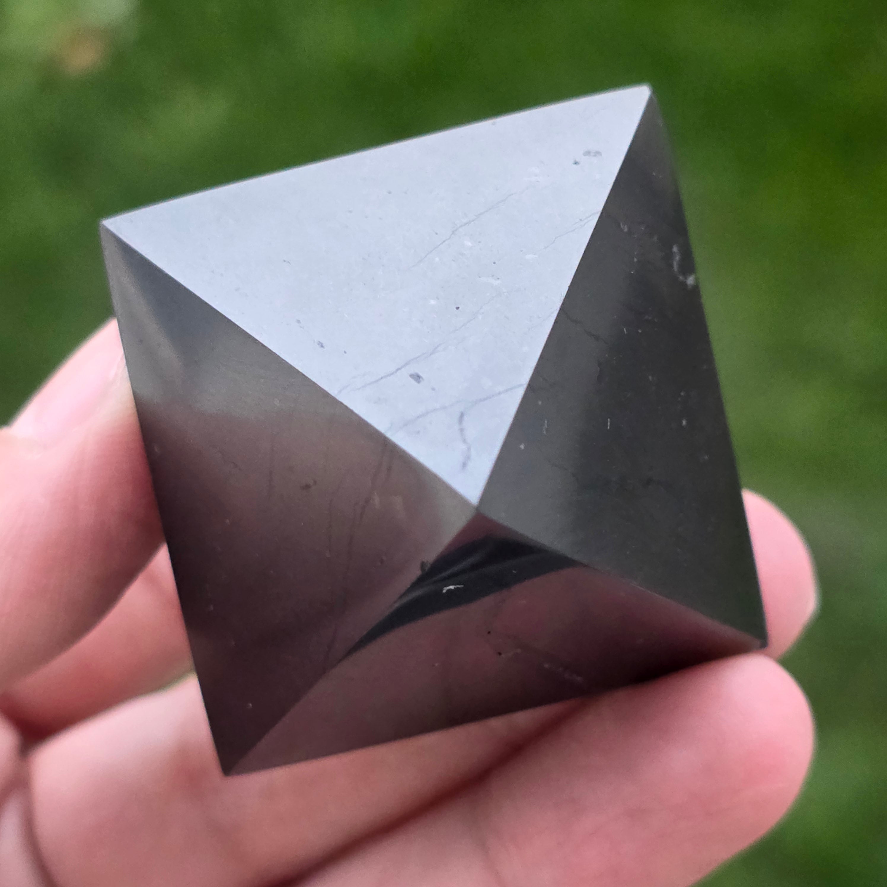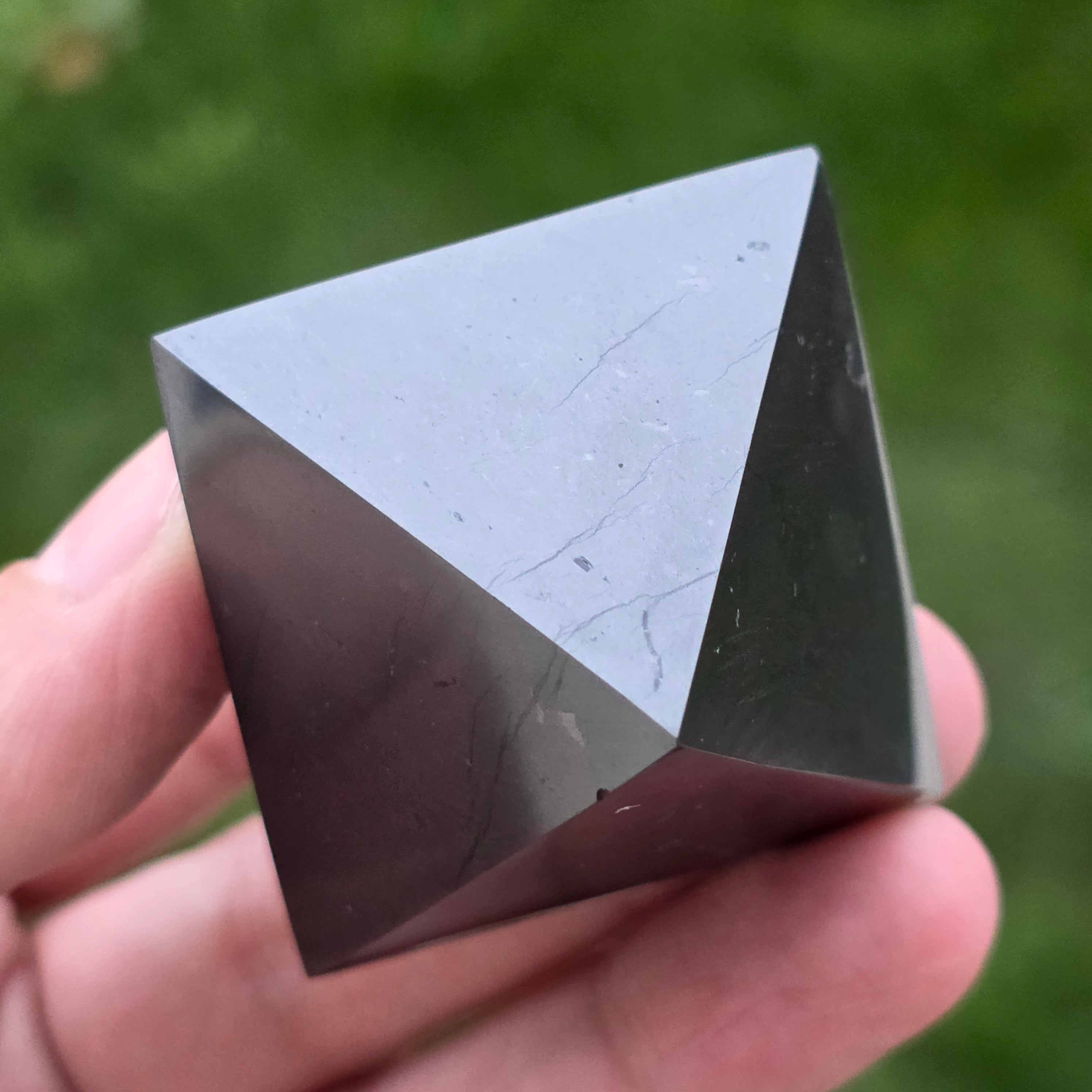 Октаедърът от шунгит е форма на баланс и умствена яснота. В свещената геометрия октаедърът се свързва с елемента въздух и с хармонизацията между умственото и емоционалното ниво. Неговата перфектно симетрична структура подкрепя вътрешния ред, проницателността и способността да се гледат ситуациите от ясен и балансиран ъгъл.
