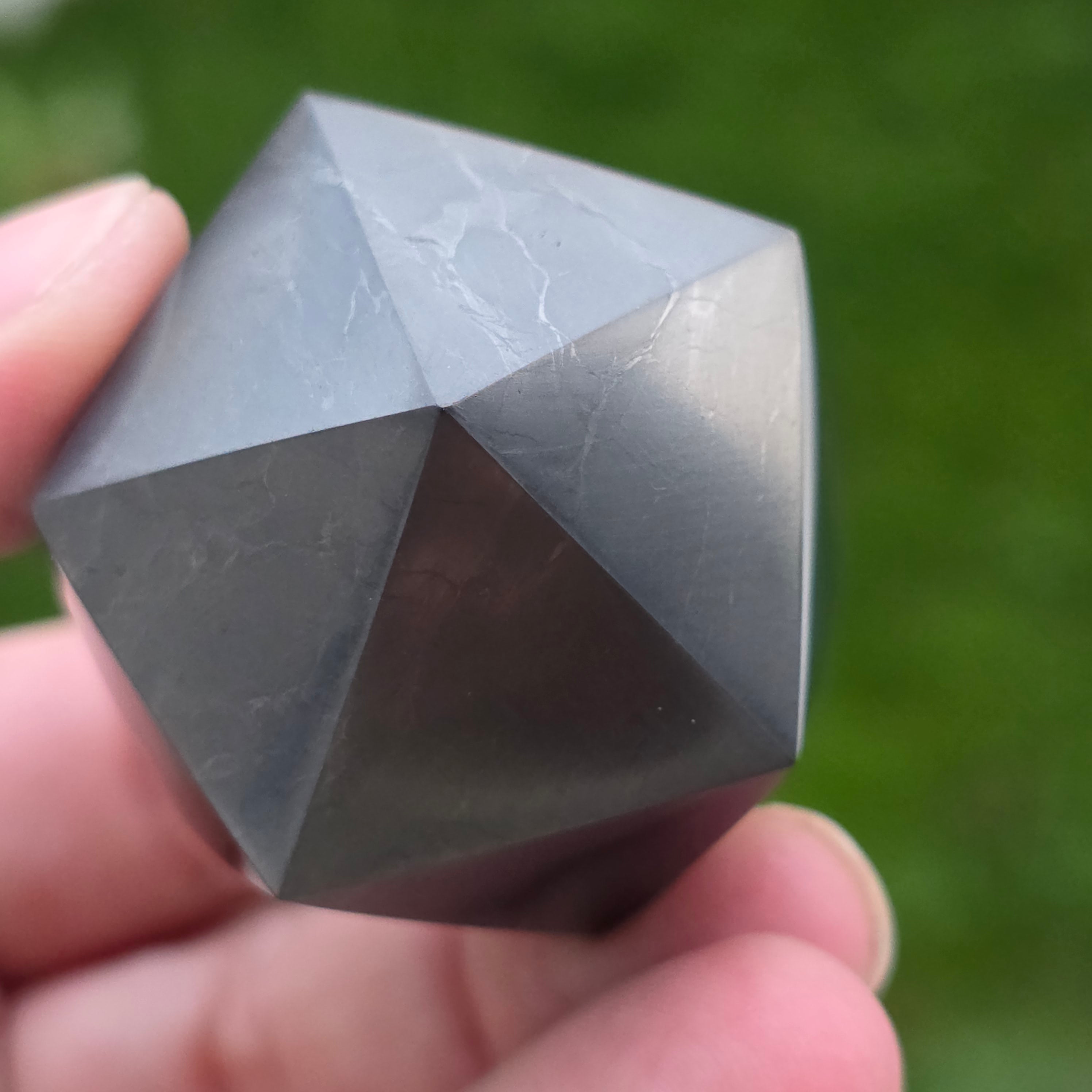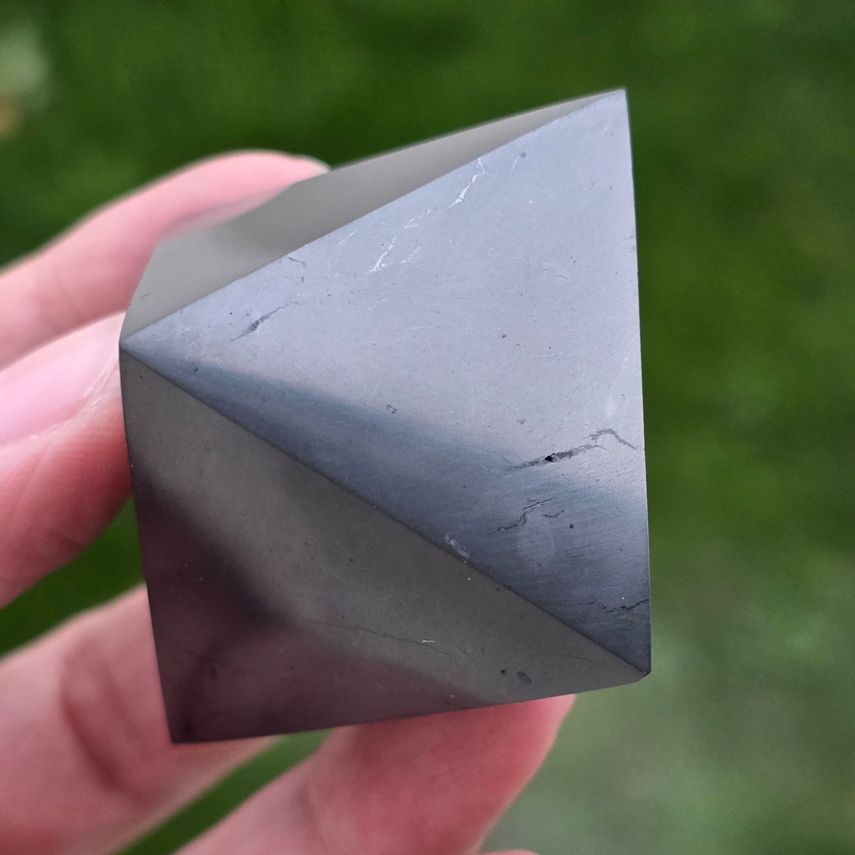Шунгитът, древен камък, богат на въглерод, е известен със способността си да пречиства енергията и да намалява електромагнитните влияния. Съчетаването с октаедрична форма създава обект с роля на финa стабилизация, подходящ за пространства, в които се работи интелектуално или се вземат важни решения.