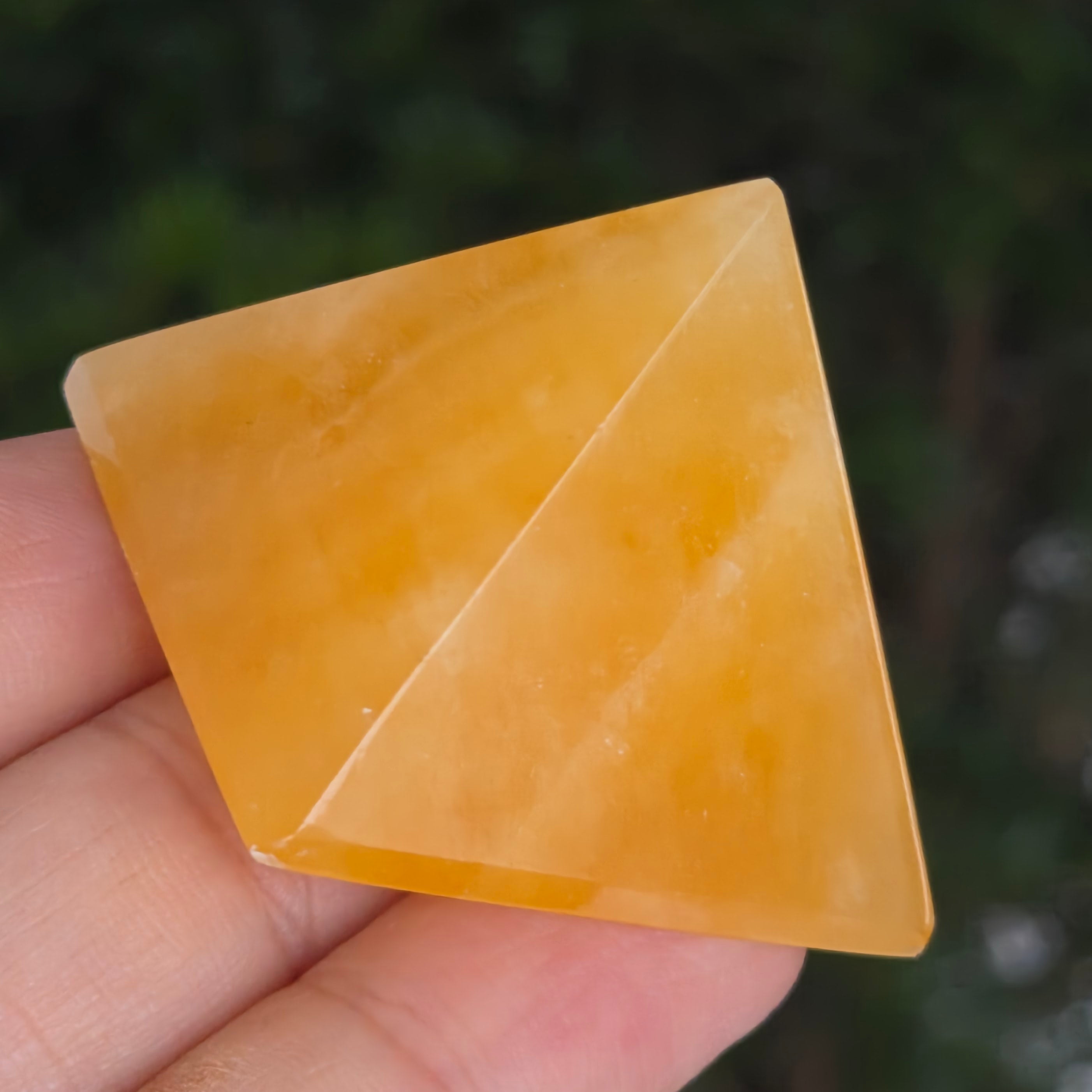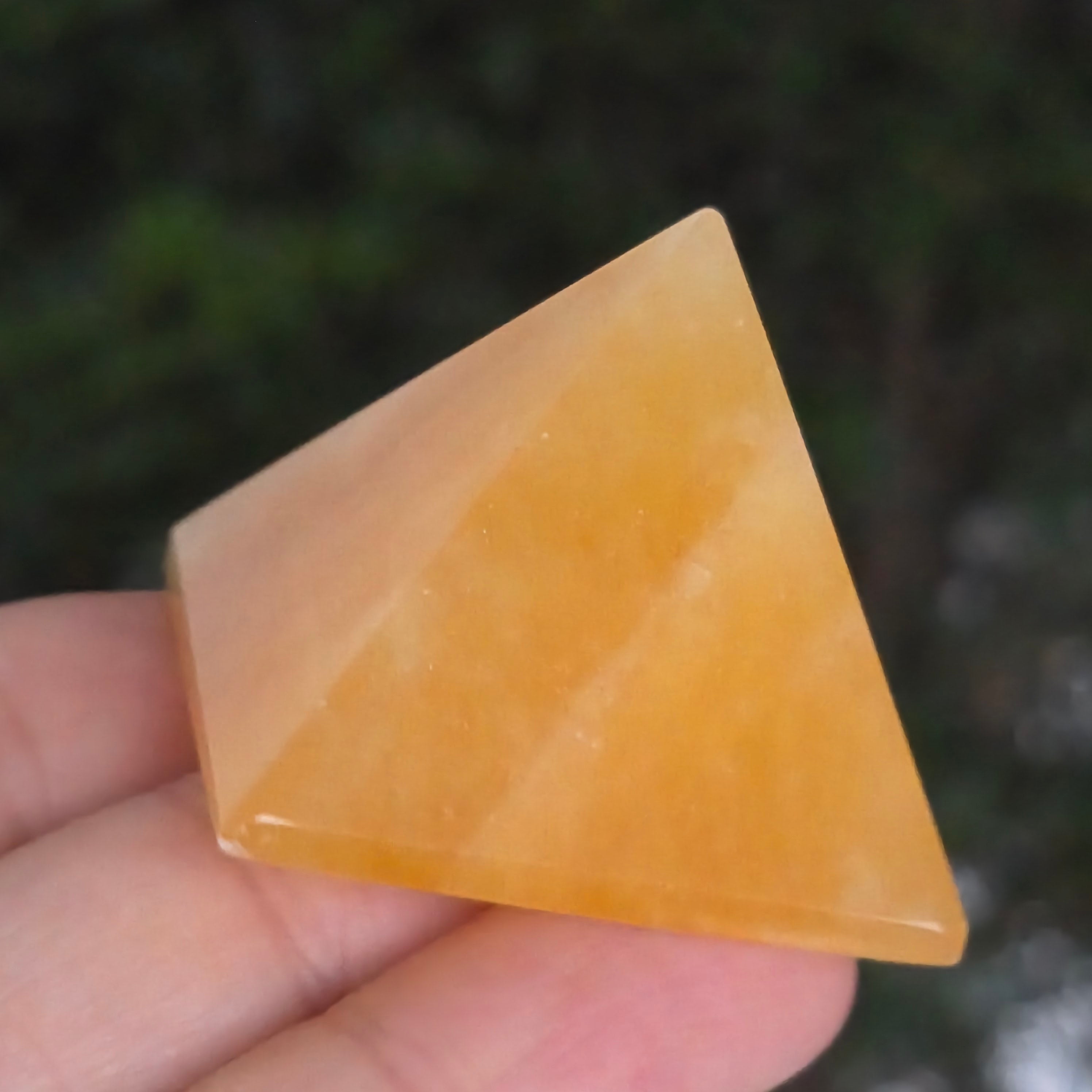 Пирамида, която изглежда издълбана от слънчева светлина. този натурален оранжев калцит, излъчва нежна топлина с нюанси, вариращи от медено оранжево до полупрозрачно златно. Неговата гладка текстура, копринена на допир, улавя светлината и я отразява с ярък блясък, внасяйки радост и свежест във всяко пространство.