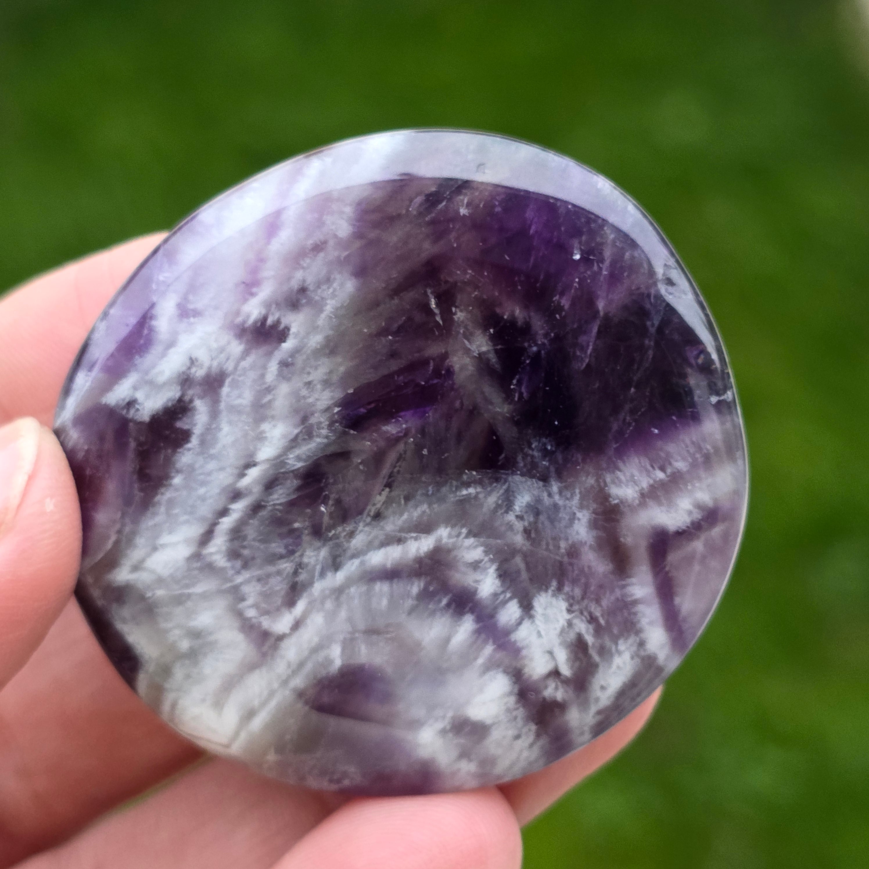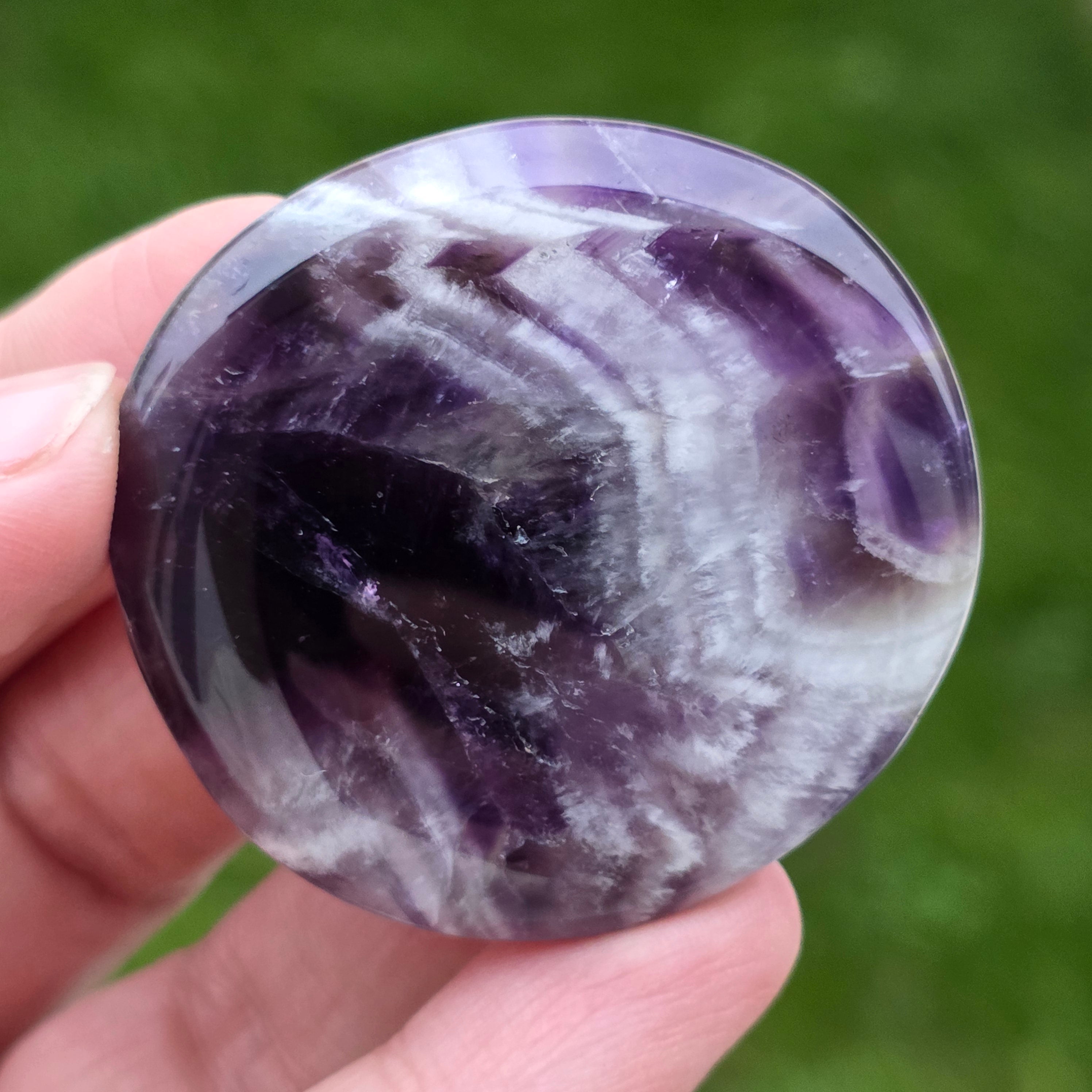 Аметистът шеврон е известен с асоциацията си с коронната и третото око чакри, увеличавайки интуицията и способността за вземане на решения.