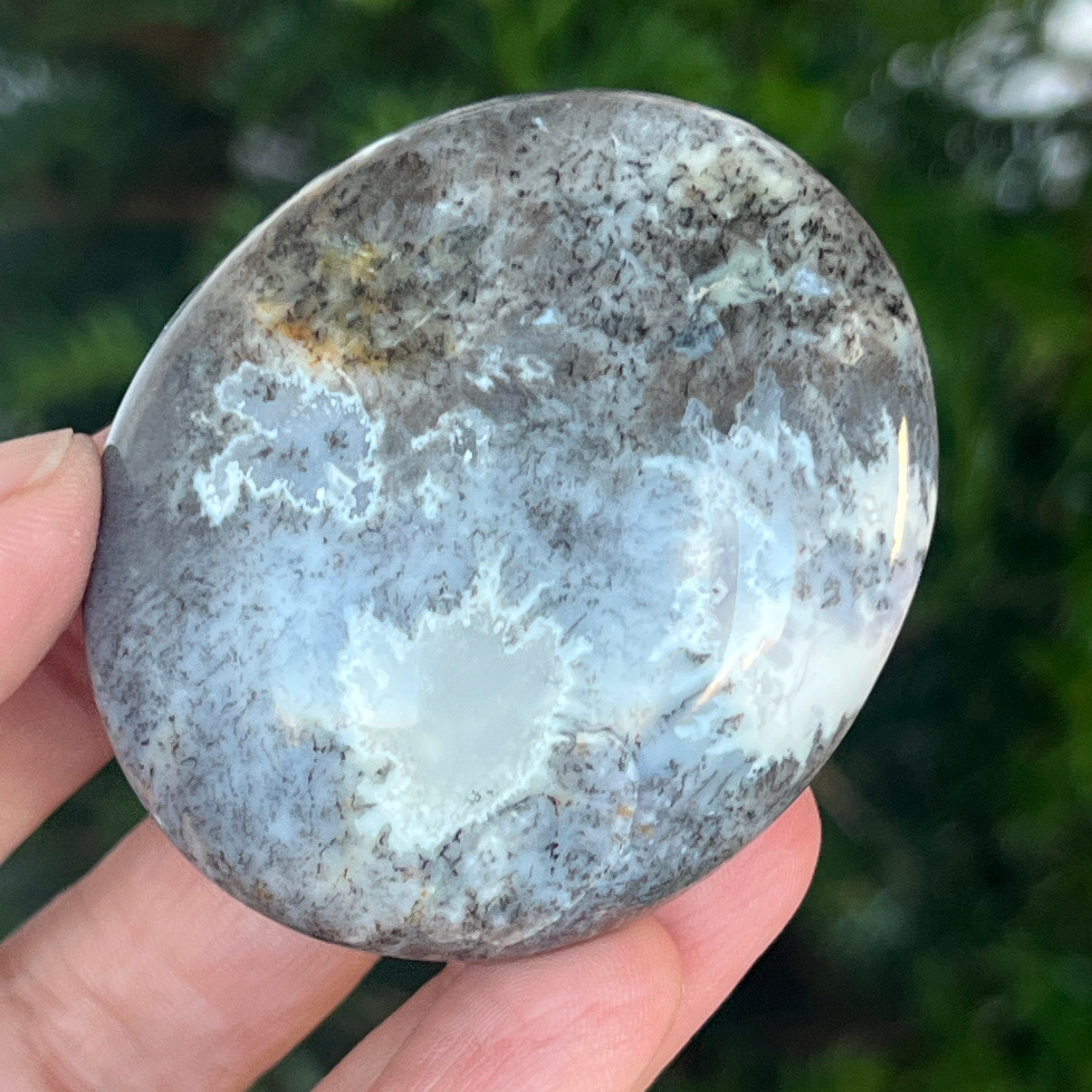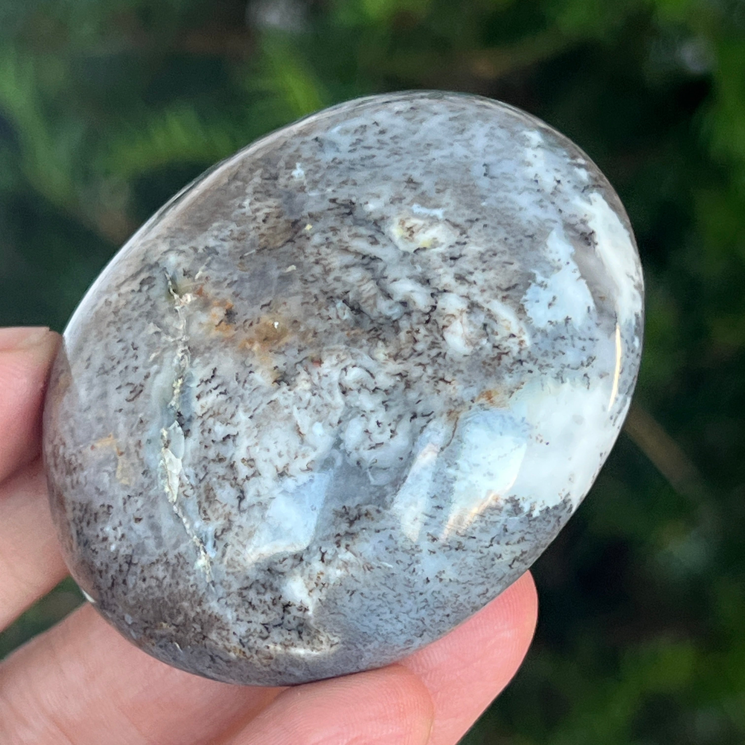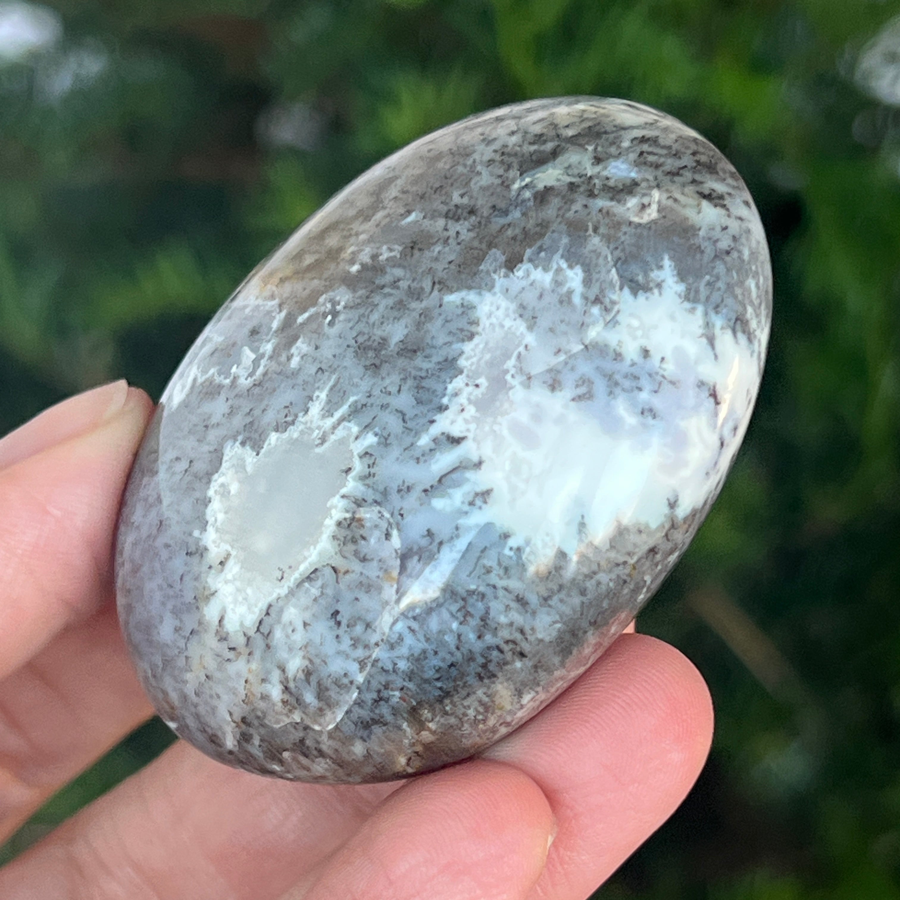 Този палмстоун от бял дендритен опал носи усещане за мир и леко разширение на съзнанието. Идеален за медитация, за моменти на размисъл или за съхранение като декоративен елемент в свещено пространство, той излъчва чиста и органична красота, баланс между бялата светлина и нежните сенки на природата.