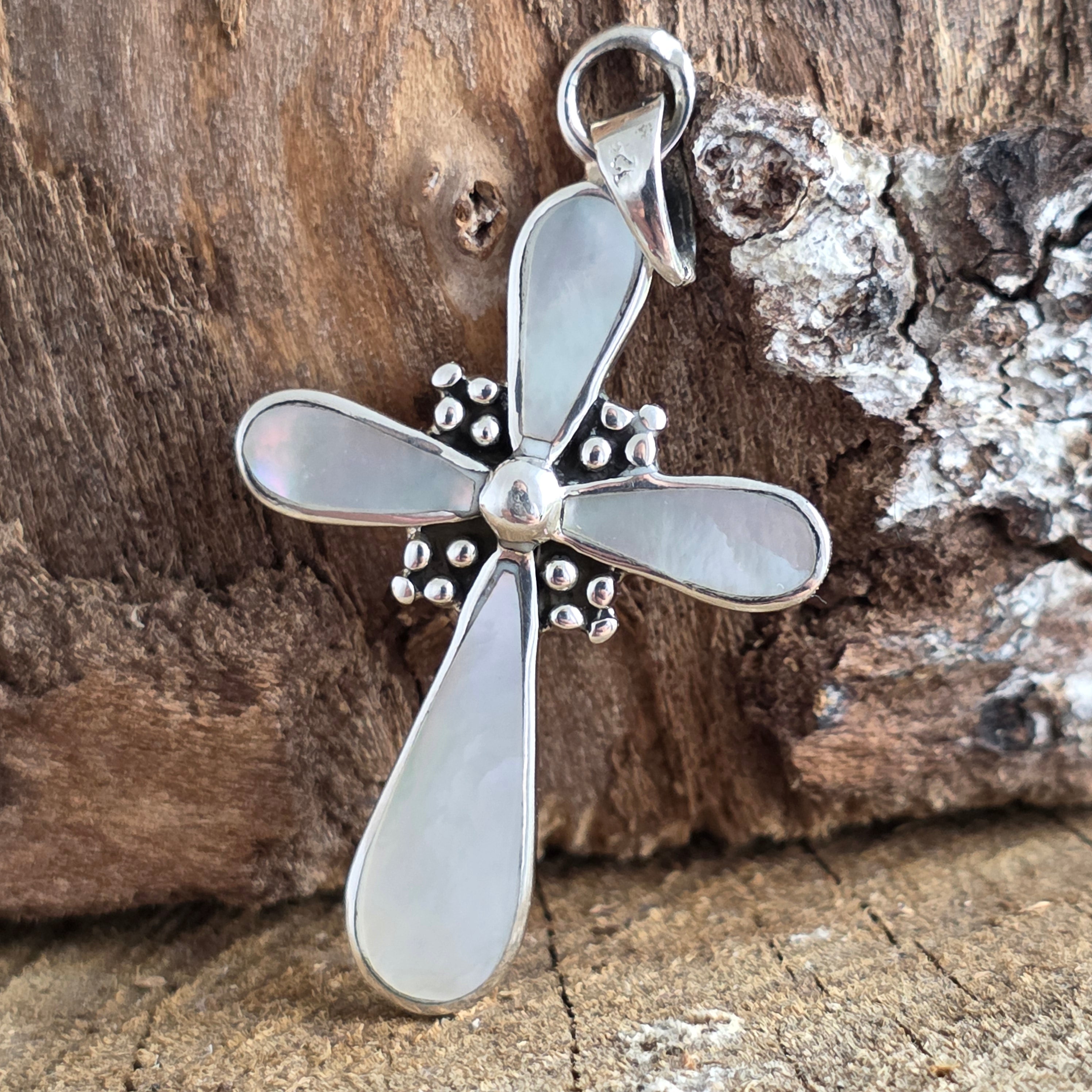 Класическата форма на кръста символизира защита, вяра и вътрешно равновесие, а простият обков с чисти линии подчертава органичната светлина на перлата.