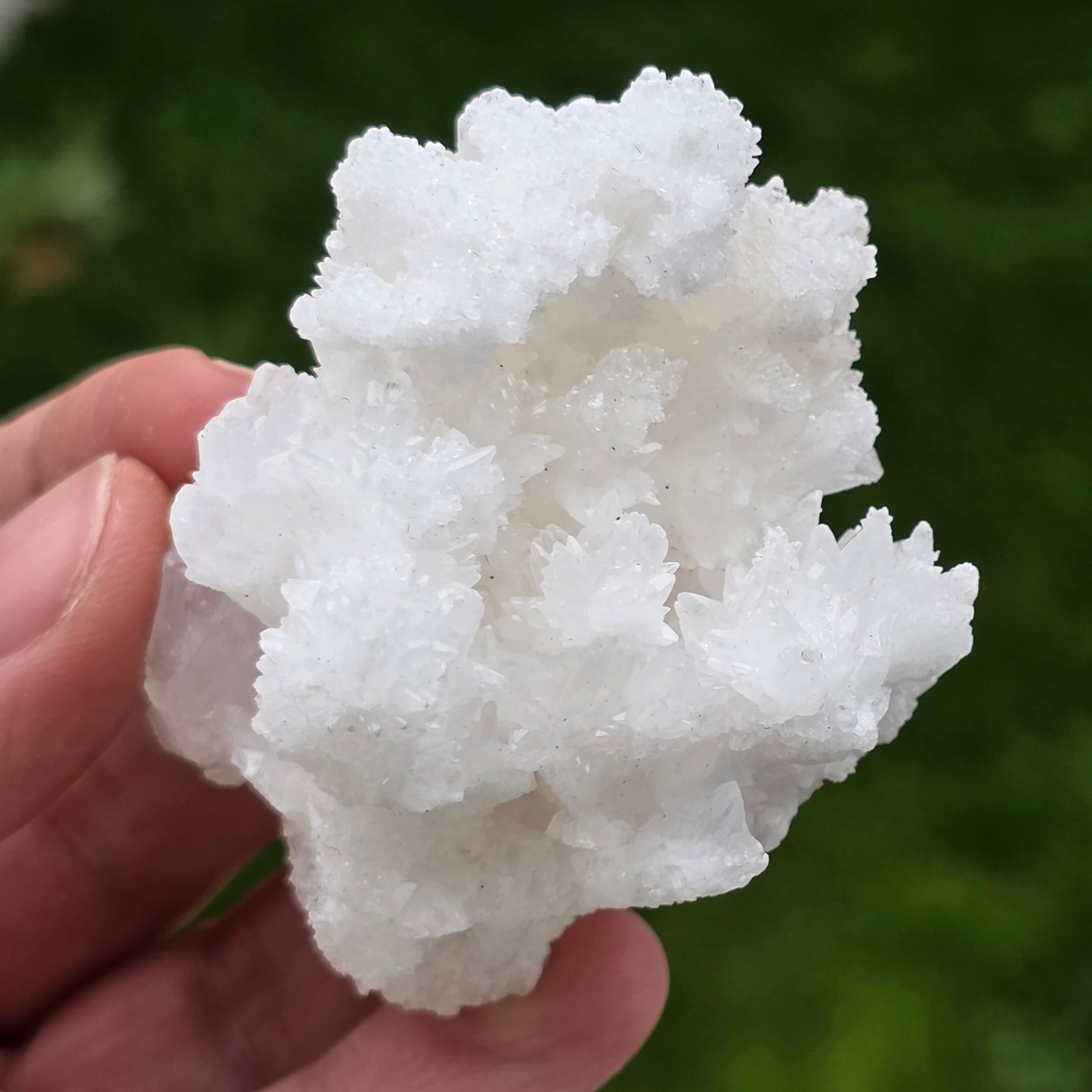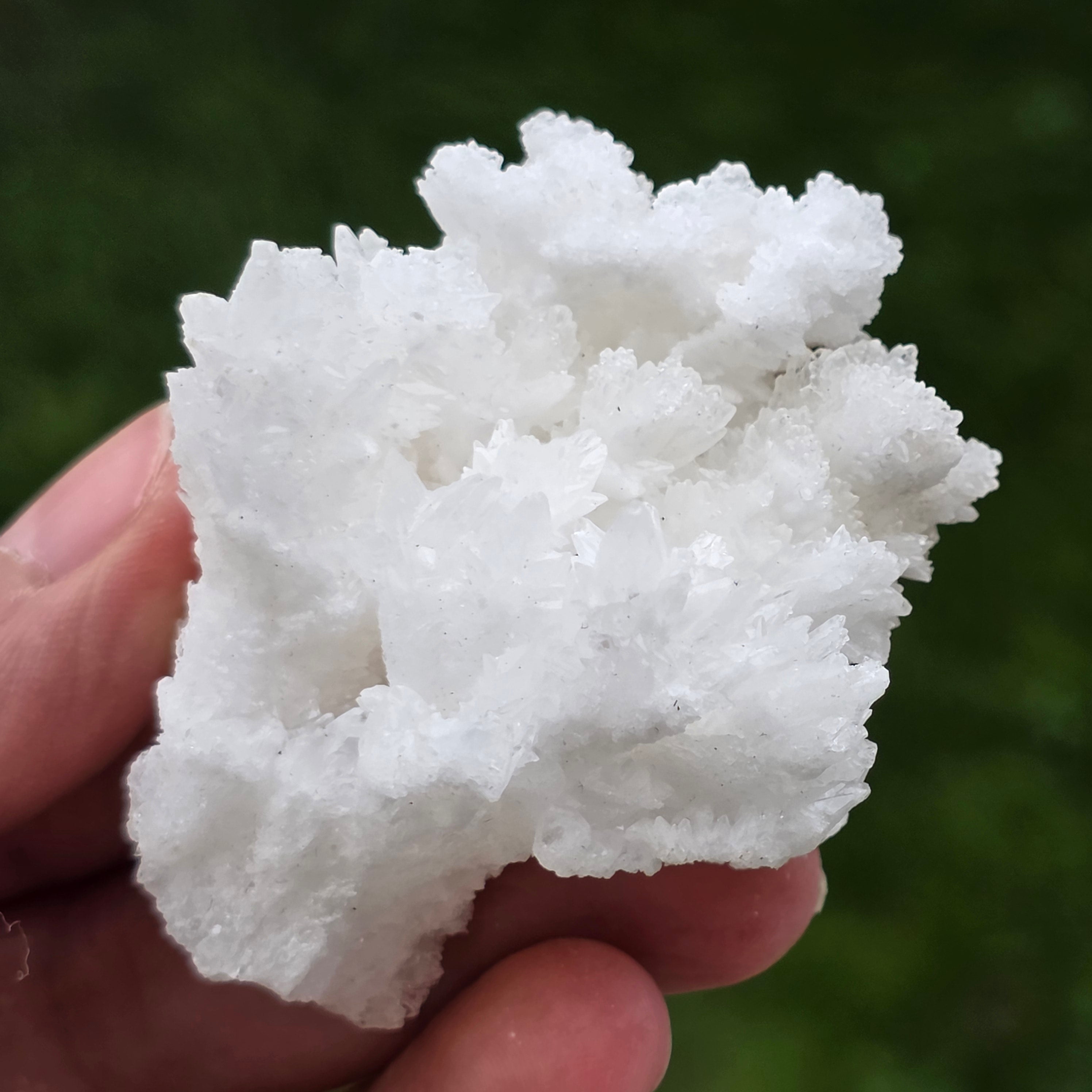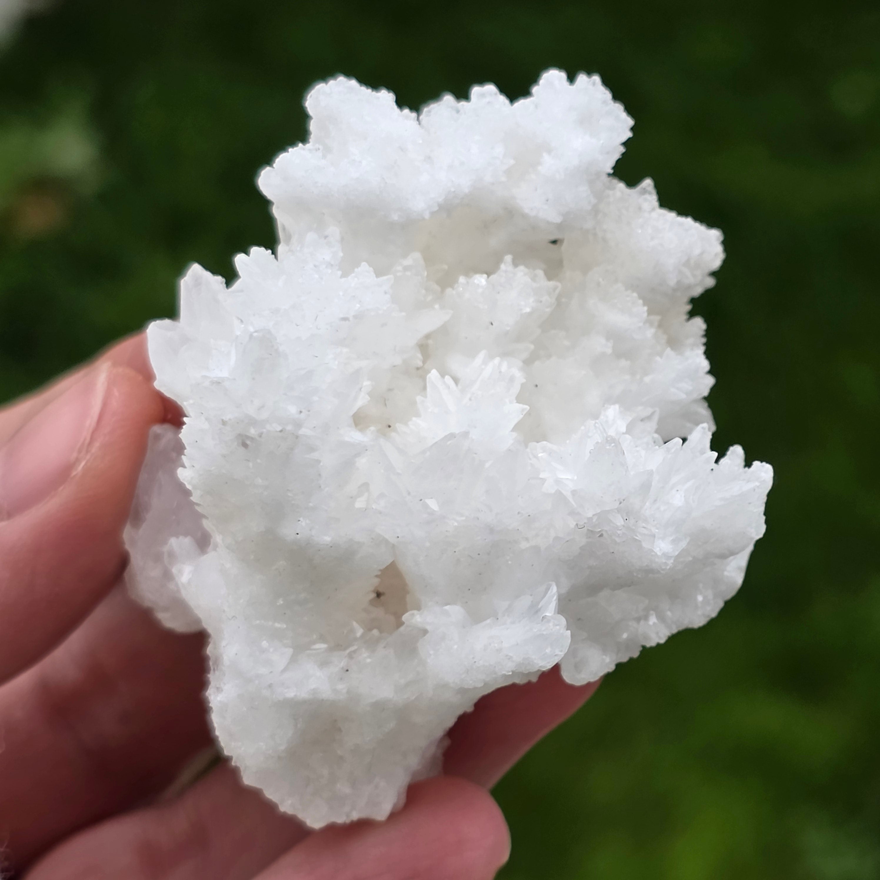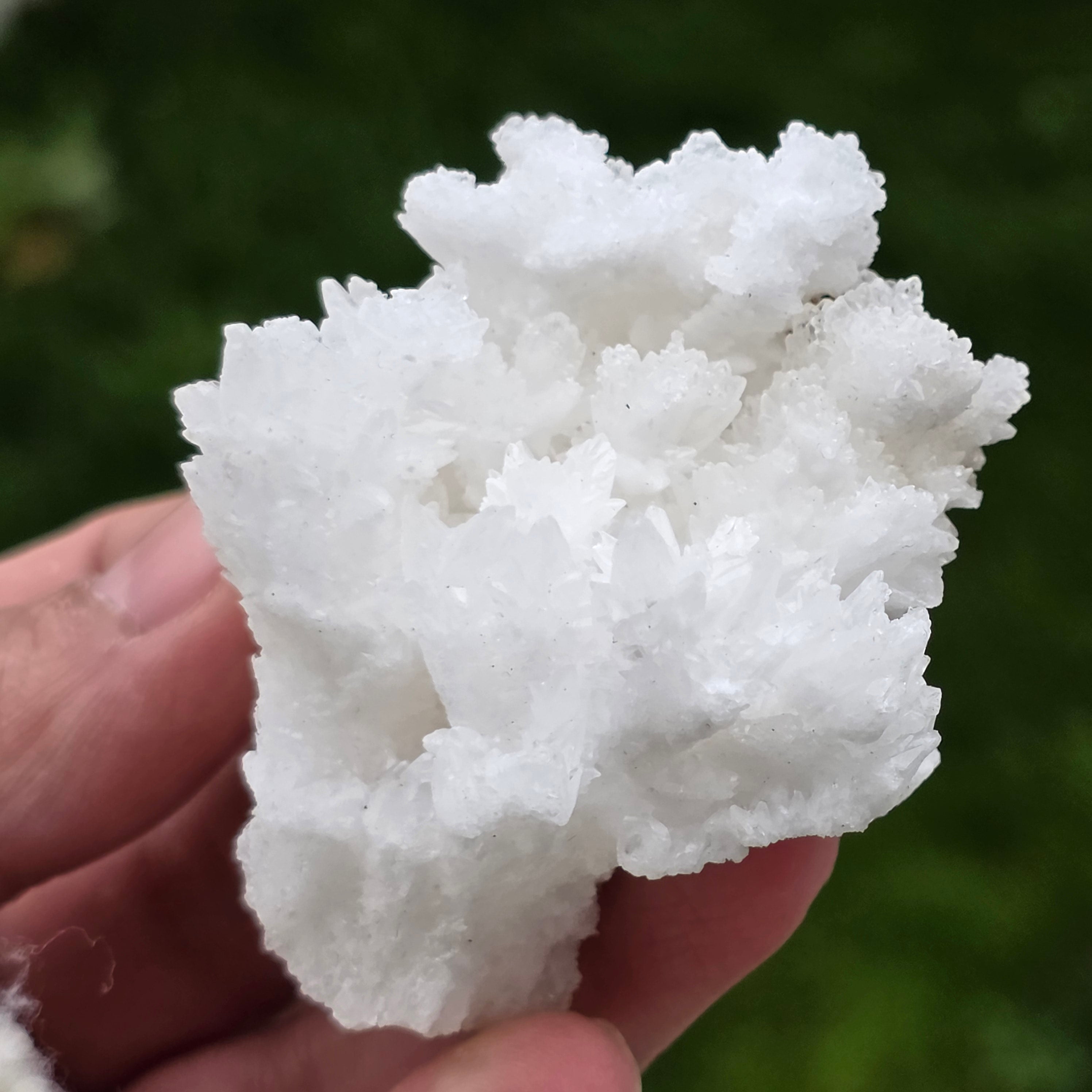 Този пещерен калцит (Cave Calcite) от Мексико е естествен минерален екземпляр, ценен заради своето органично, компактно и млечно-бяло излъчване, формиран от плътни агрегати от фини кристали. Екземплярите от този тип са резултат на бавни геоложки процеси, протичащи в подземни кухини, където стабилните условия позволяват развитие на тези хармонични естествени форми.