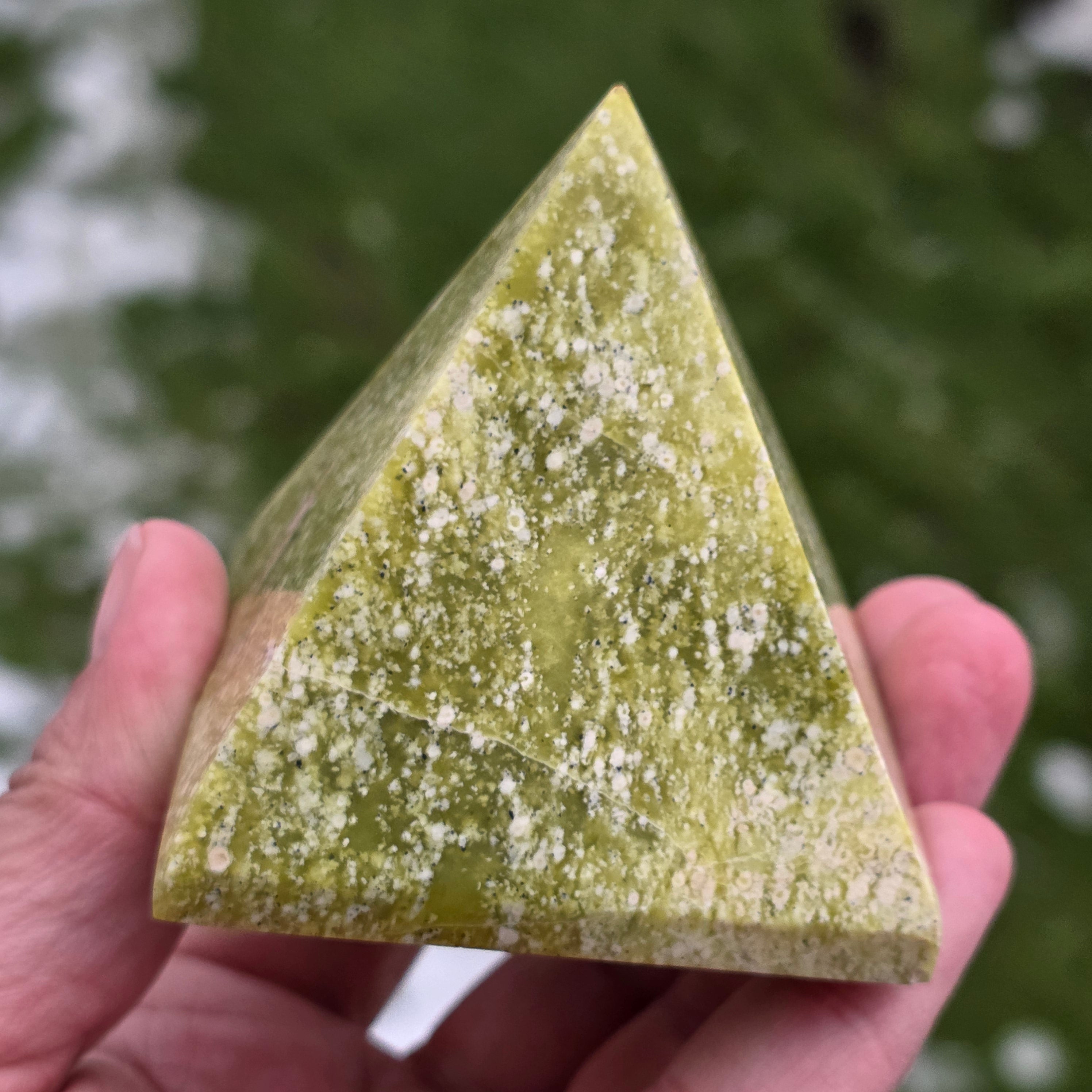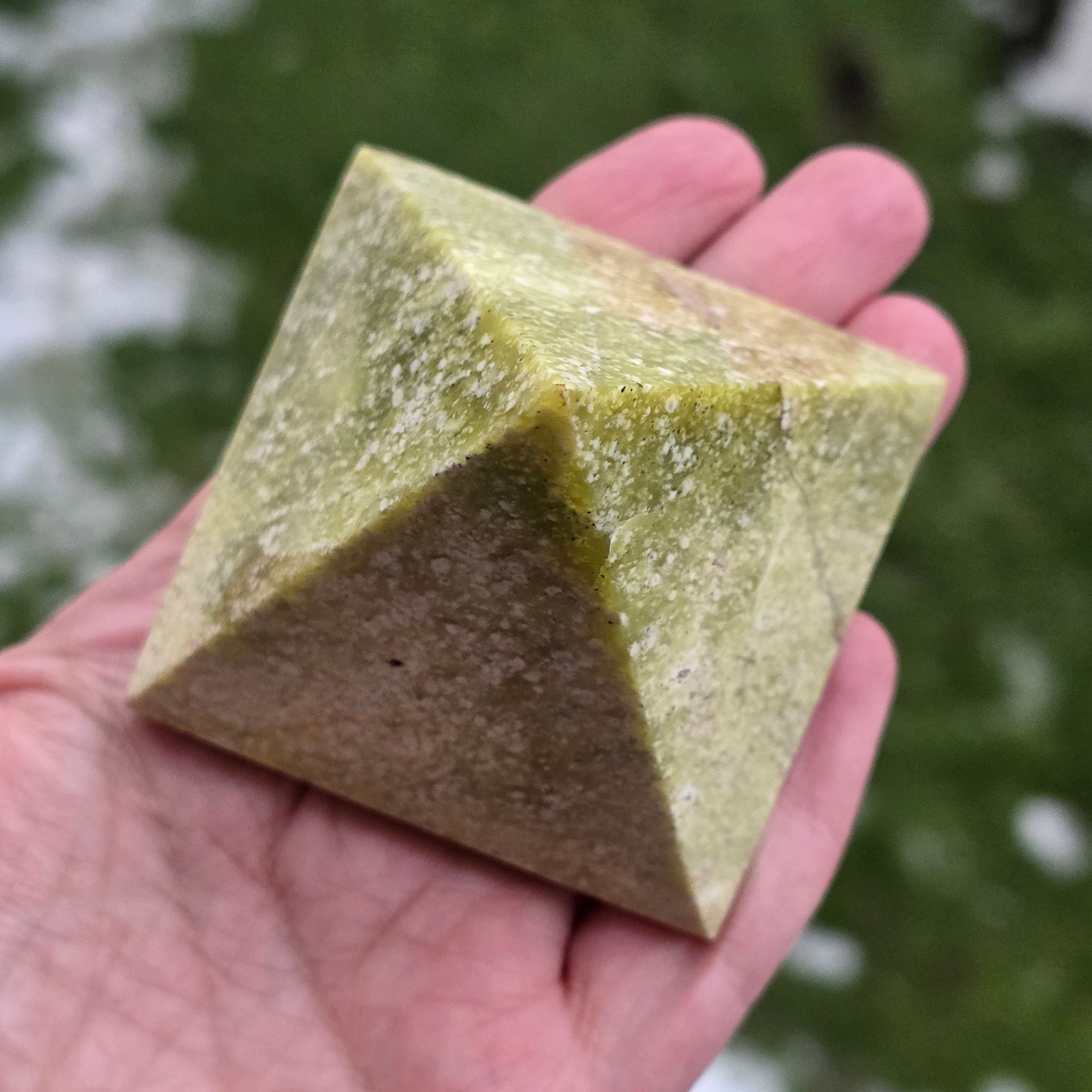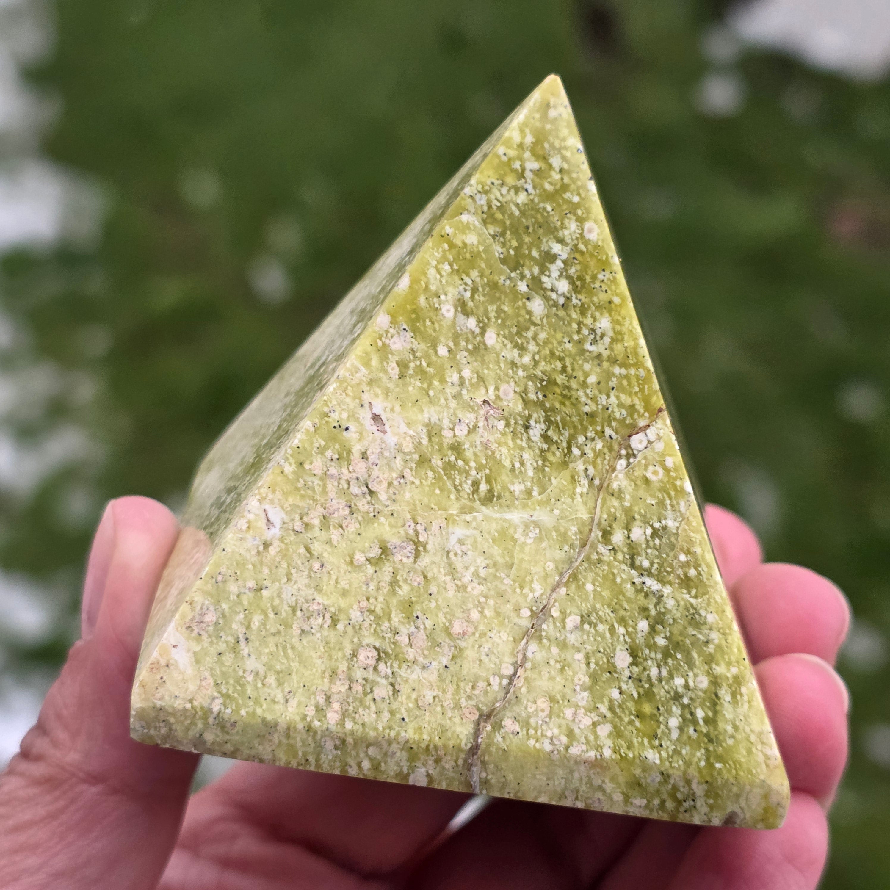 Тази пирамида от естествен жълт серпентин е светъл и балансиращ елемент, подходящ за медитационни пространства, офиси или зони за вътрешно възстановяване. Жълтият серпентин е свързан с възстановяване на енергията, умствена яснота и подпомагане на емоционалното равновесие. Пирамидалната форма помага за концентриране и стабилизиране на енергията, превръщайки този елемент във фин поддържащ фокус, хармония и повторно свързване.