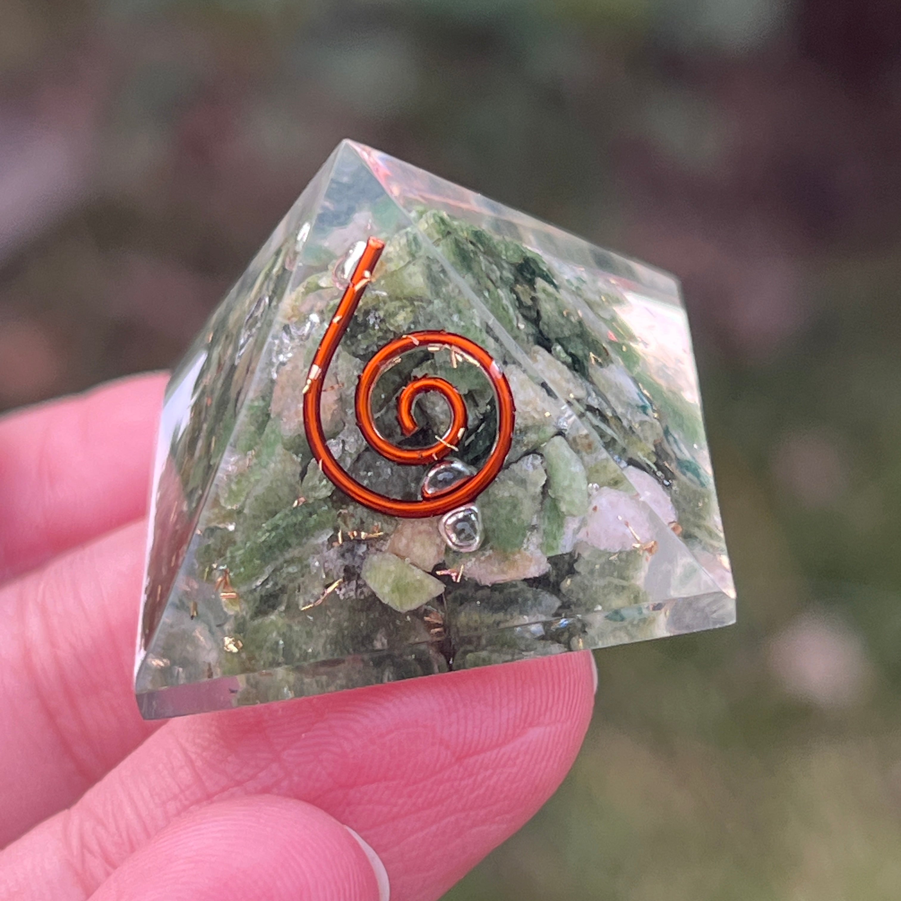 Ревюта – Пирамида от зелен кварц в смола 3 см