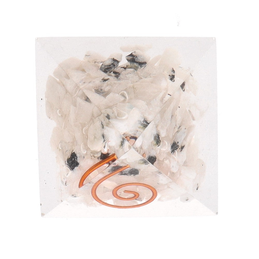 Пирамидата от лунен камък в смола впечатлява с перлените си отблясъци, които сякаш носят светлината на луната в ръцете ви.