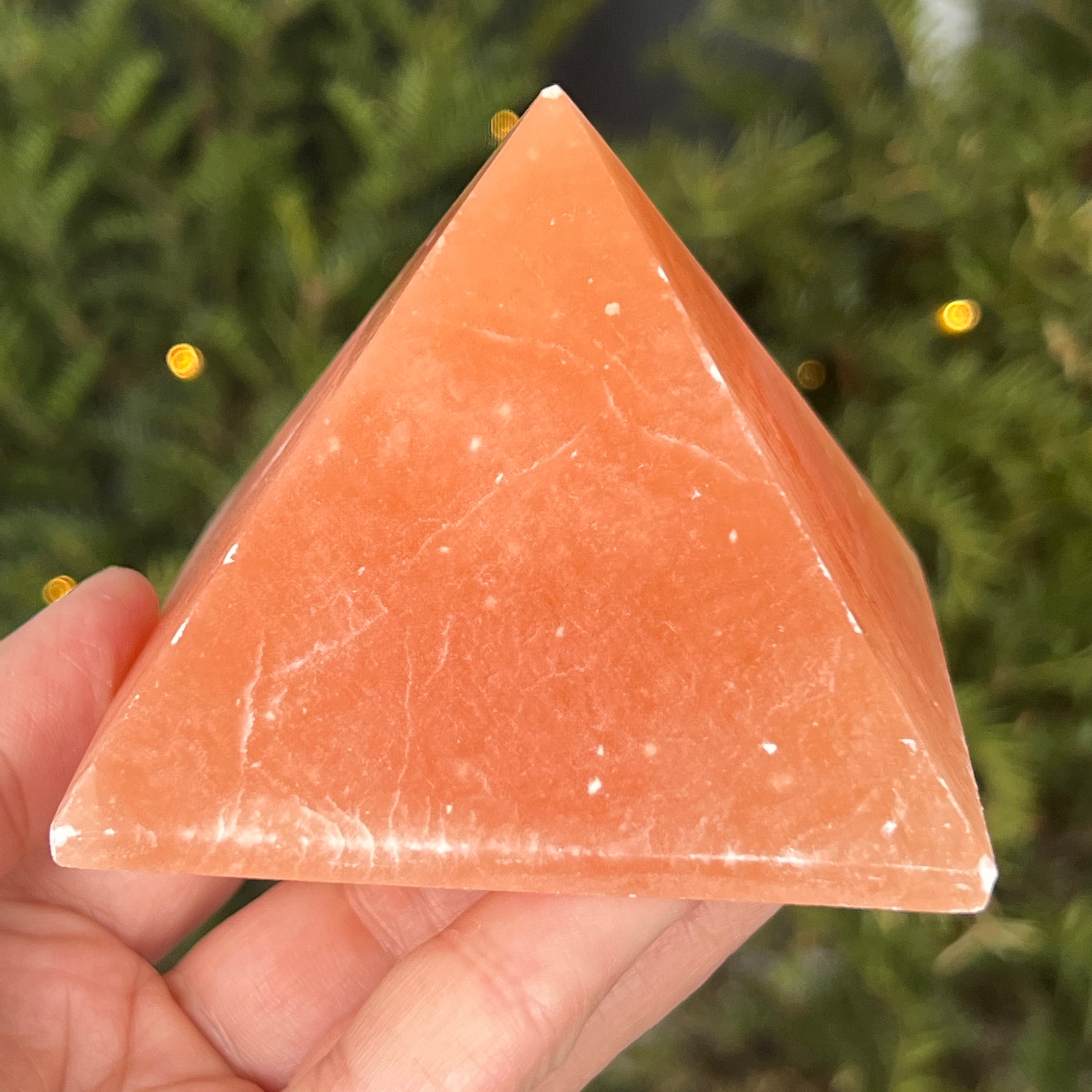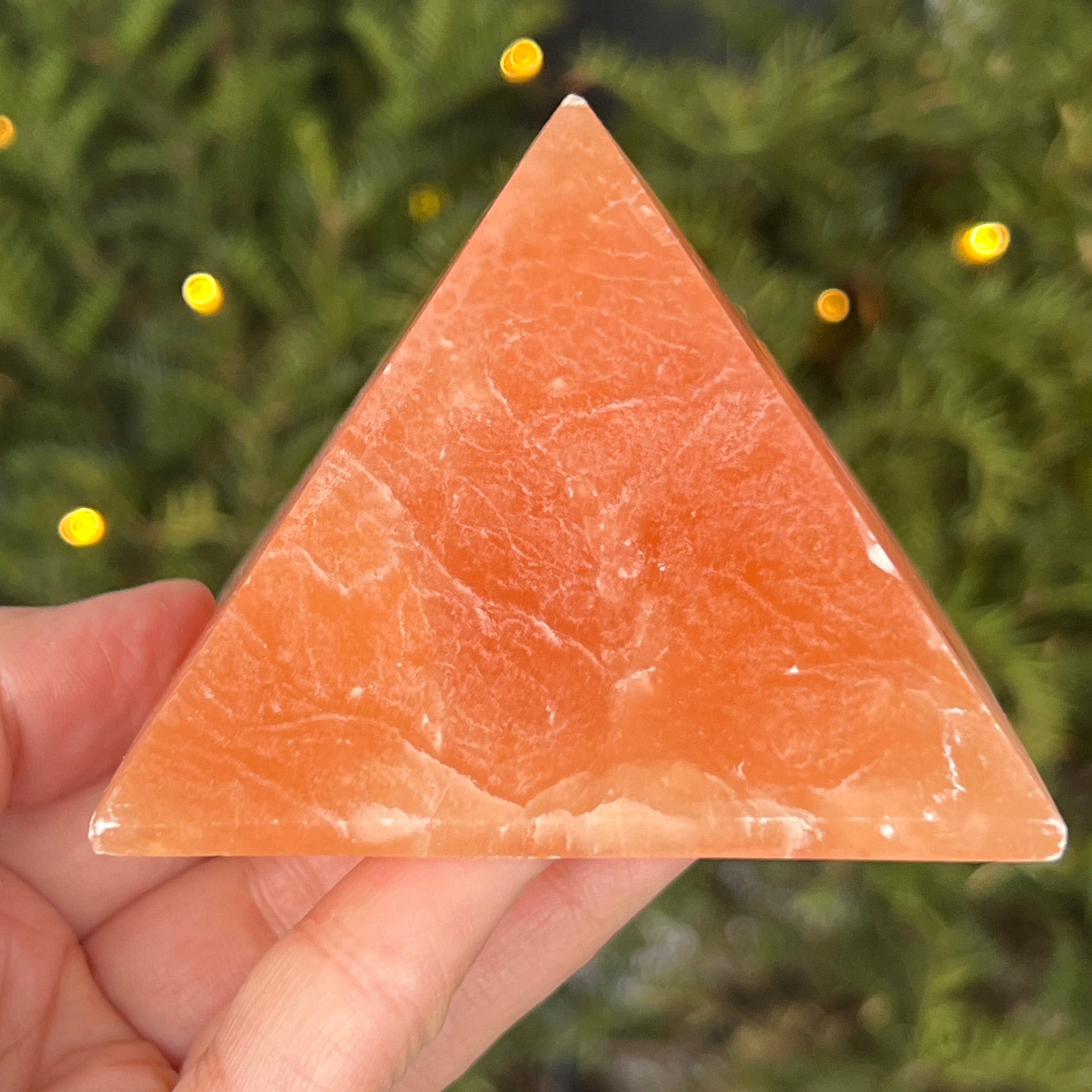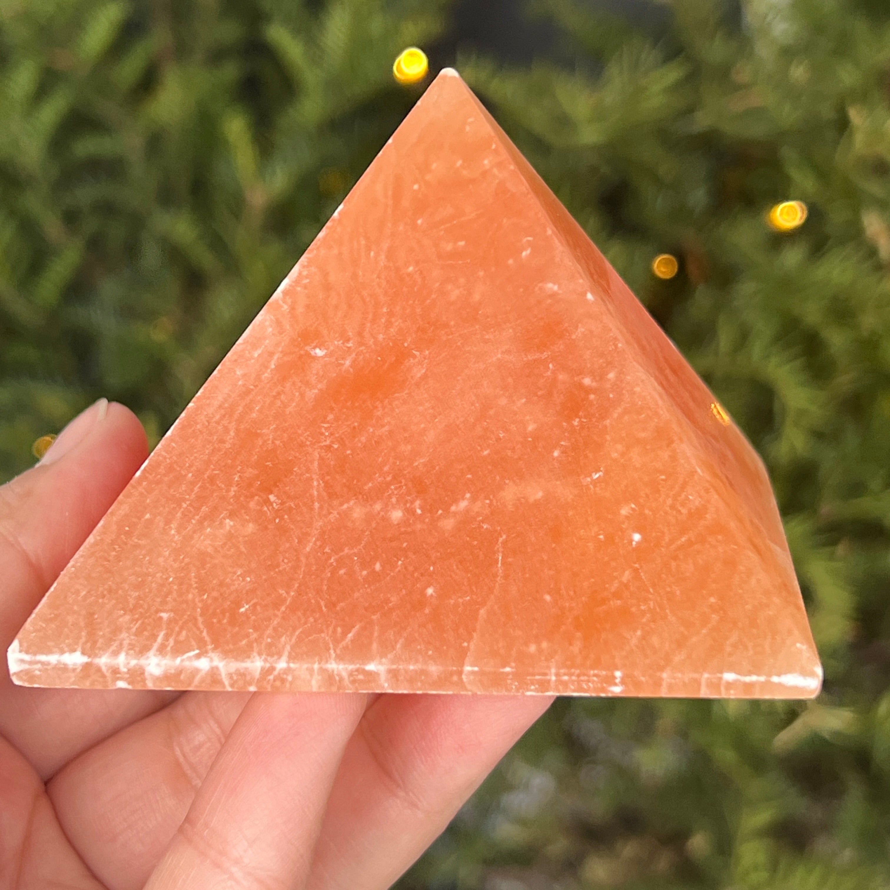 Пирамида, която изглежда издялана от слънчева светлина. Тази парче натурален оранжев калцитизлъчва мека топлина, с нюанси, вариращи от медено оранжево до полупрозрачно златисто. Нейната гладка, кадифена на допир текстура улавя светлината и я отразява с жизнена блясък, носещ радост и свежест във всяко пространство.