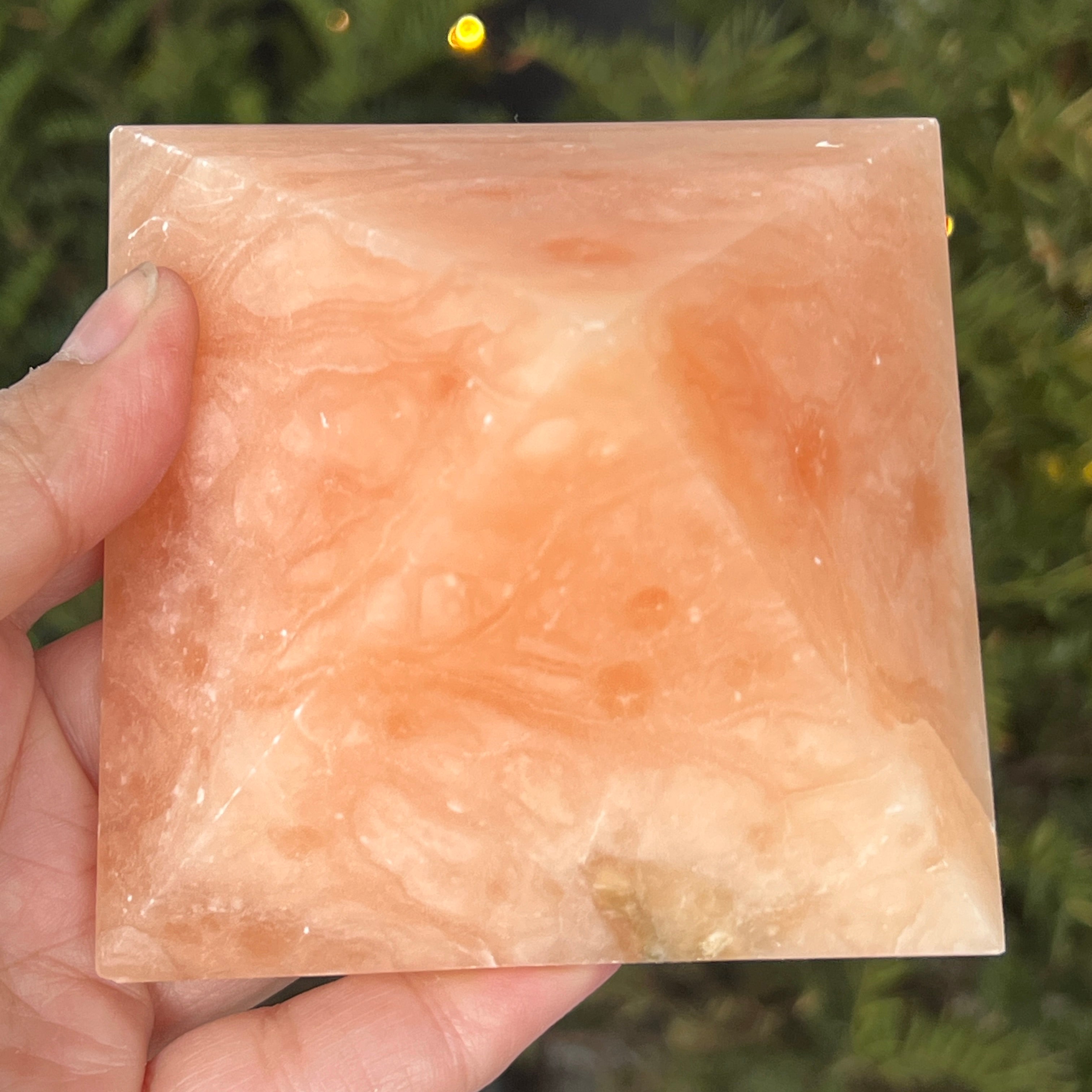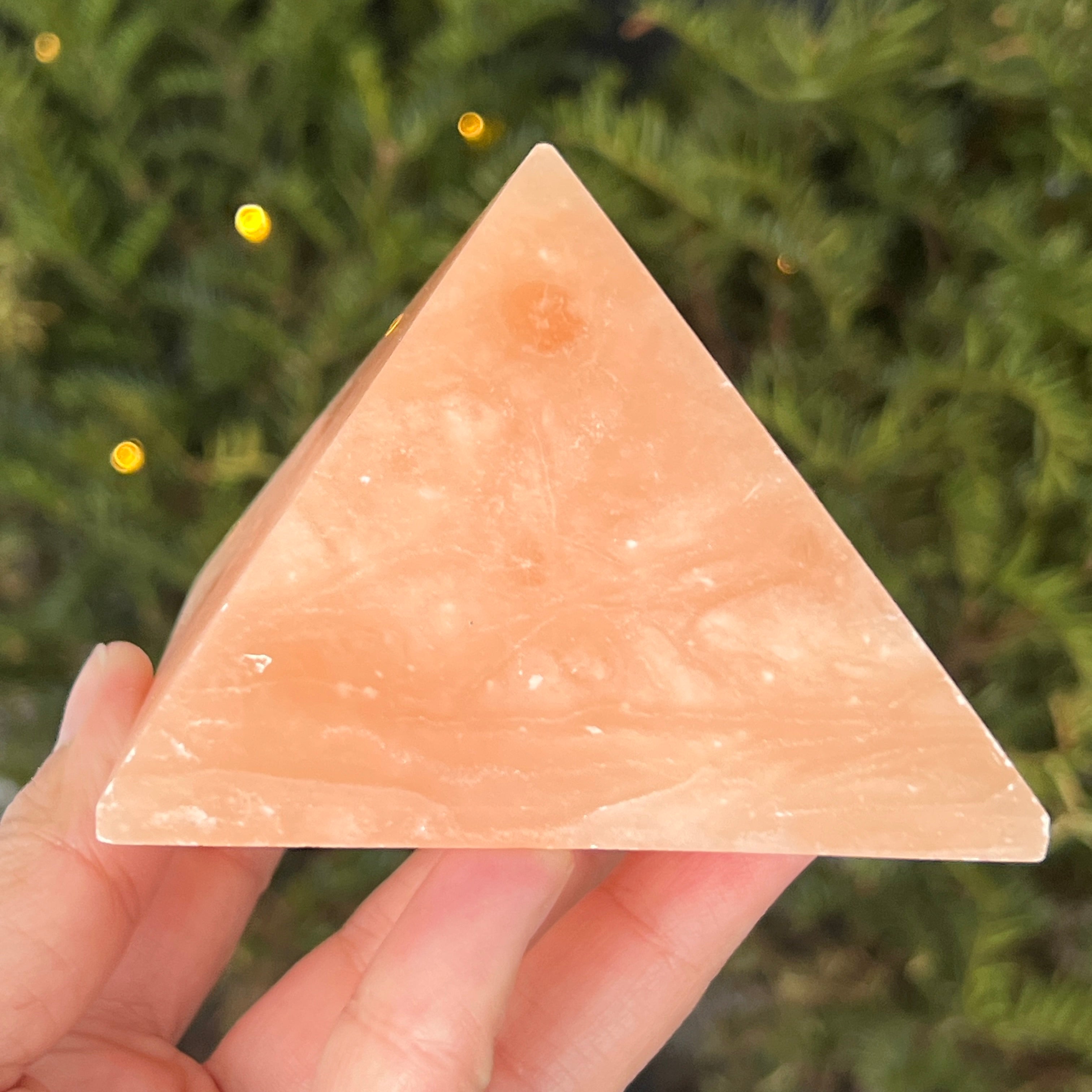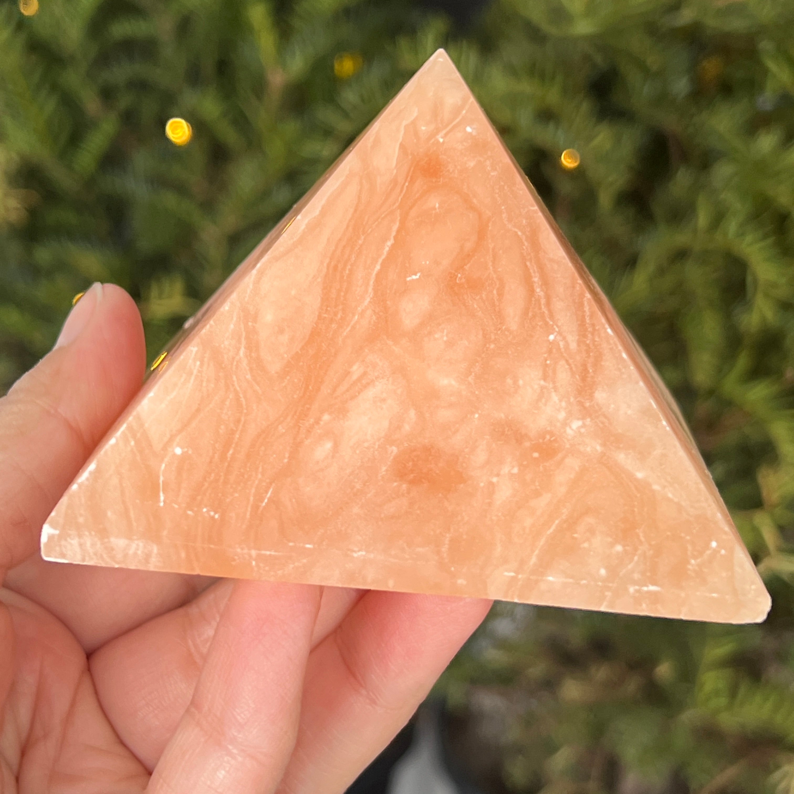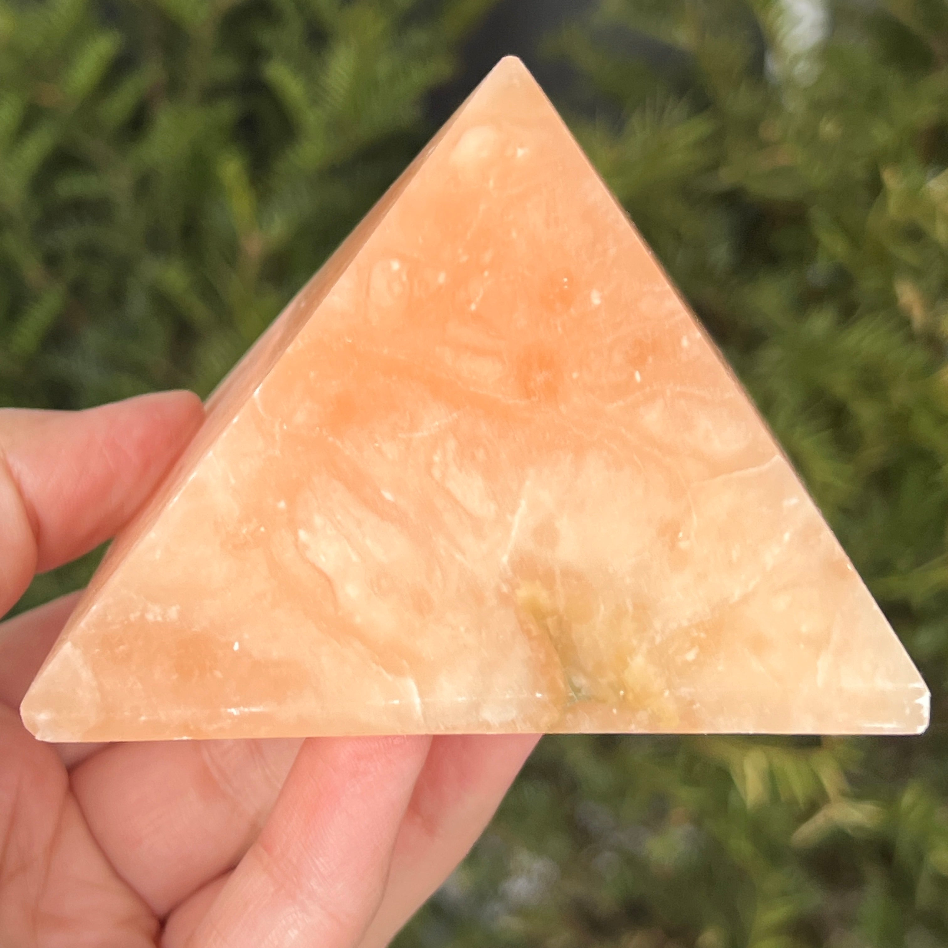 Пирамида, която изглежда издялана от слънчева светлина. Тази парче натурален оранжев калцитизлъчва мека топлина, с нюанси, вариращи от медено оранжево до полупрозрачно златисто. Нейната гладка, кадифена на допир текстура улавя светлината и я отразява с жизнена блясък, носещ радост и свежест във всяко пространство.