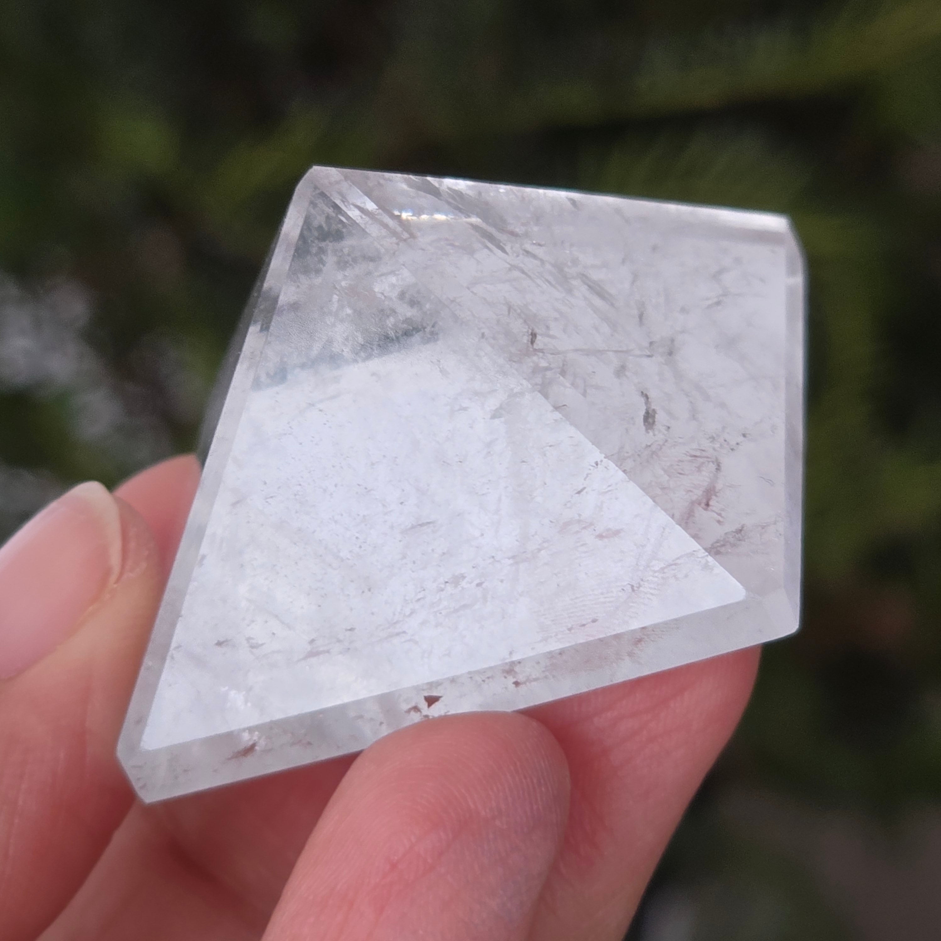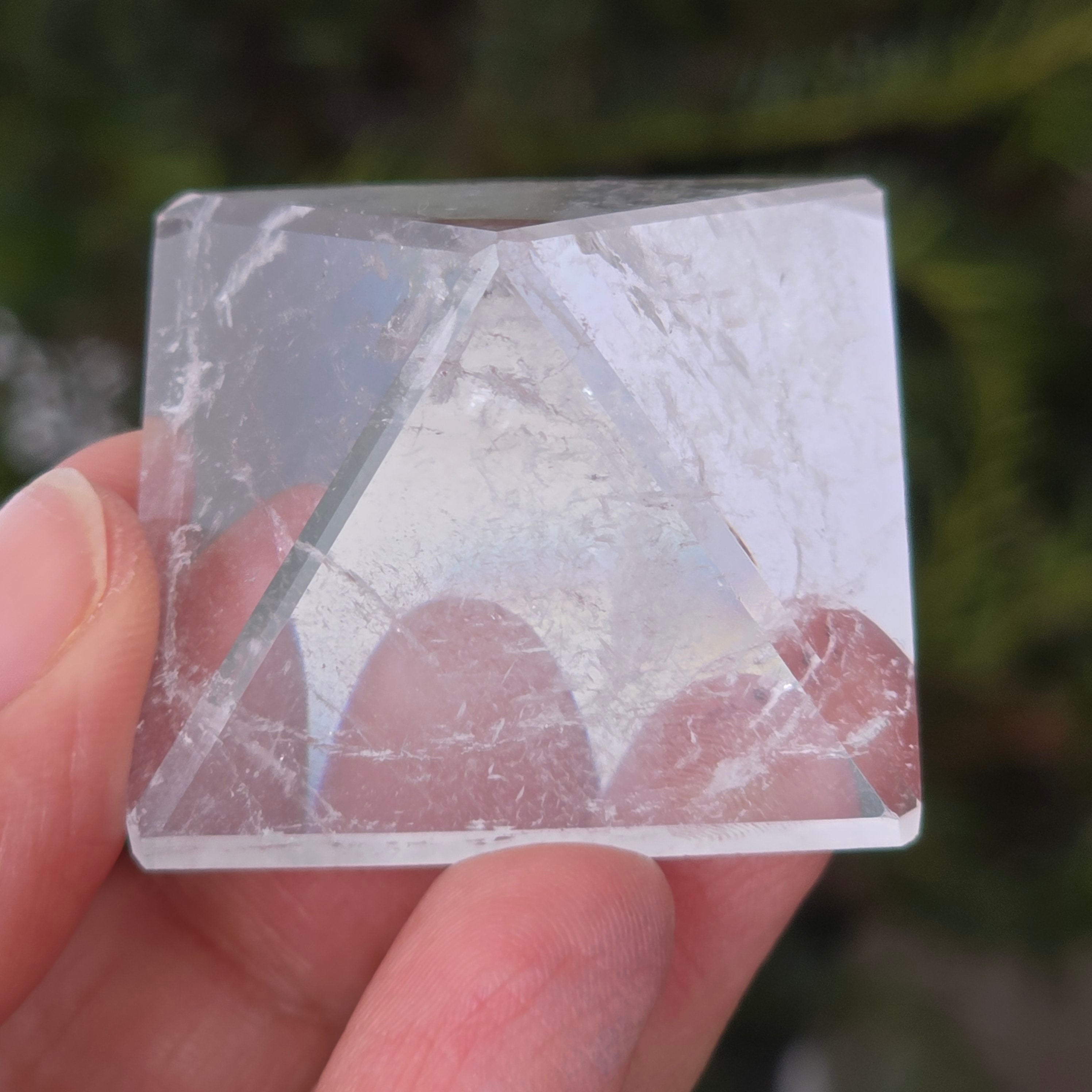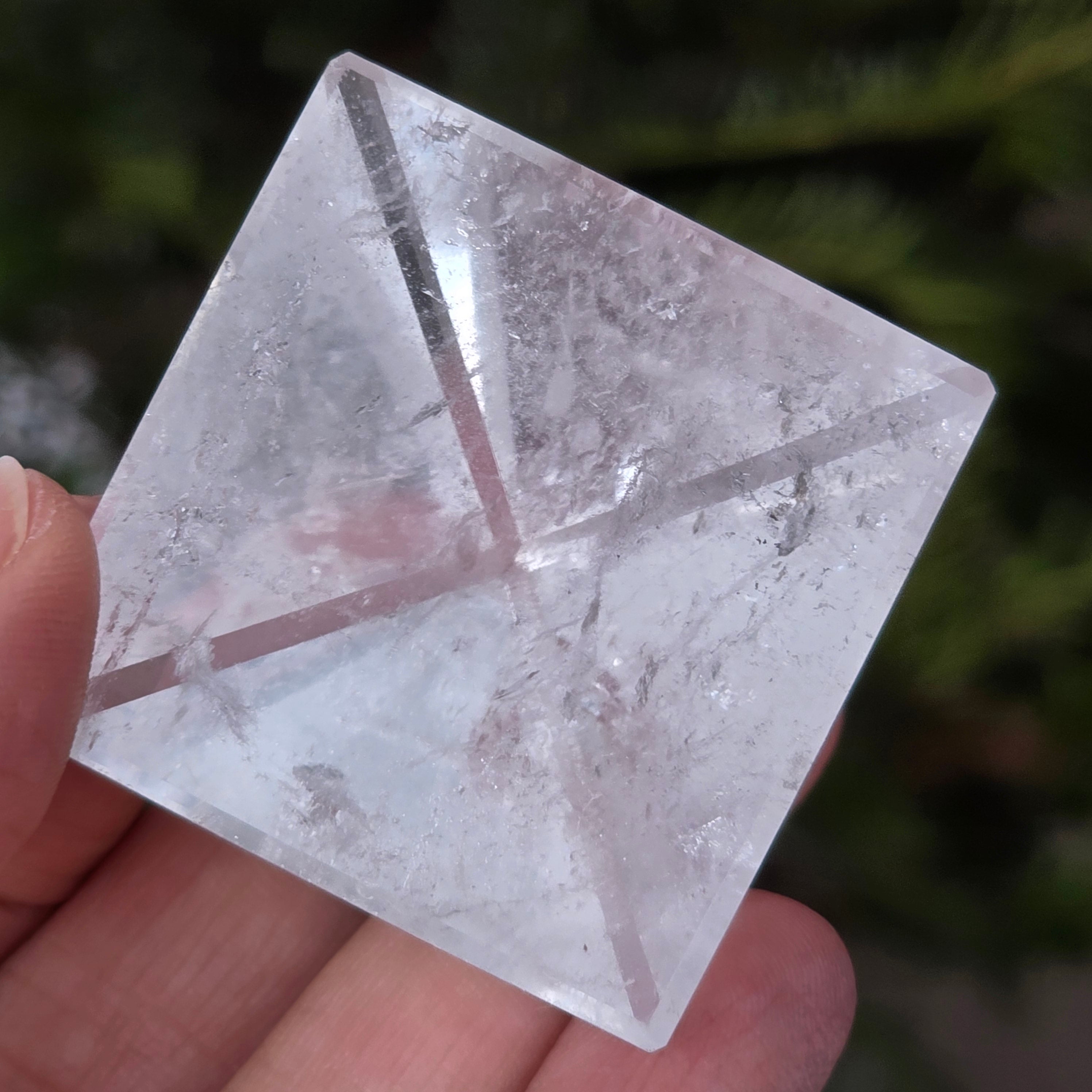 Пирамидата от безцветен кварц се свързва с яснота, засилване на намерението и енергийно равновесие, като формата ѝ концентрира и насочва енергията по подреден начин. Често се използва като символ на ясния ум и хармонията между мисълта, емоцията и действието.