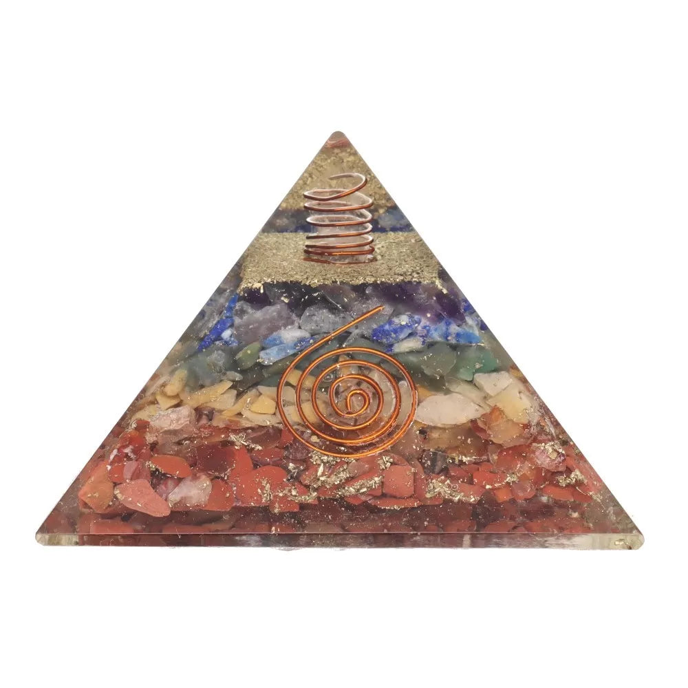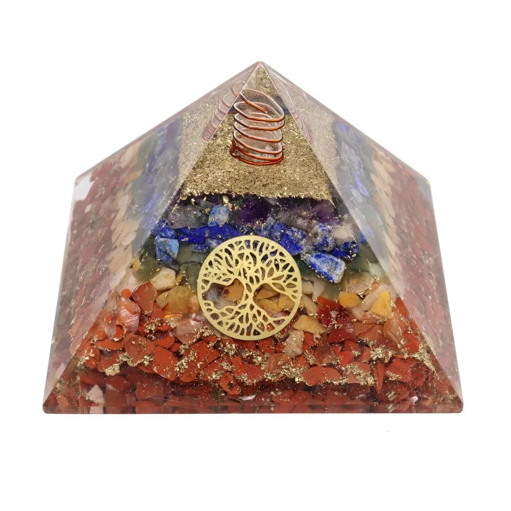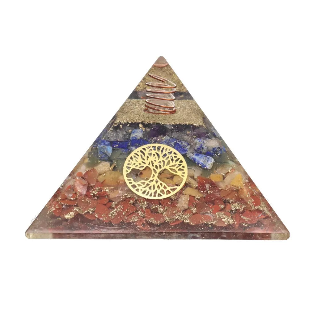 Пирамидата 7 чакри от смола с сакралния символ на Дървото на живота обединява хармонията на седемте полускъпоценни камъка, свързани с енергийните центрове на тялото.