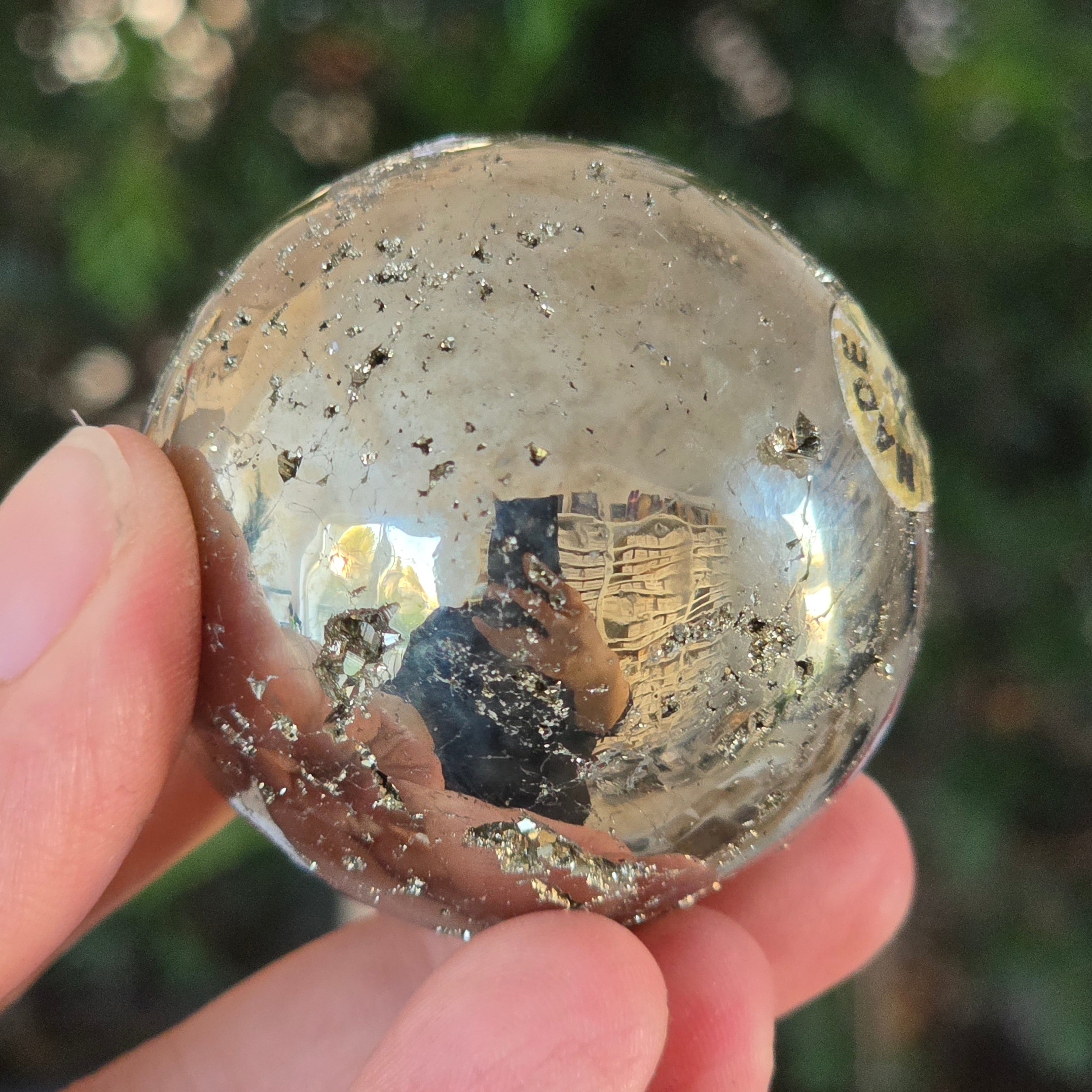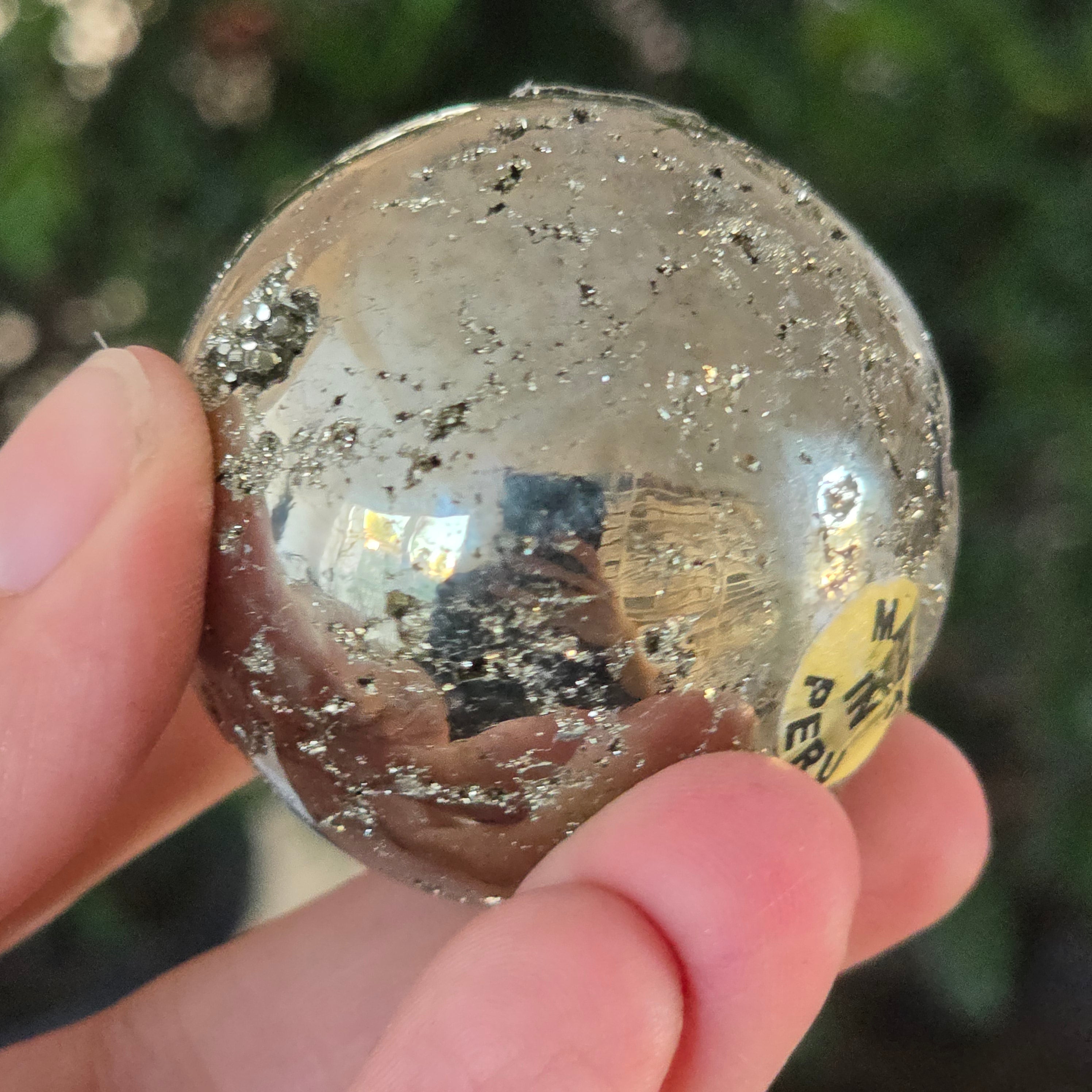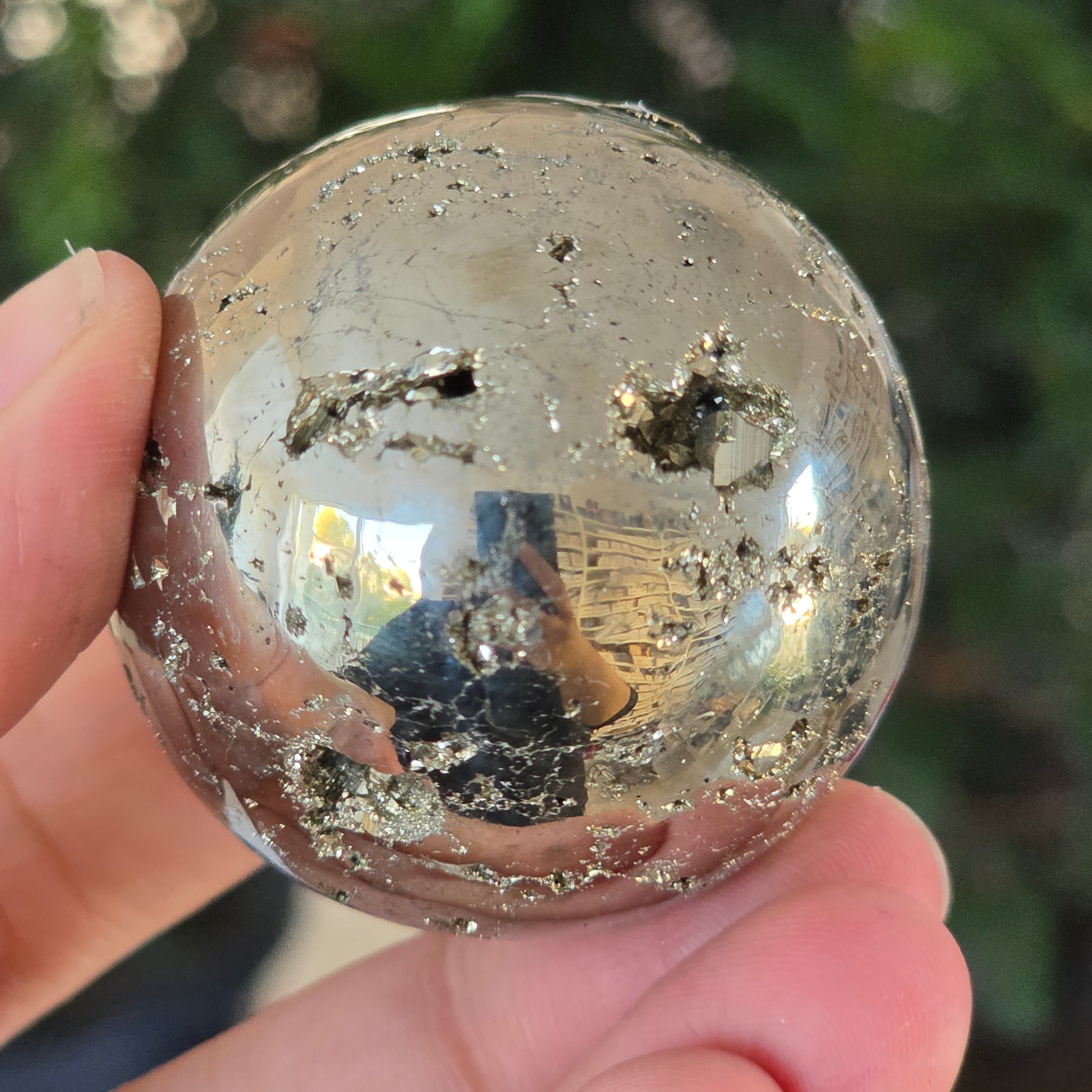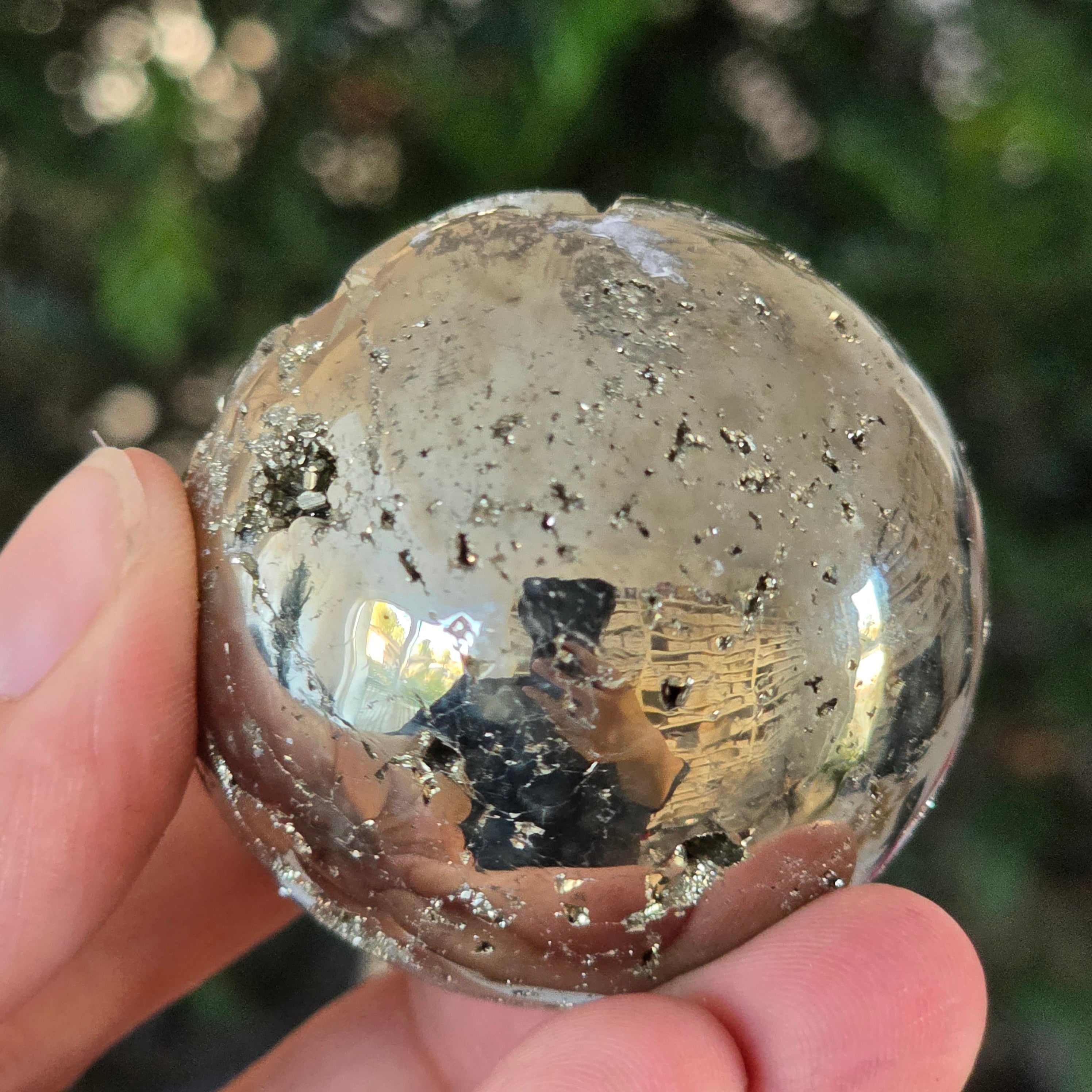 Пиринтната сфера перуански пирит излъчва сила, изобилие и ментална яснота. Всеки златист отблясък напомня за светлината на съзнанието и вътрешната сила, която превръща намеренията в реалност. Спектакуларен предмет, подходящ както за колекционери, така и като декоративен обект с жизнена енергия.