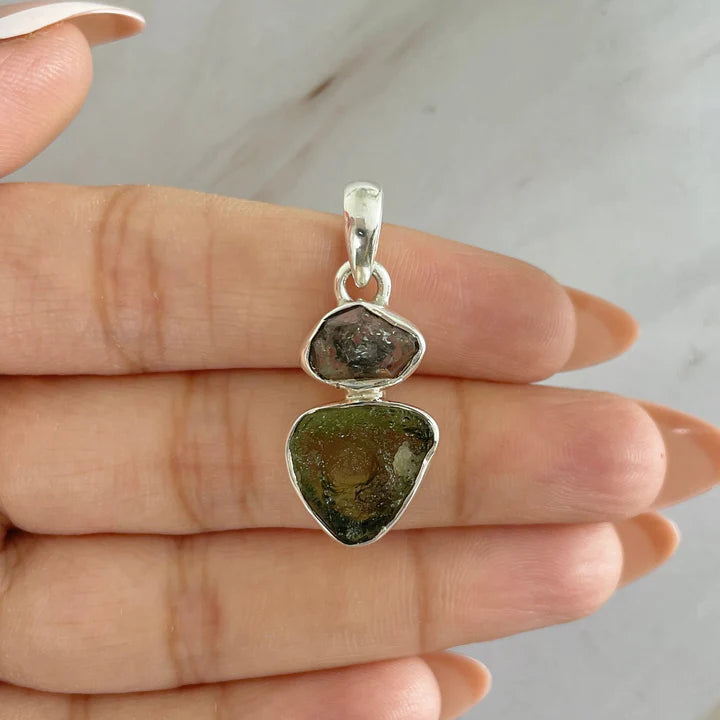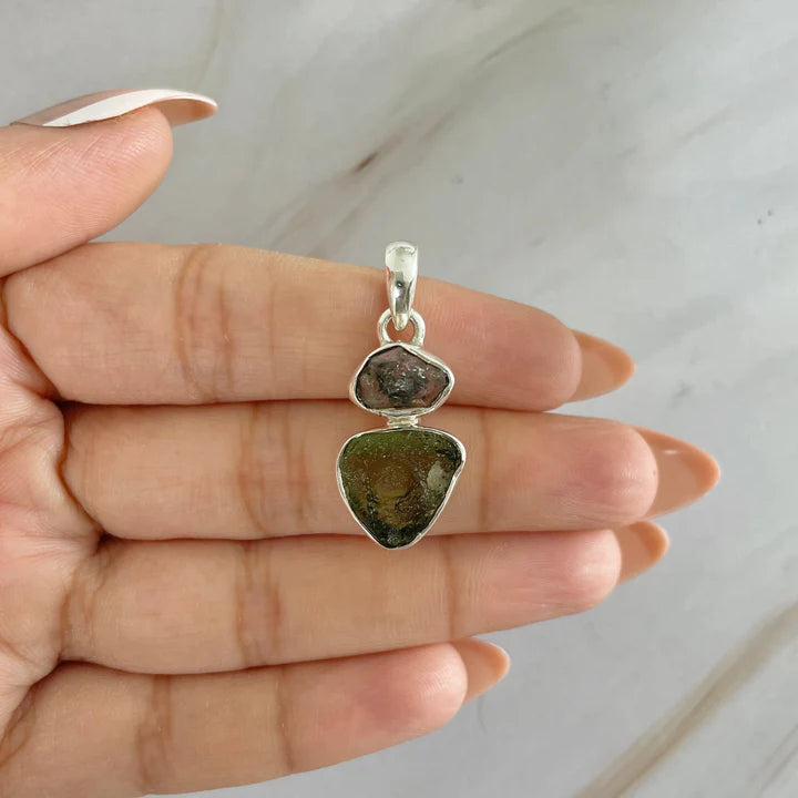 Основен камък 1: Натурален суров молдавит (зелен, неправилна органична форма)