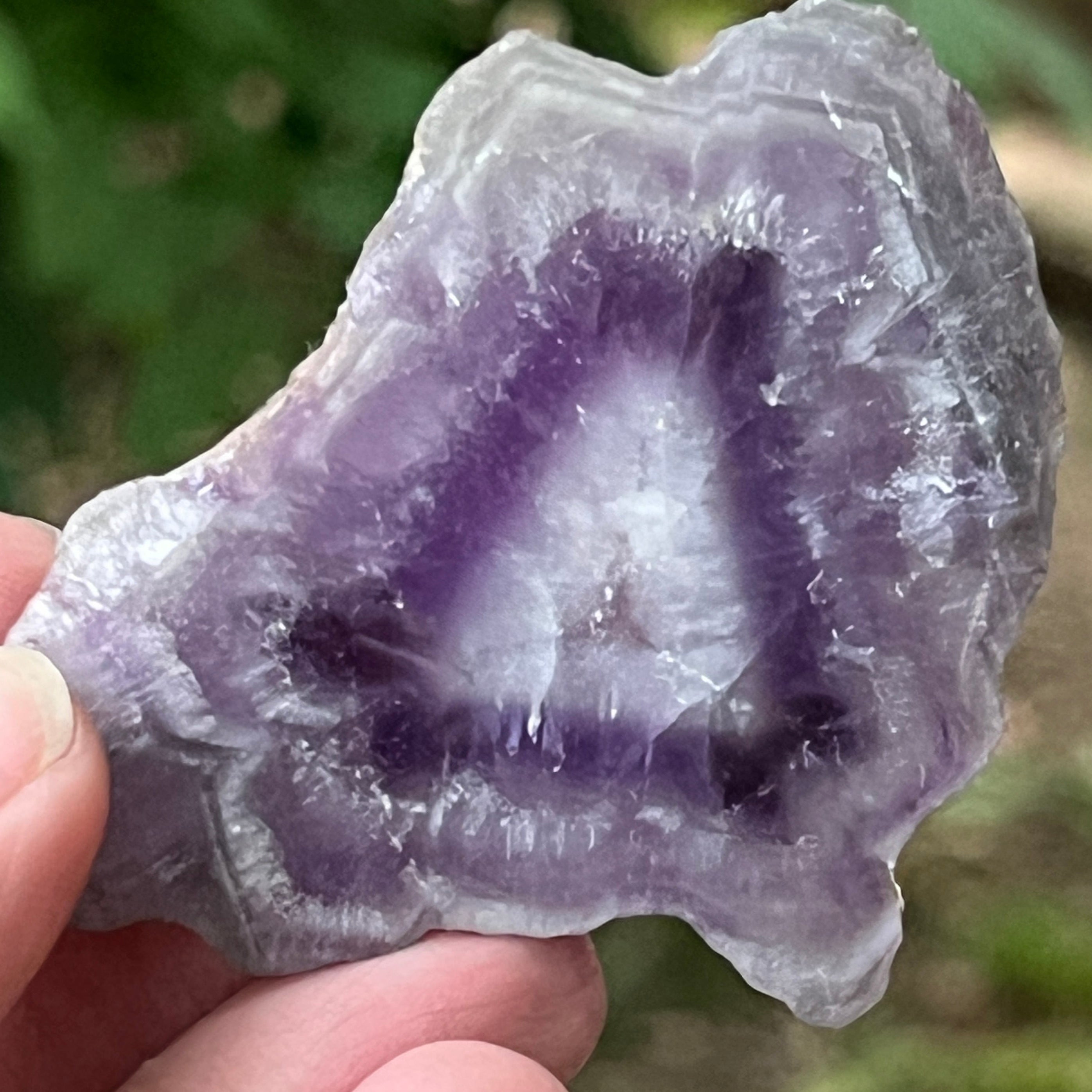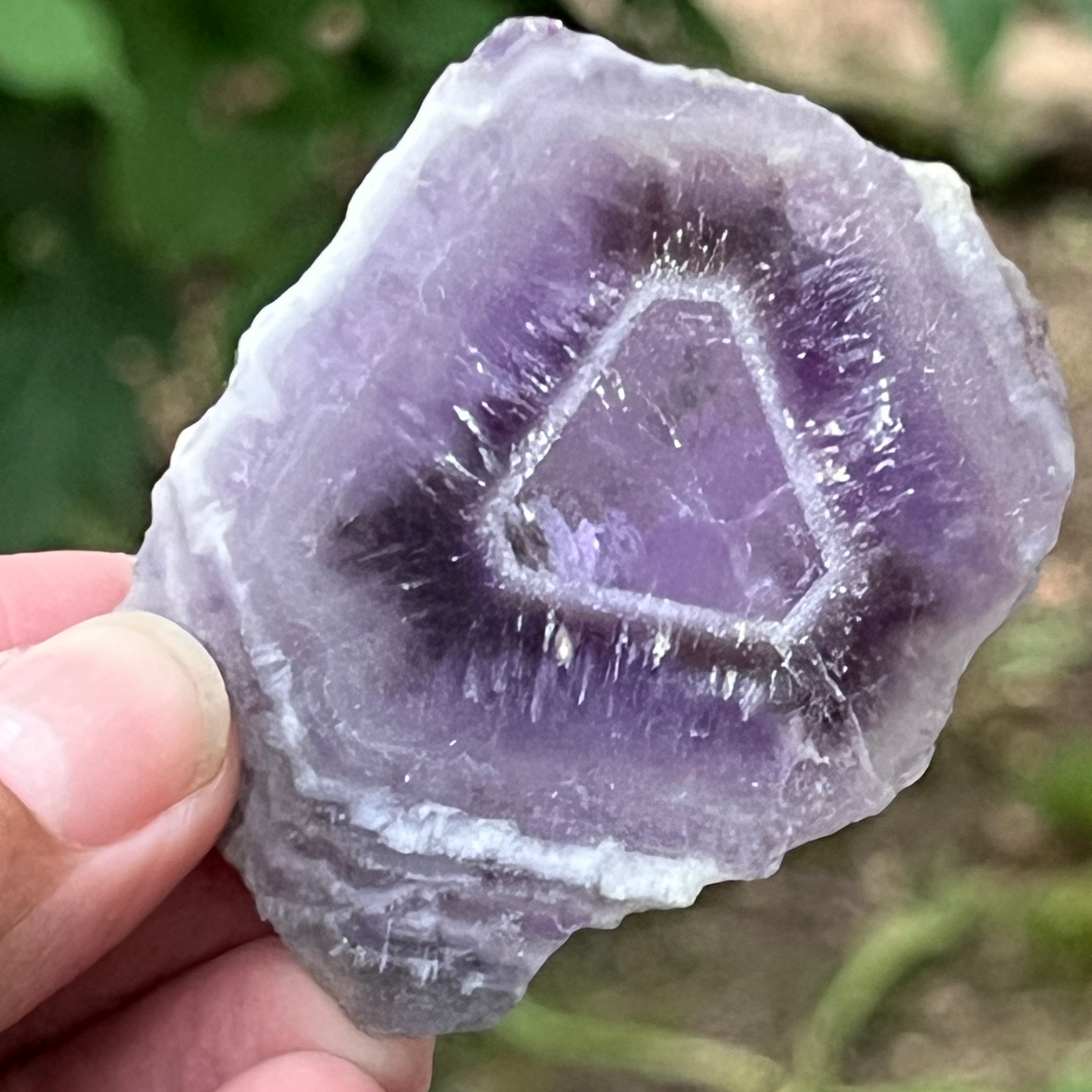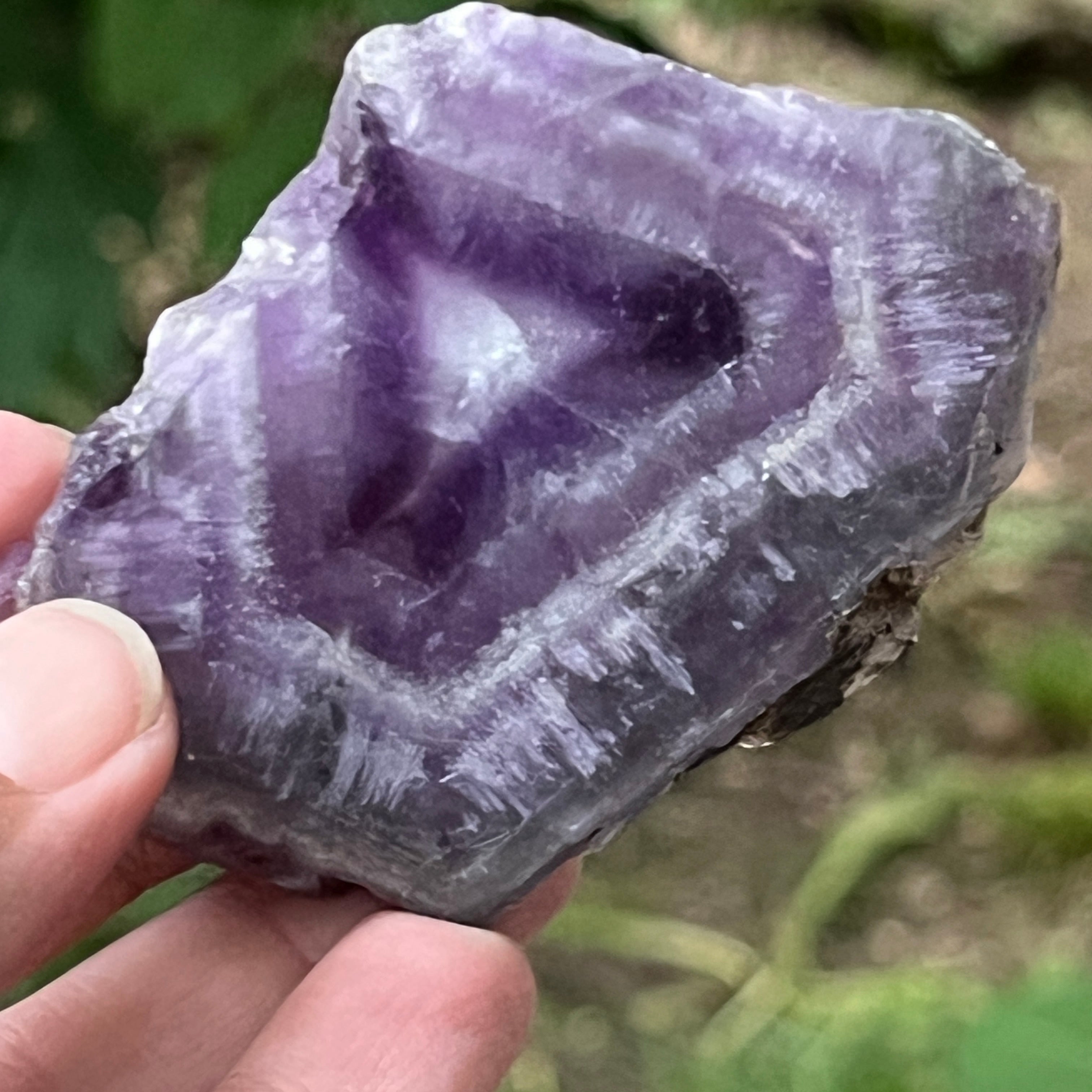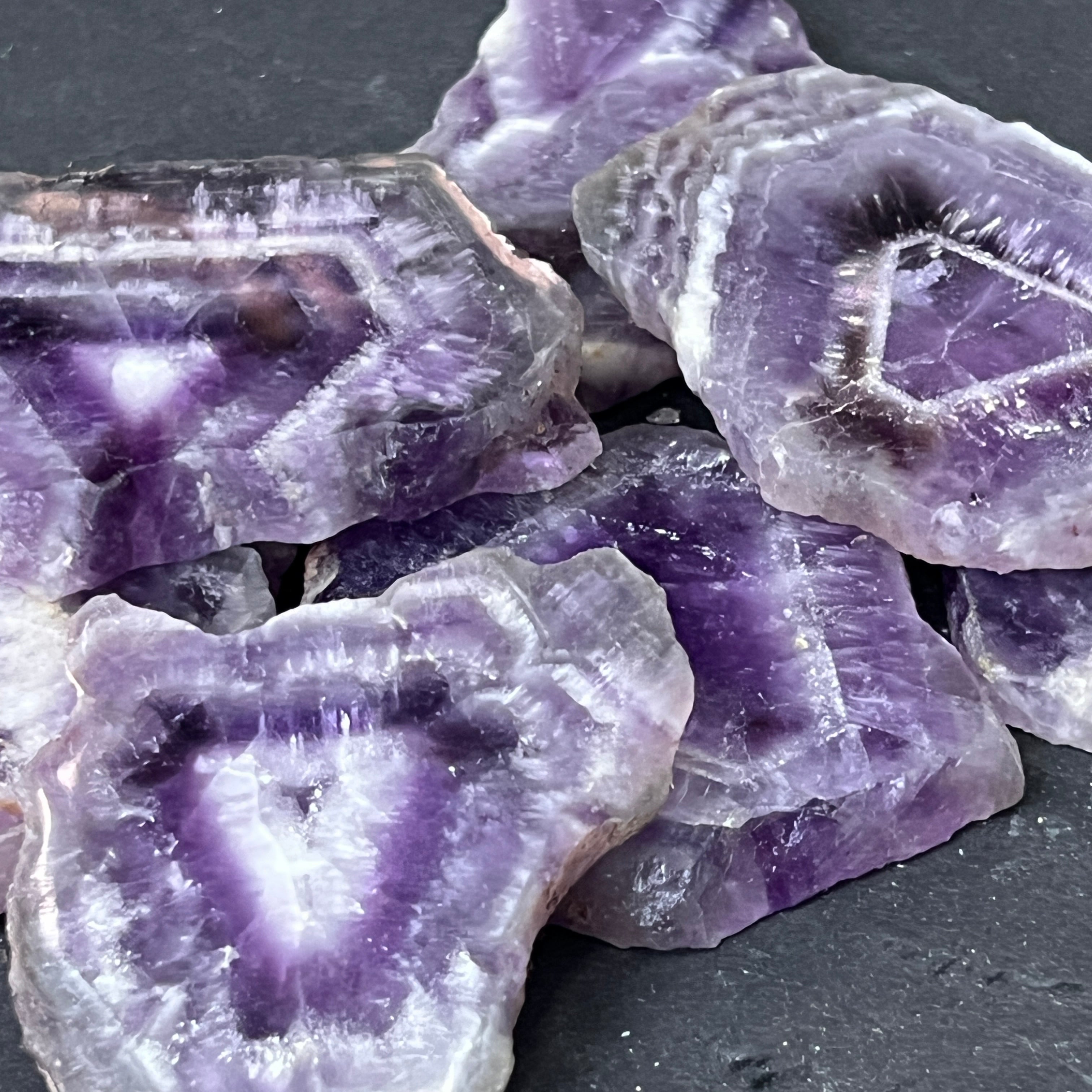 Аметистът шеврон е известен със свързването си с коронната и третото око чакри, като усилва интуицията и способността за вземане на решения.