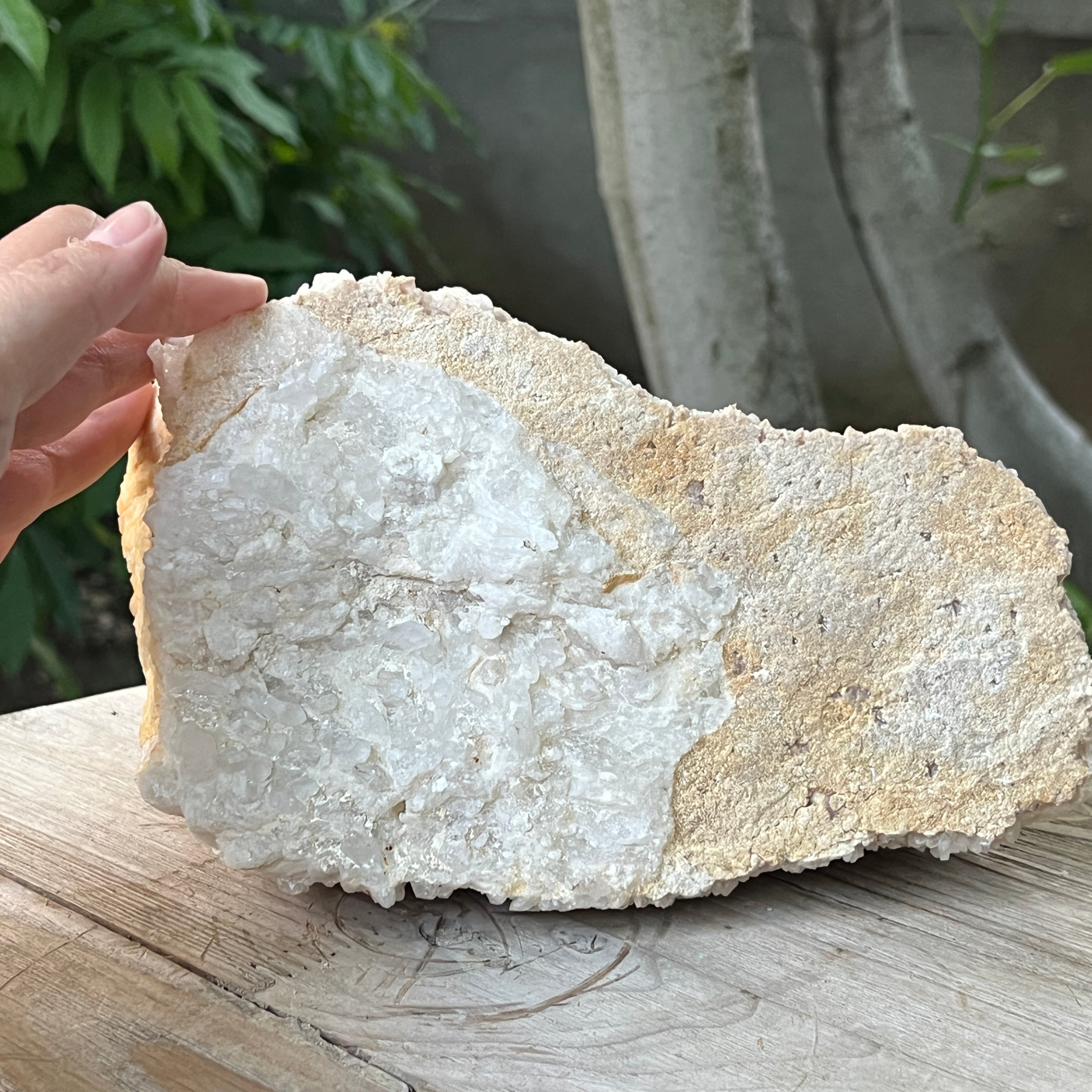 Феноменът, който създава тази специална форма, се нарича вторична епитаксия – процес, при който малки кварцови кристали се развиват върху лицата на основния кристал, запазвайки кристалната ориентация, но образувайки компактна, гранулирана и сияйна текстура. Резултатът е богато текстурирана повърхност с органична естетика и фин ефект на светлина в зависимост от ъгъла, под който се наблюдава.