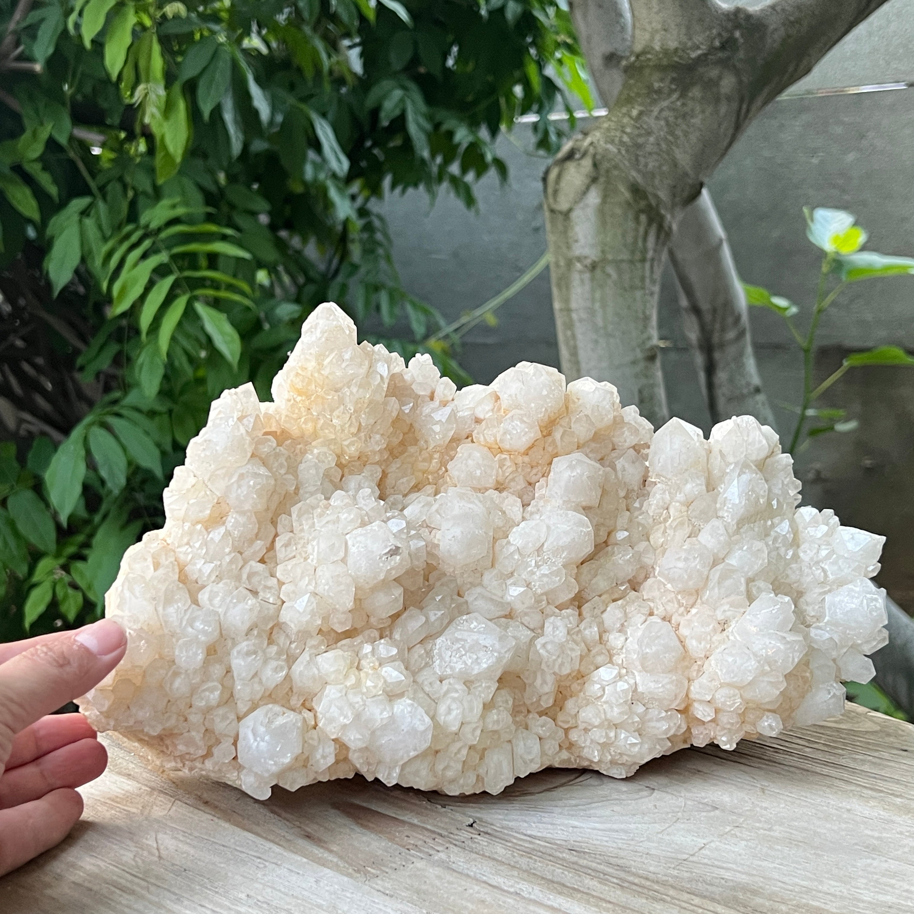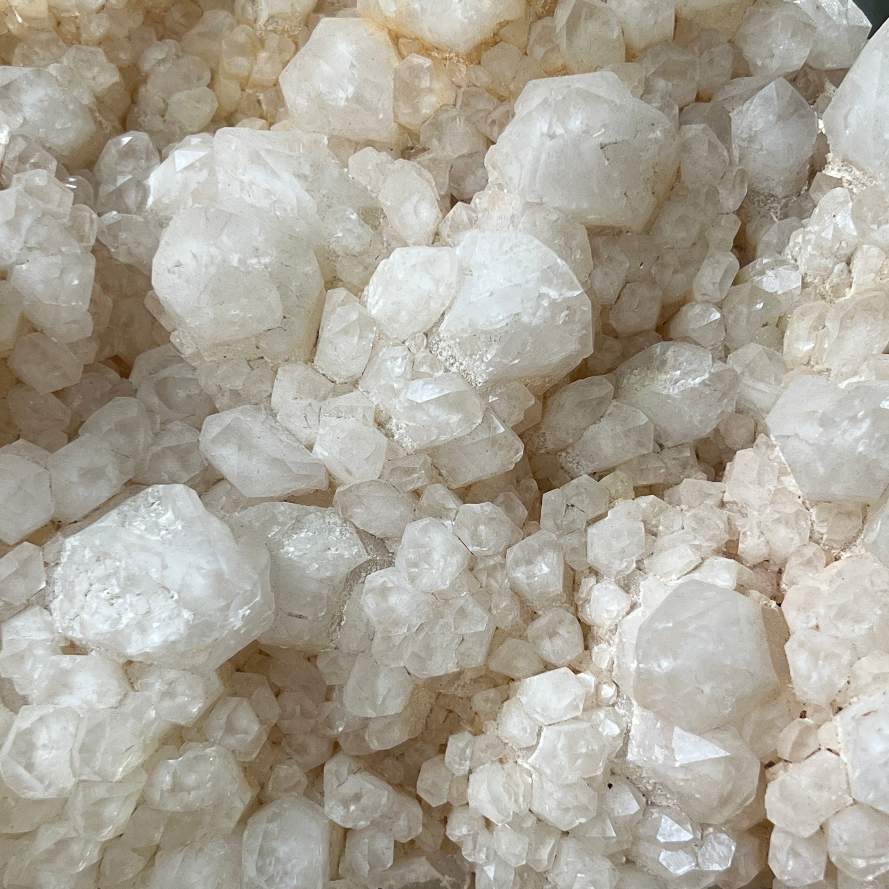 Феноменът, който създава тази специална форма, се нарича вторична епитаксия – процес, при който малки кварцови кристали се развиват върху лицата на основния кристал, запазвайки кристалната ориентация, но образувайки компактна, гранулирана и сияйна текстура. Резултатът е богато текстурирана повърхност с органична естетика и фин ефект на светлина в зависимост от ъгъла, под който се наблюдава.