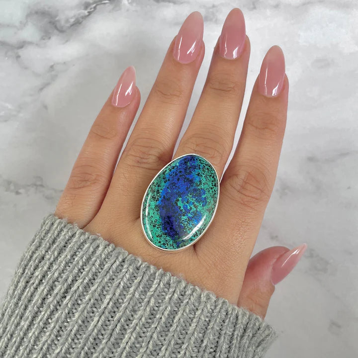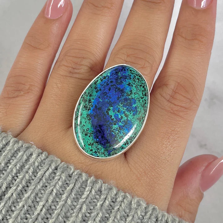 Изберете сега пръстена от сребро с натурален азурит-малахит и носете със себе си хармонията между дълбочината на азурита и регенериращата енергия на малахита. Уникално бижу с впечатляващ контраст на цветовете, вдъхновяващо баланс, яснота и вътрешна сила. 💙💚
