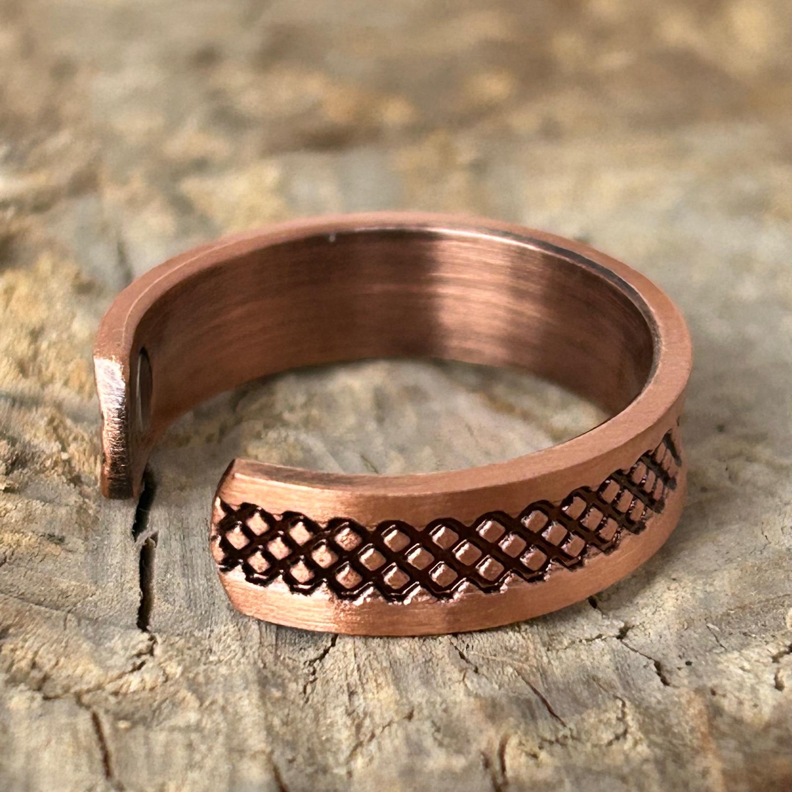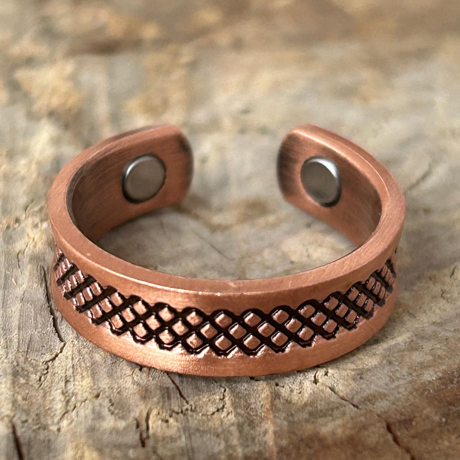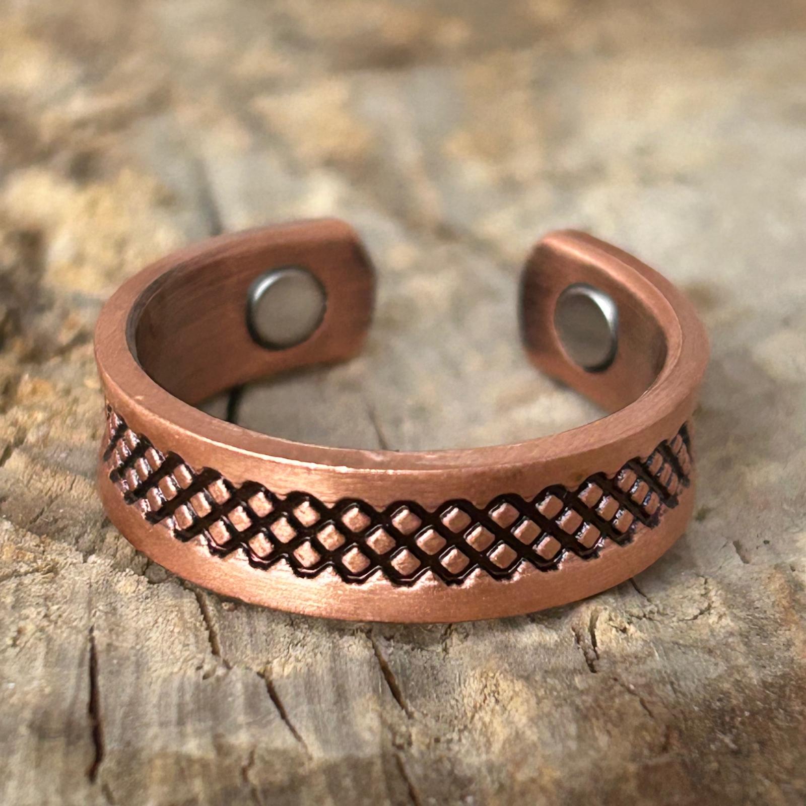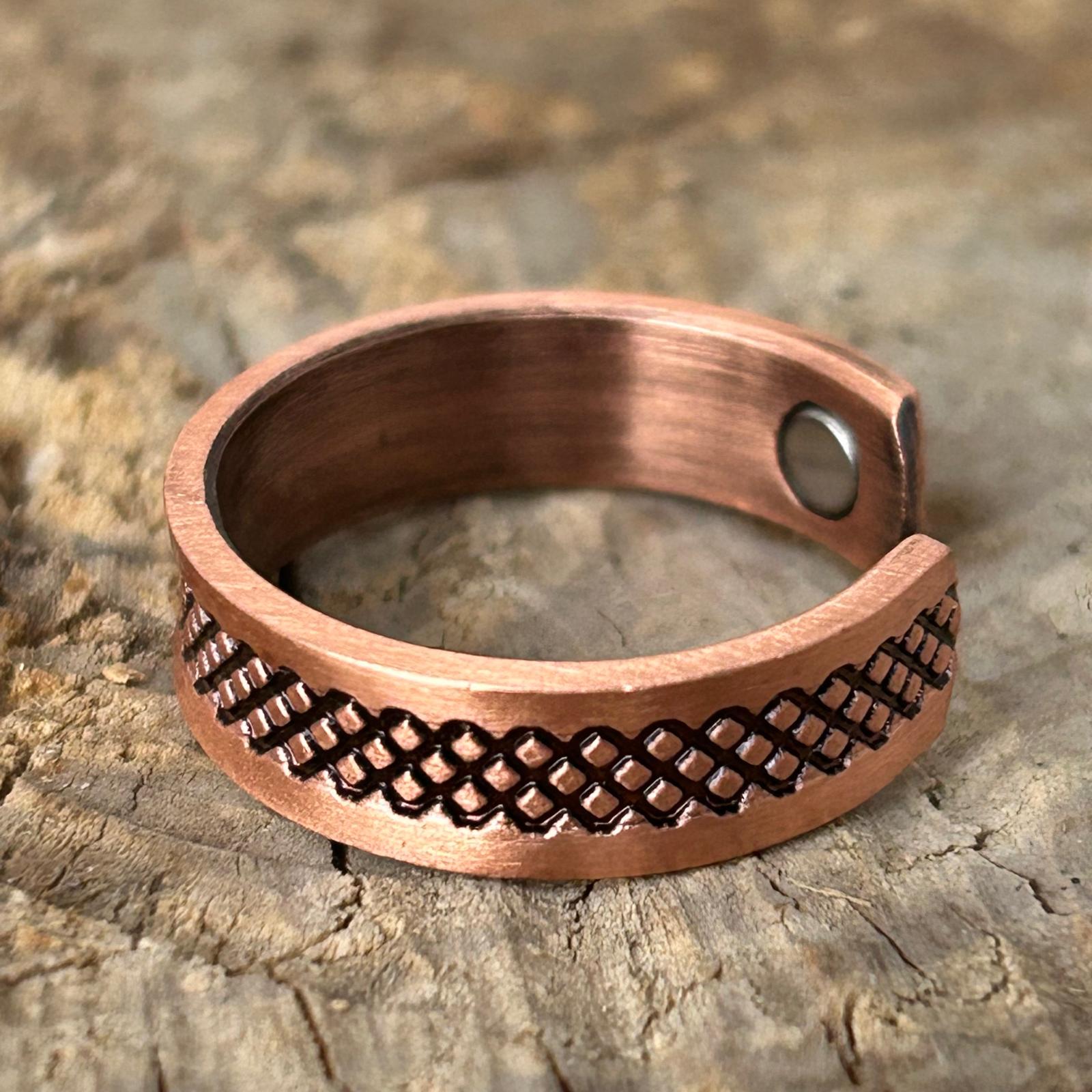 Медта, носена от древни времена като защитен и лечебен метал, се смята за катализатор на жизнената енергия и вътрешния баланс. В комбинация с регулируемата форма, пръстенът става не просто бижу, а и символ на адаптивността и хармоничното протичане през живота.