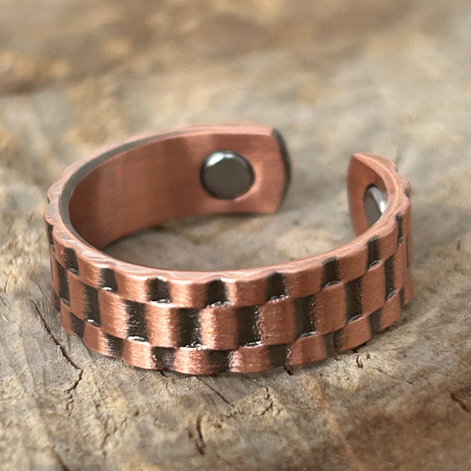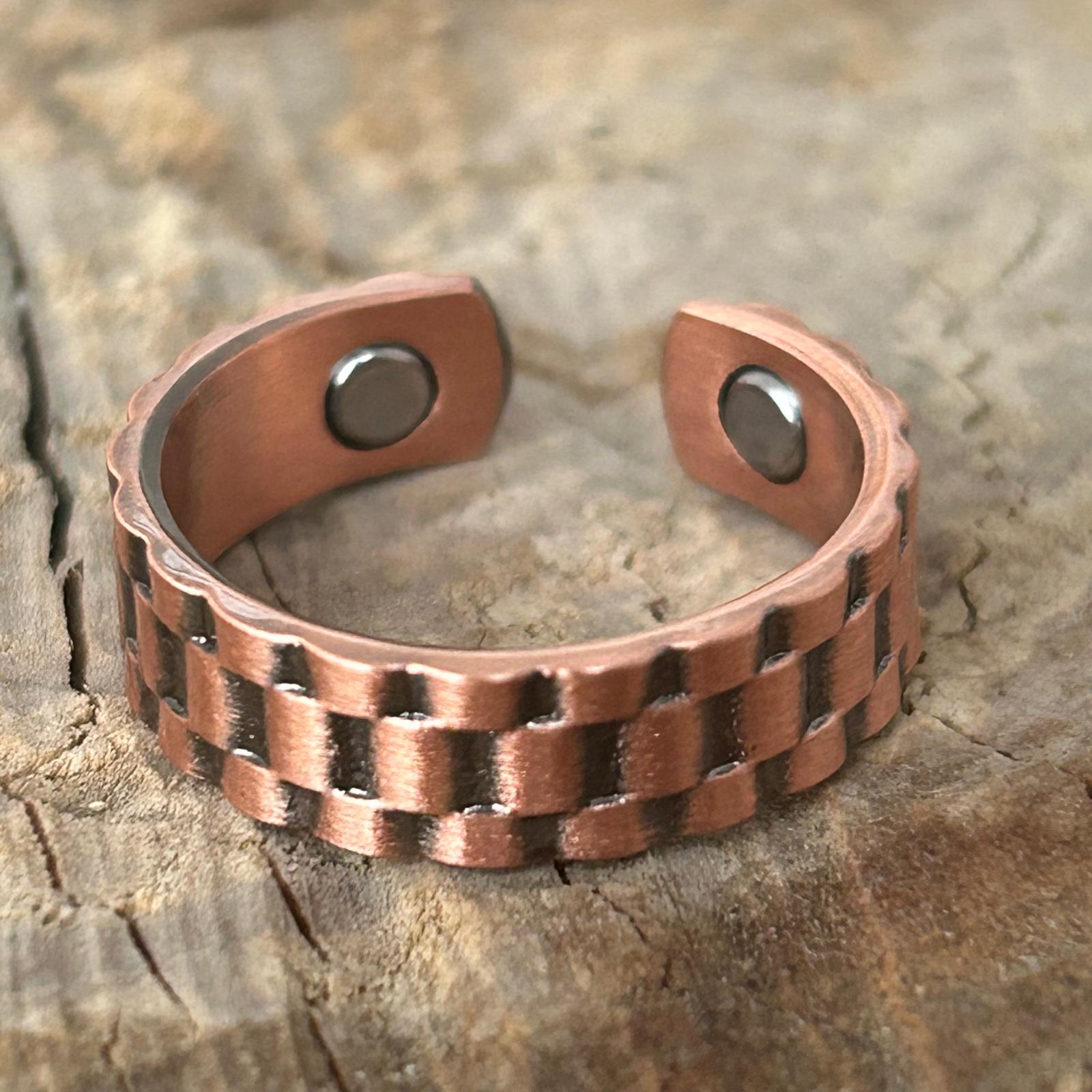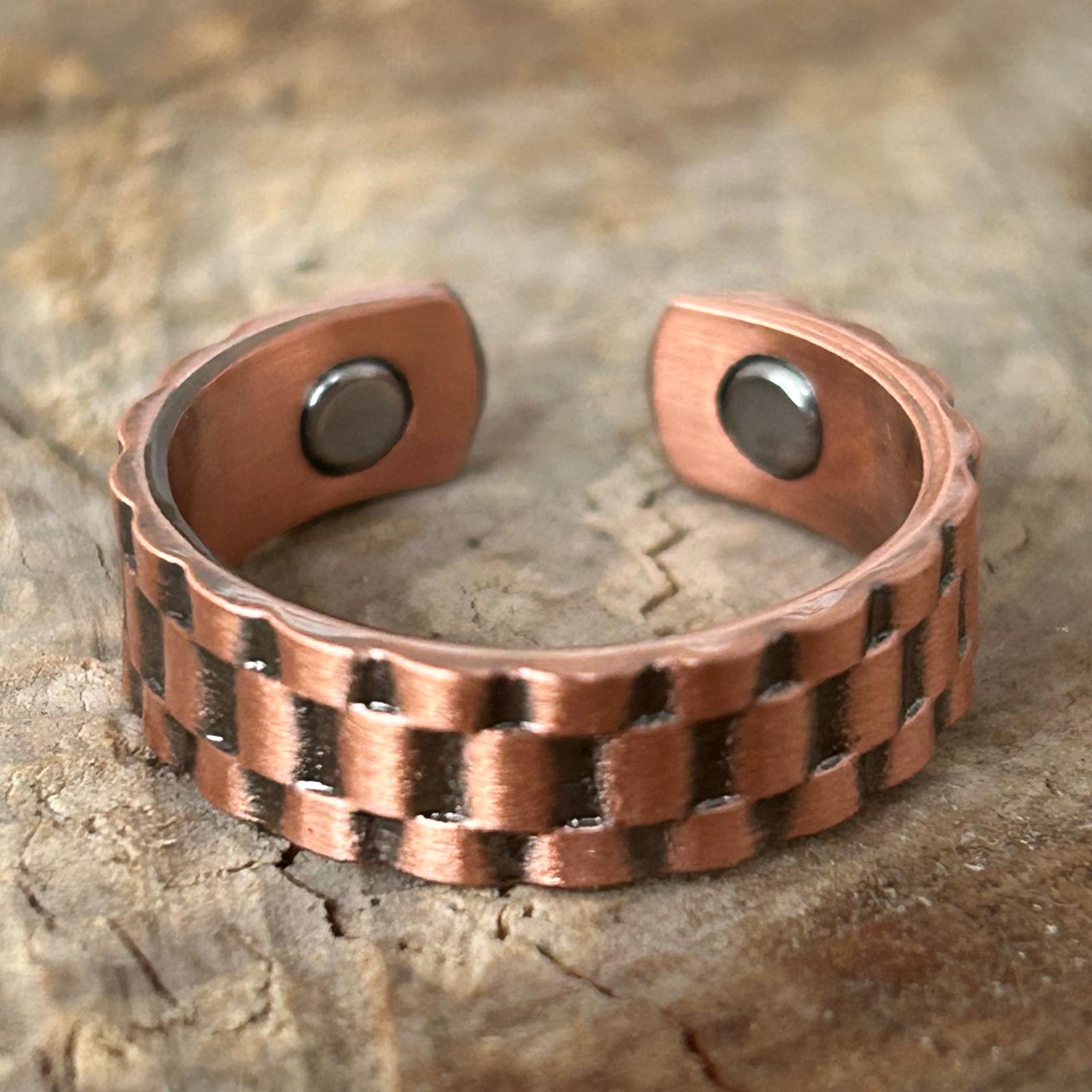 Медта, носена от древни времена като защитен и лечебен метал, се смята за катализатор на жизнената енергия и вътрешния баланс. В комбинация с регулируемата форма, пръстенът става не просто бижу, а и символ на адаптивността и хармоничното протичане през живота.