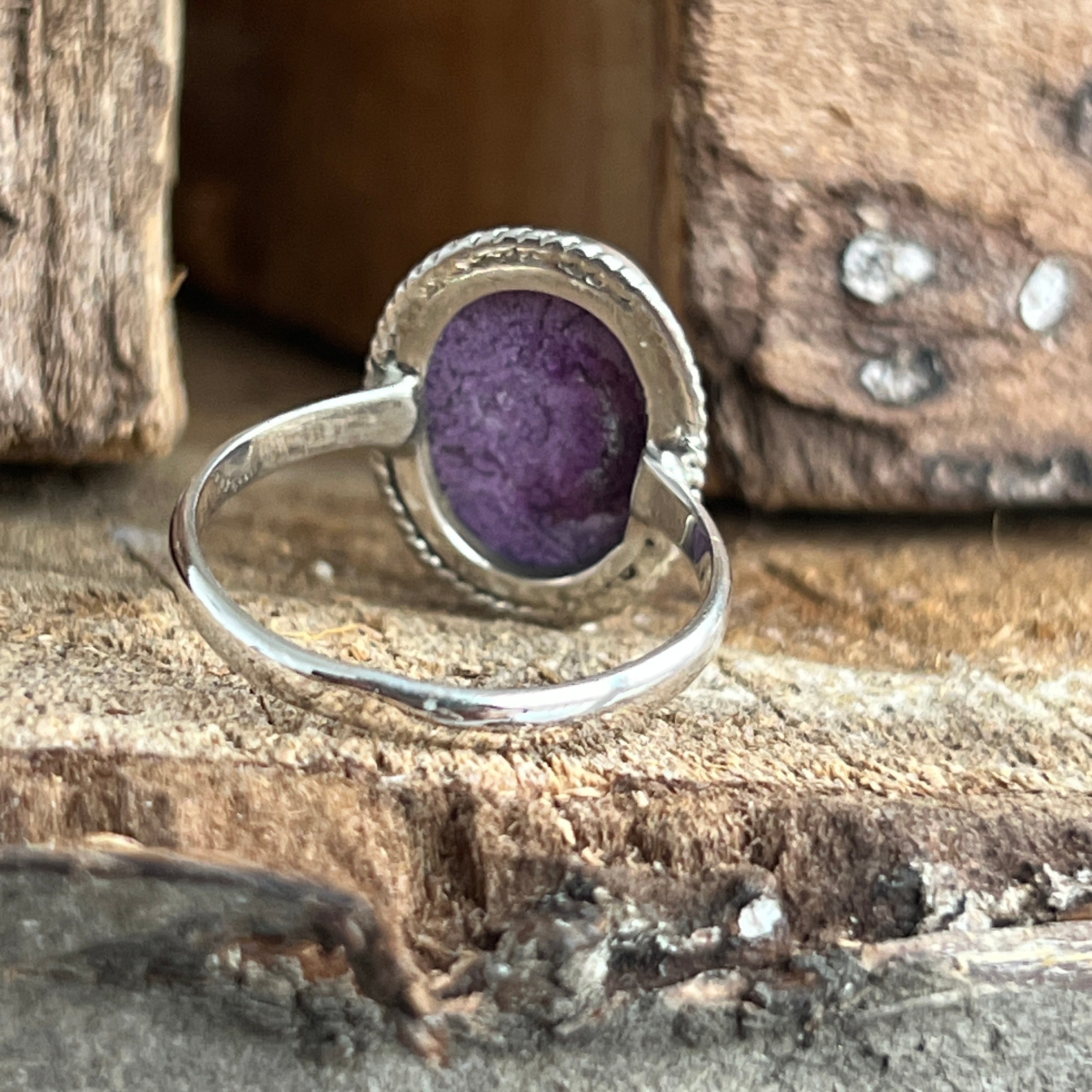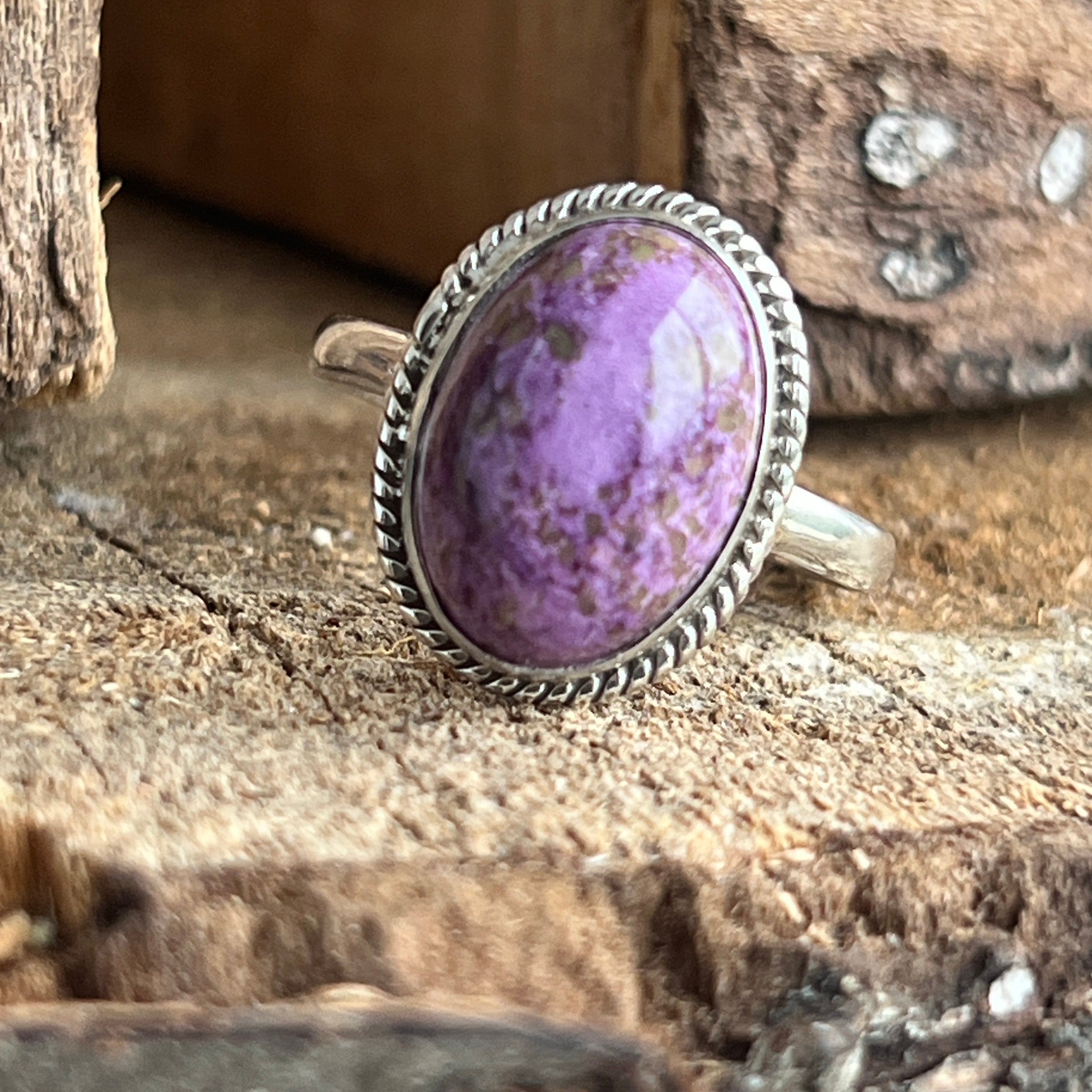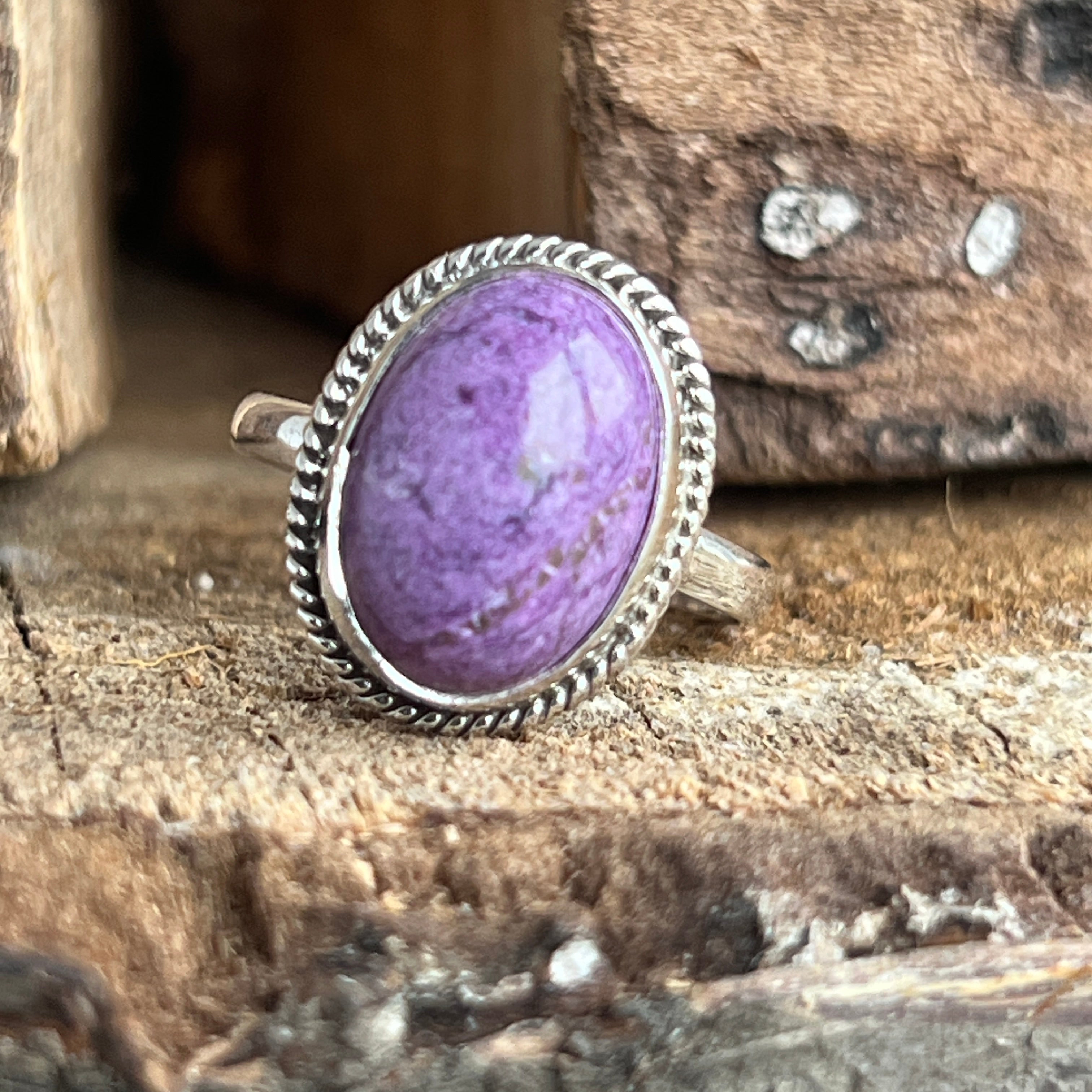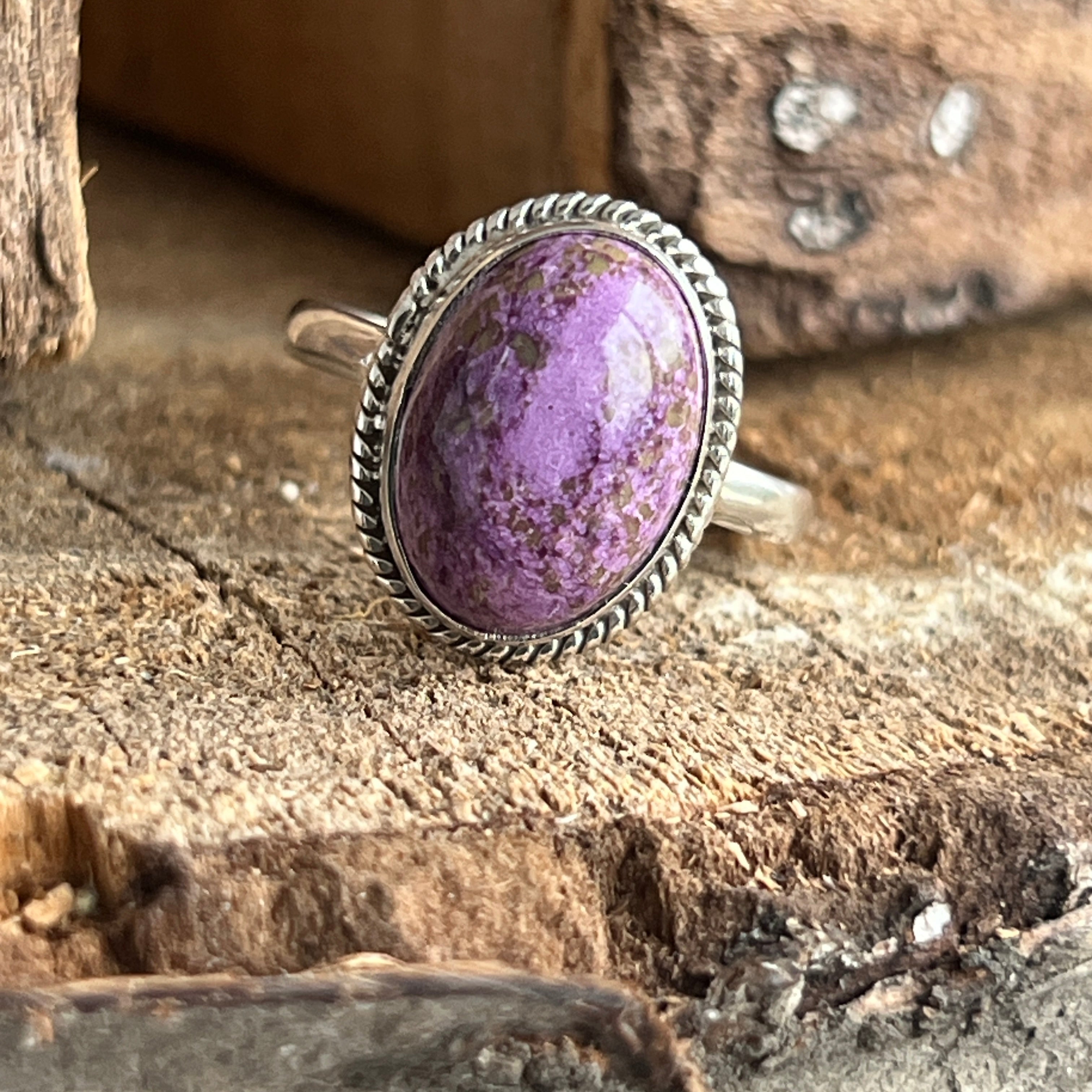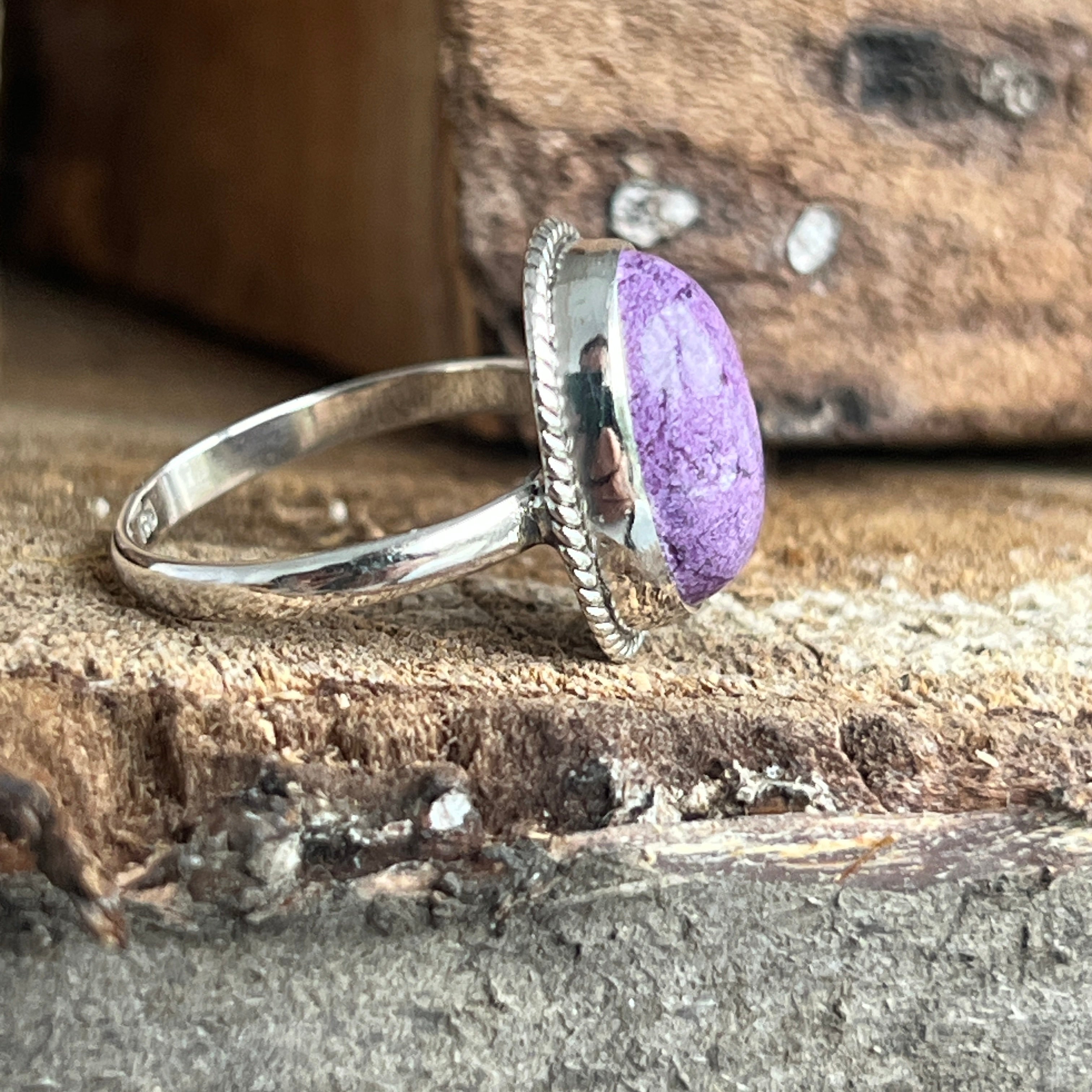 Изискан пръстен от сребро 925, с естествен камък от Пурпурит, в ярки виолетови нюанси с земни включвания, които подчертават неговия естествен произход. Моделът twisted wire придава на бижуто вечна елегантност, подходяща както за ежедневна употреба, така и за специални поводи.