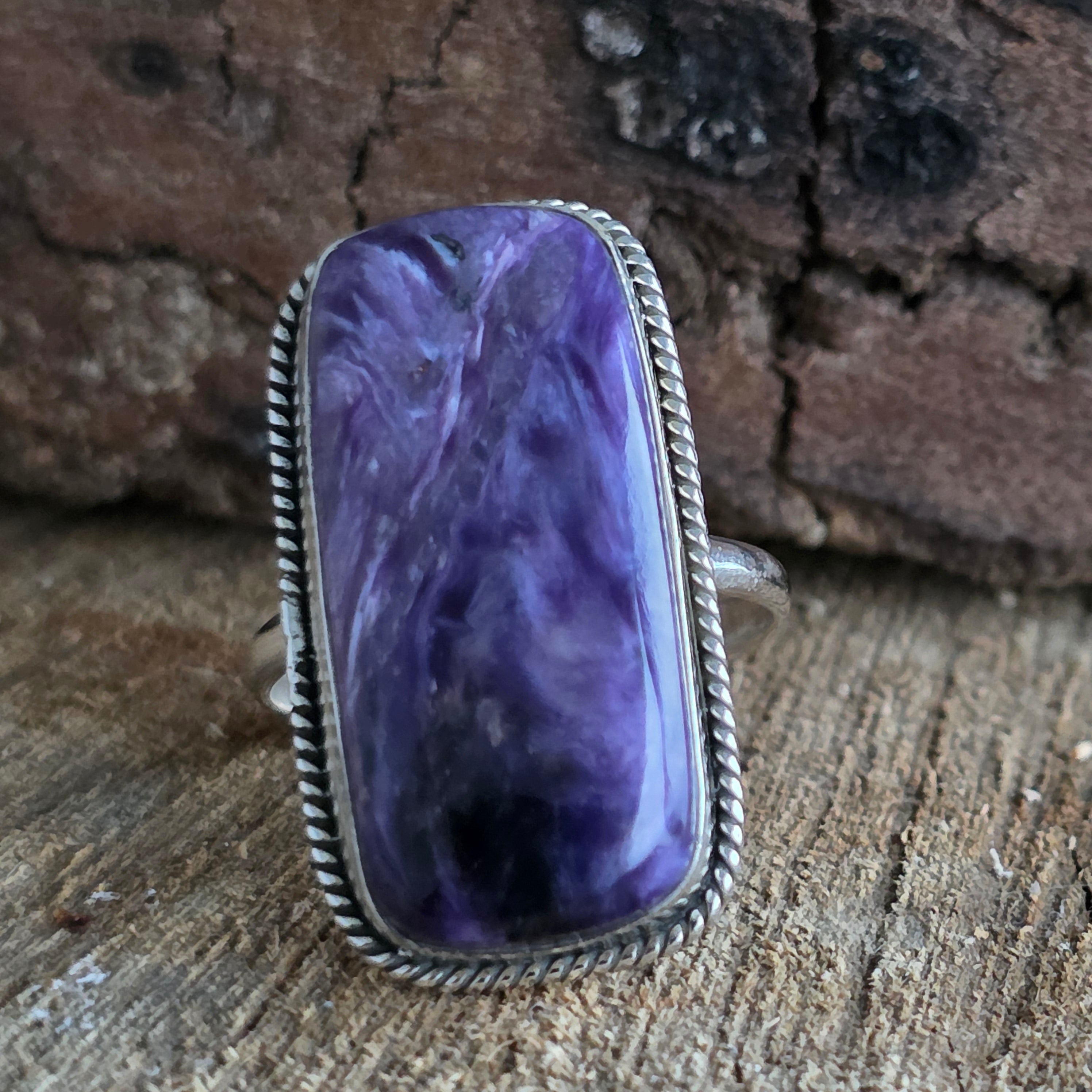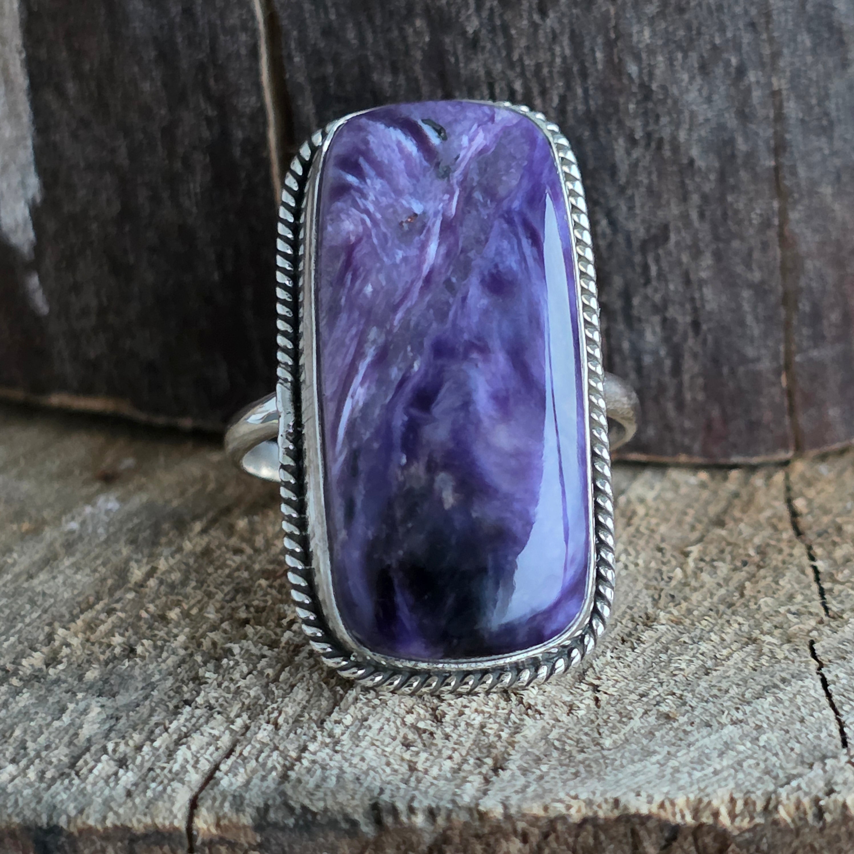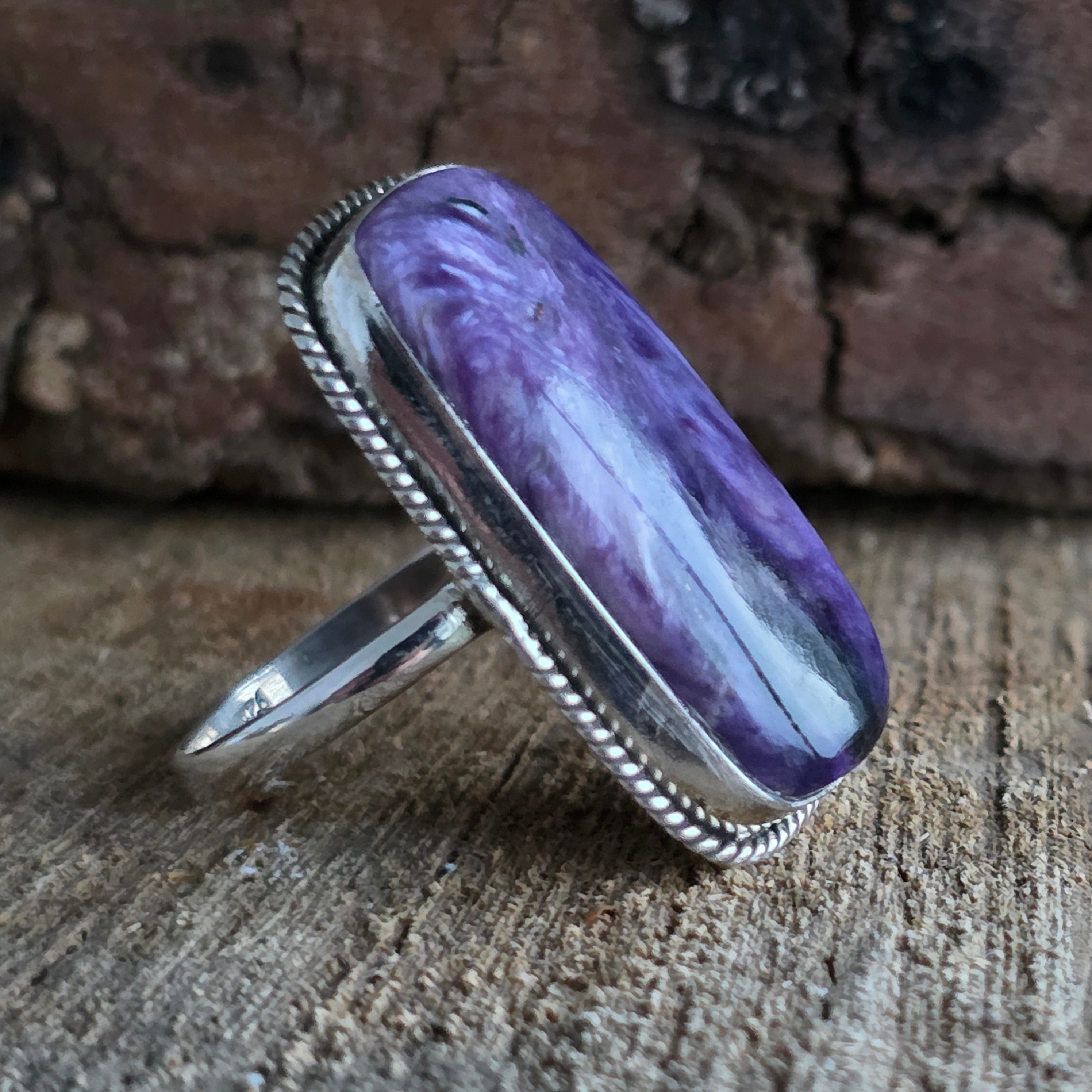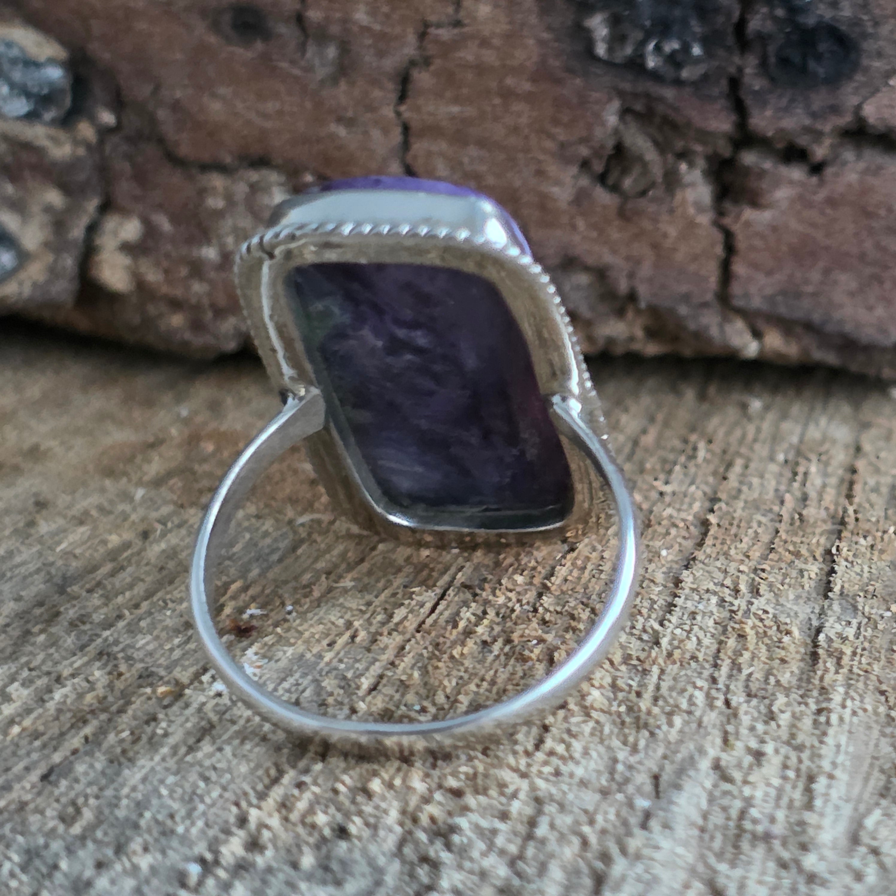 Масивен пръстен, изработен ръчно от сребро 925, с естествен камък Хароит, с наситени нюанси на виолетово и копринени отразявания, които напомнят на космическа картина. Декоративната рамка в стил twisted wire work добавя дълбочина и изтънченост, като балансира съвременната елегантност с традиционно майсторство.