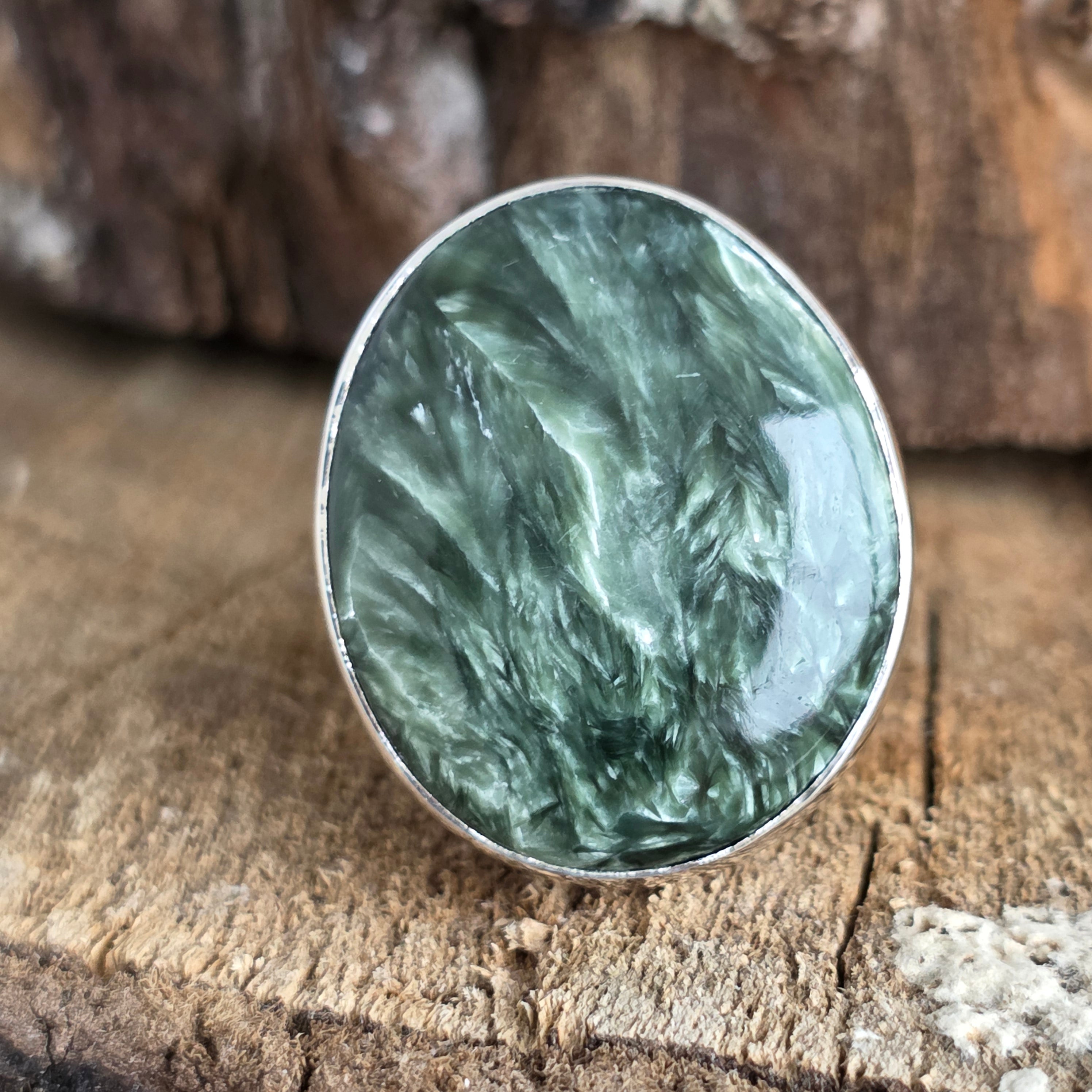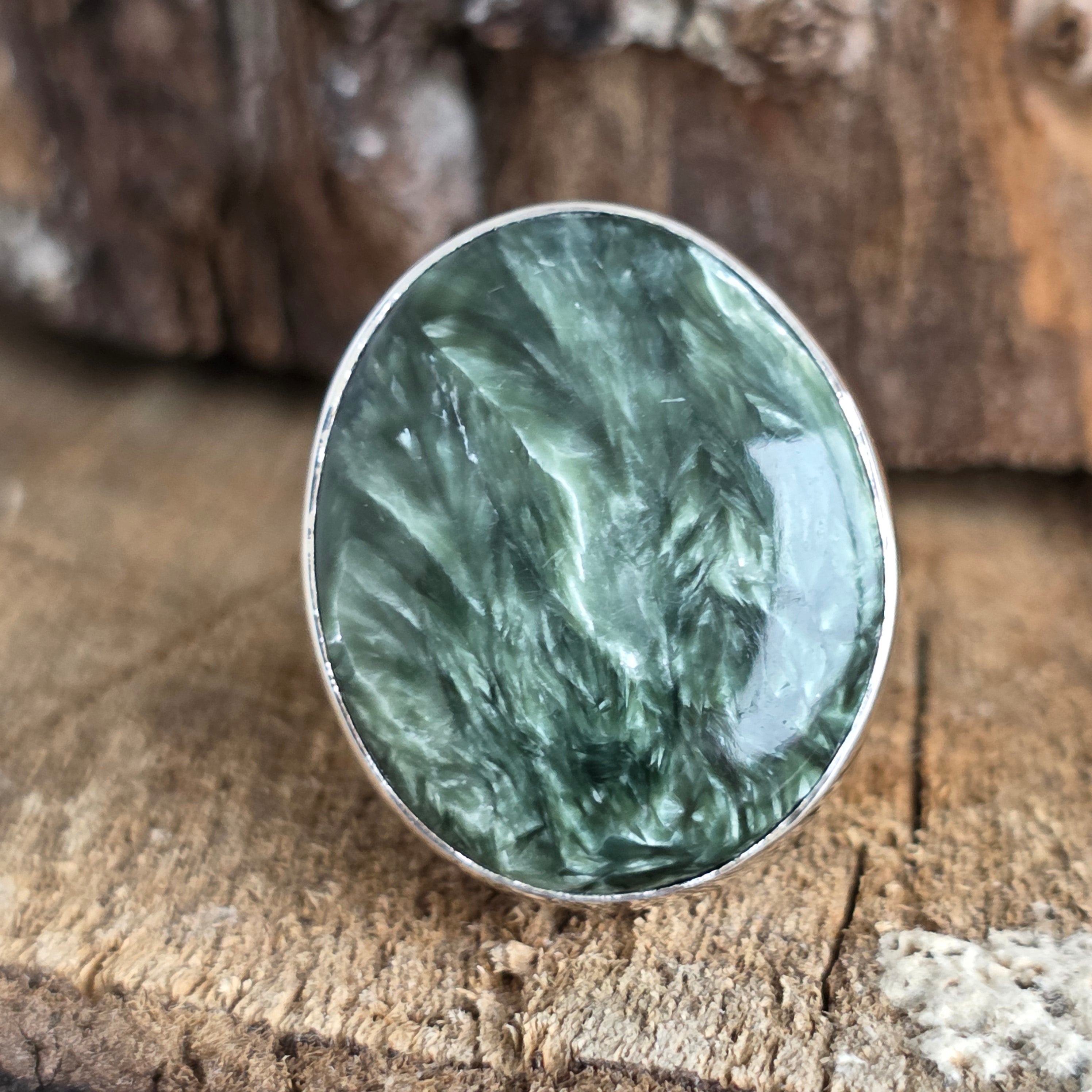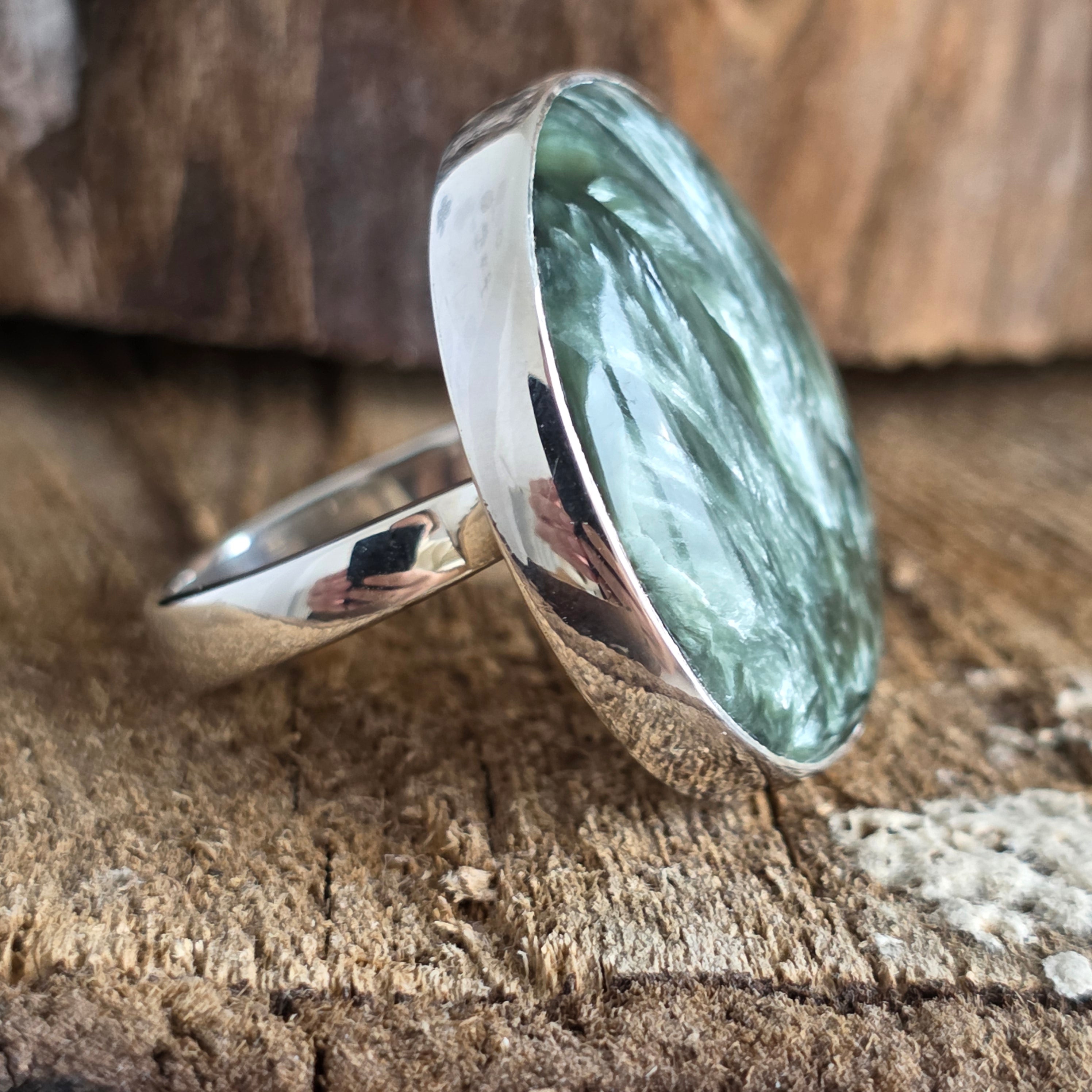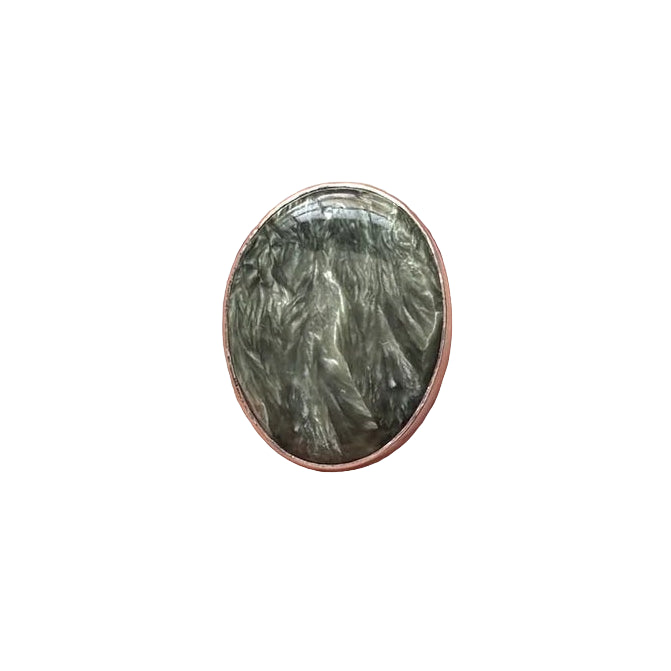 • Бижу, което изглежда сякаш е докоснато от крилете на ангели — този пръстен с натурален серафинит излъчва особен блясък с зелено-сребристи оттенъци, напомнящи перата на серафимите, чистите духове на светлината.