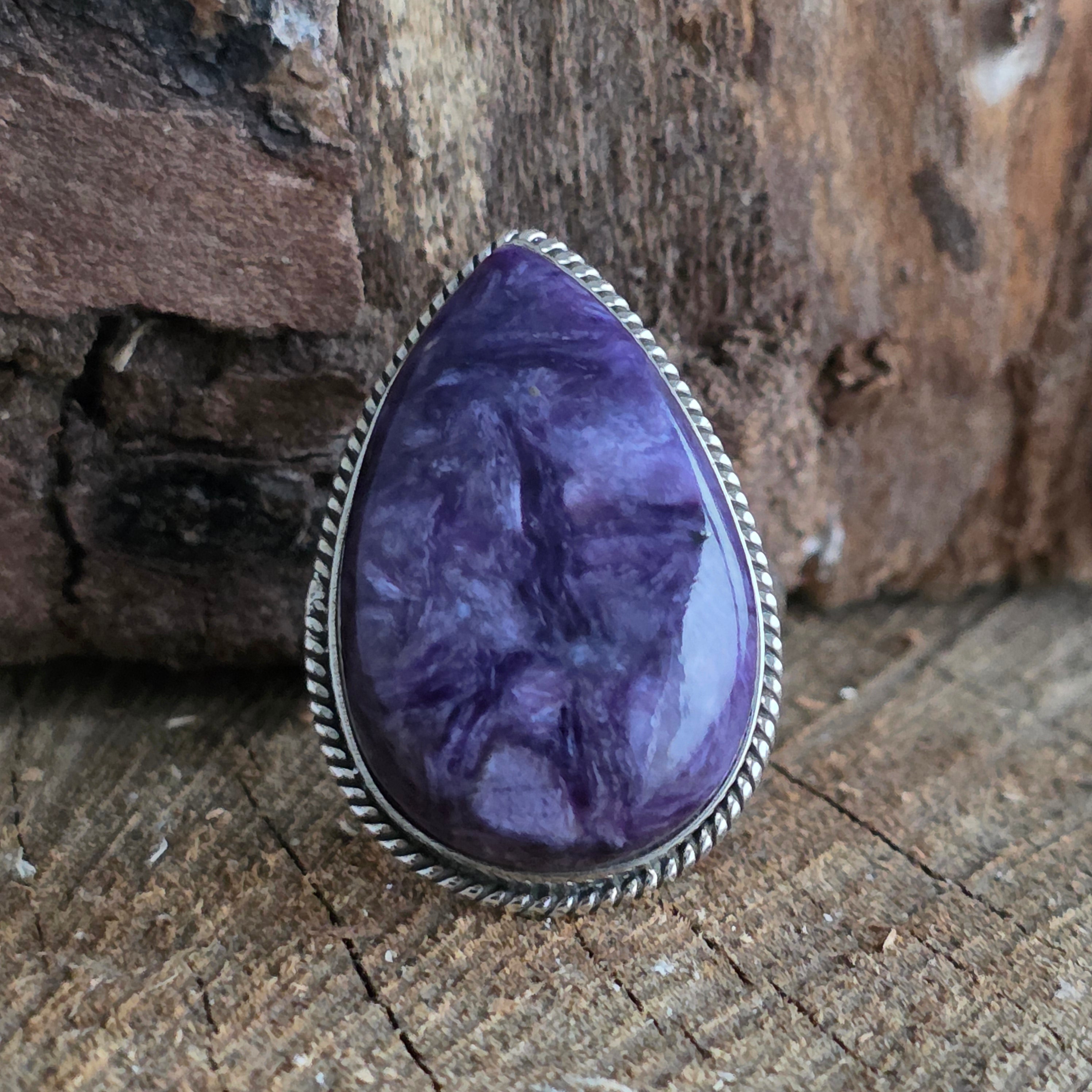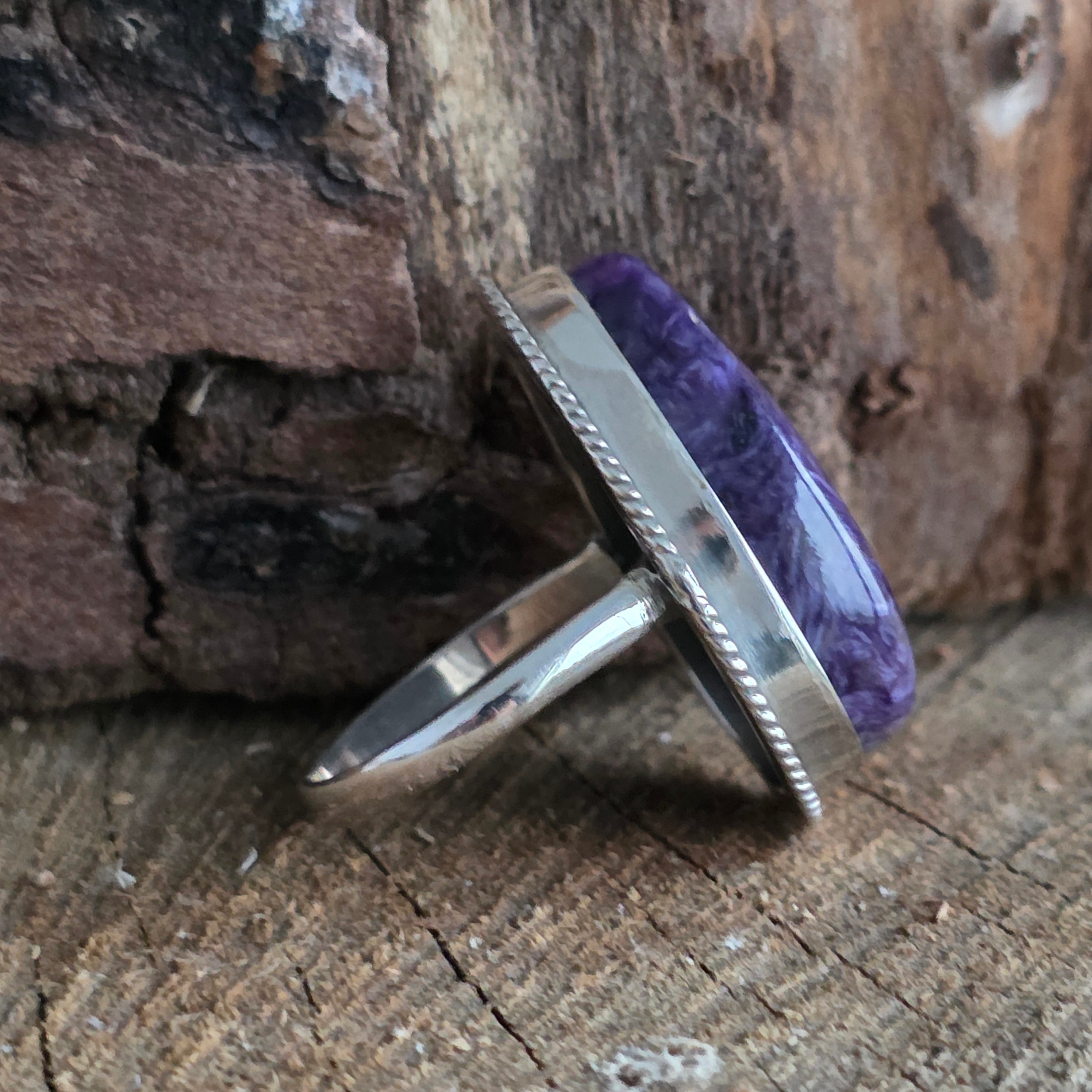Масивен пръстен, ръчно изработен от 925 сребро, в която се помещава естествен камък от Чароит, с живи нюанси на лилаво и копринени отблясъци, напомнящи космическа картина. Декоративна рамка със стил работа с усукана тел добавя дълбочина и изтънченост, балансирайки модерната елегантност с традиционното майсторство на изработката.