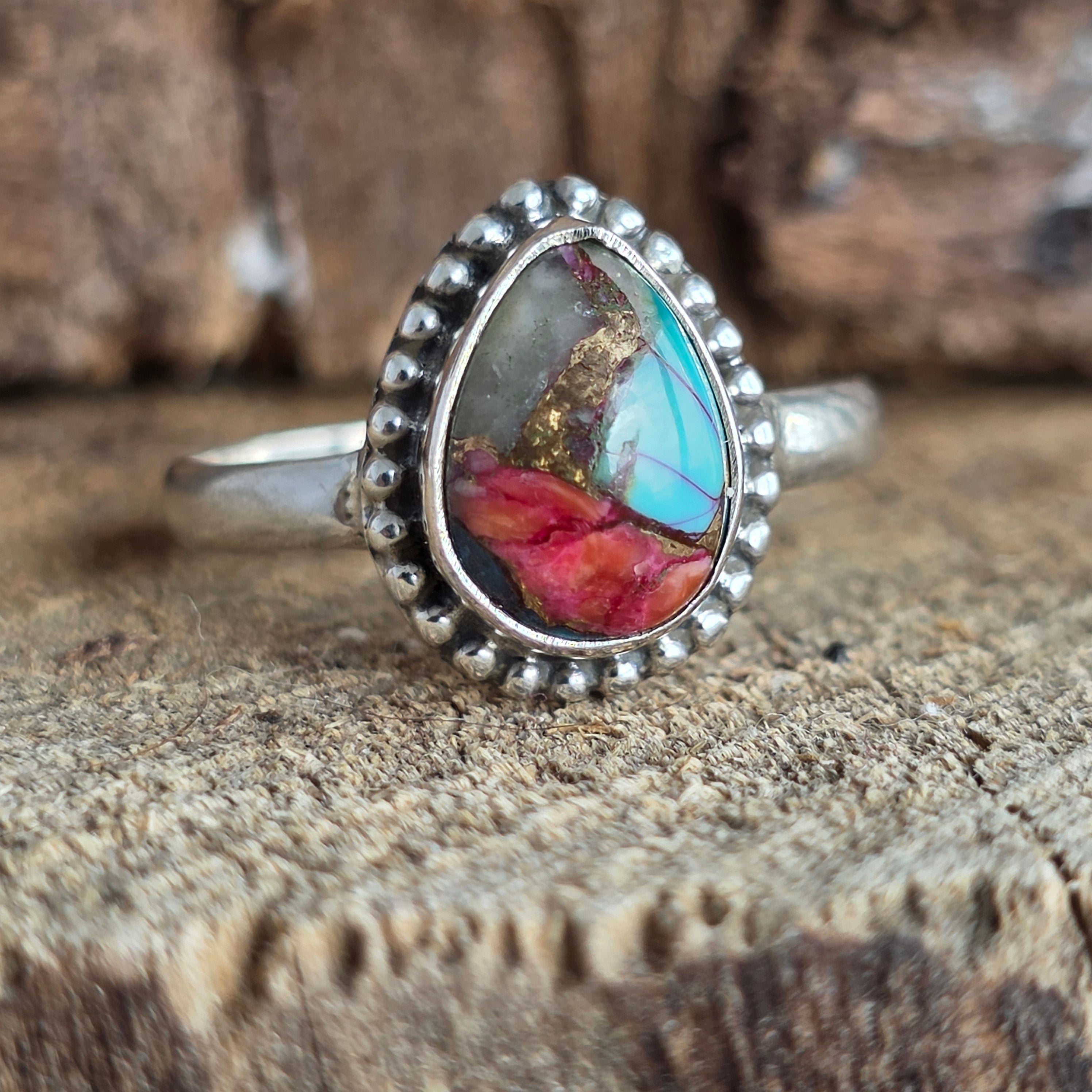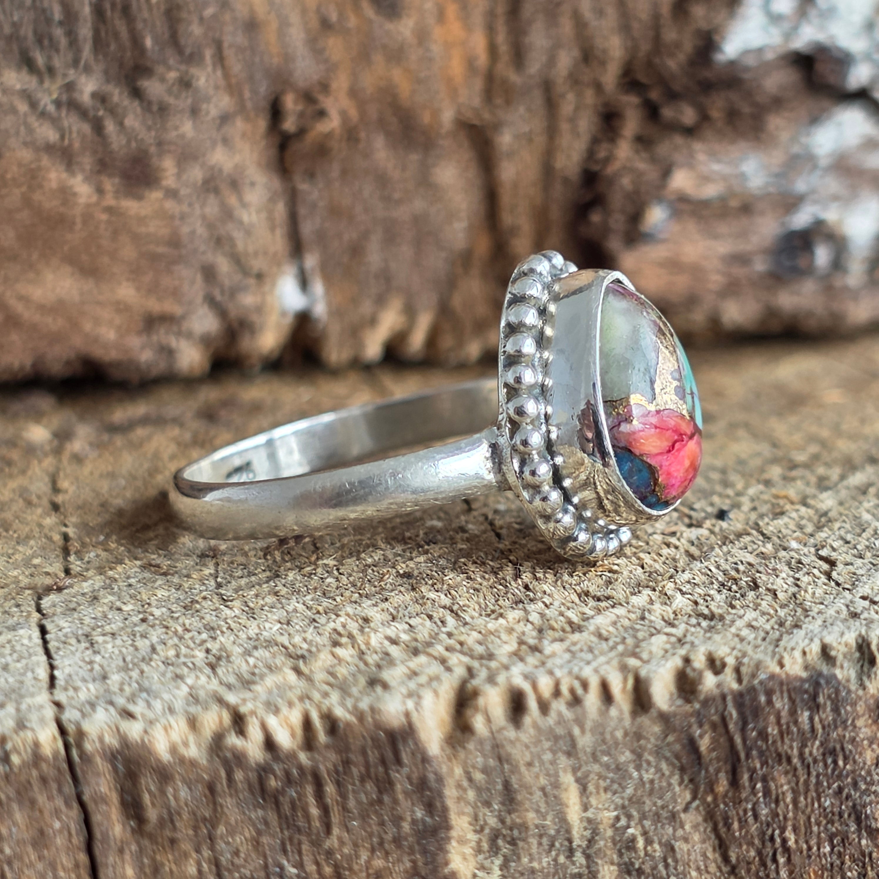 Пръстен, деликатен, но с динамично присъствие – изработен ръчно от сребро 925 и украсен с камък Pink Dahlia Copper Turquoise, който съчетава живи нюанси на фуксия, ярко розово, тюркоазено синьо и топли медни отражения.