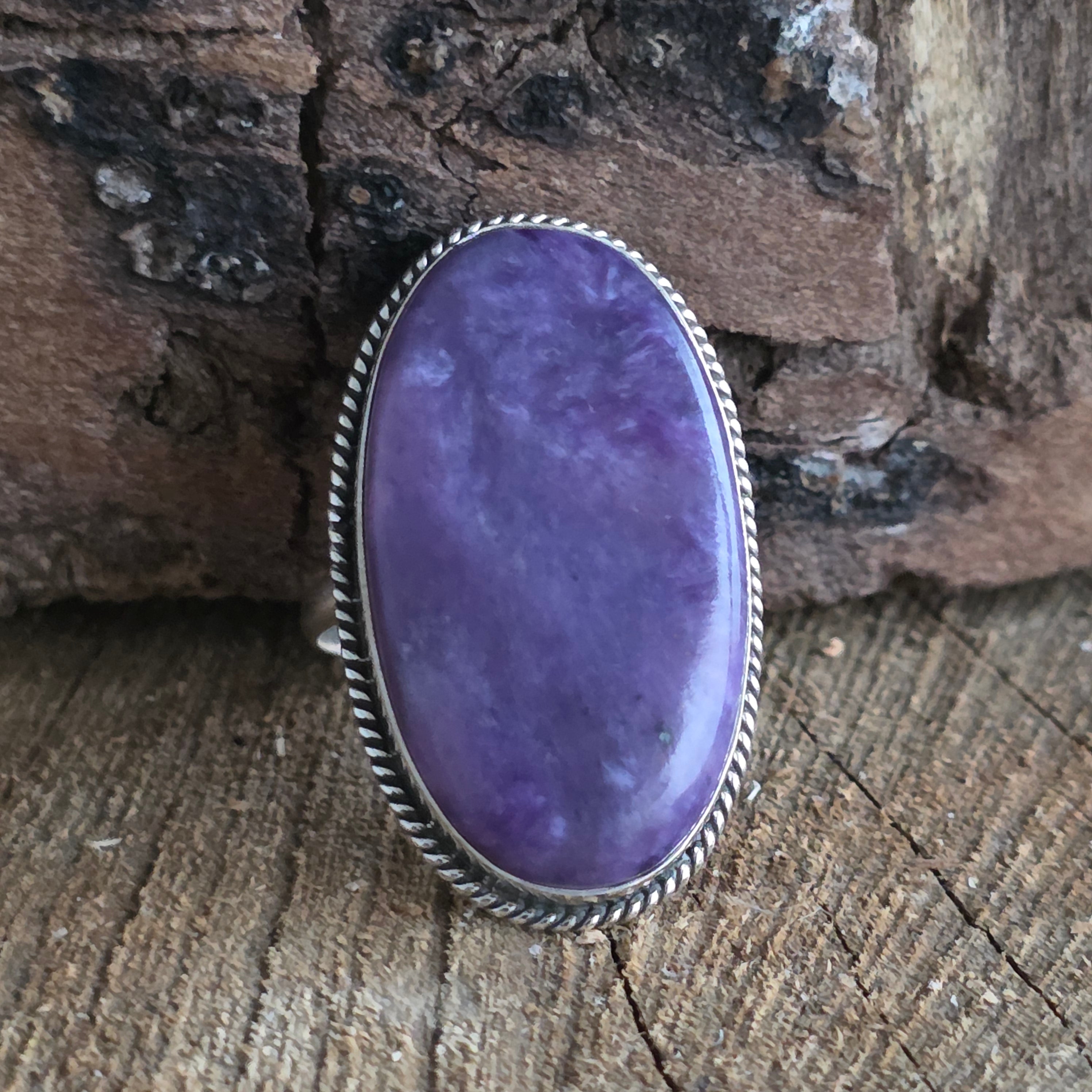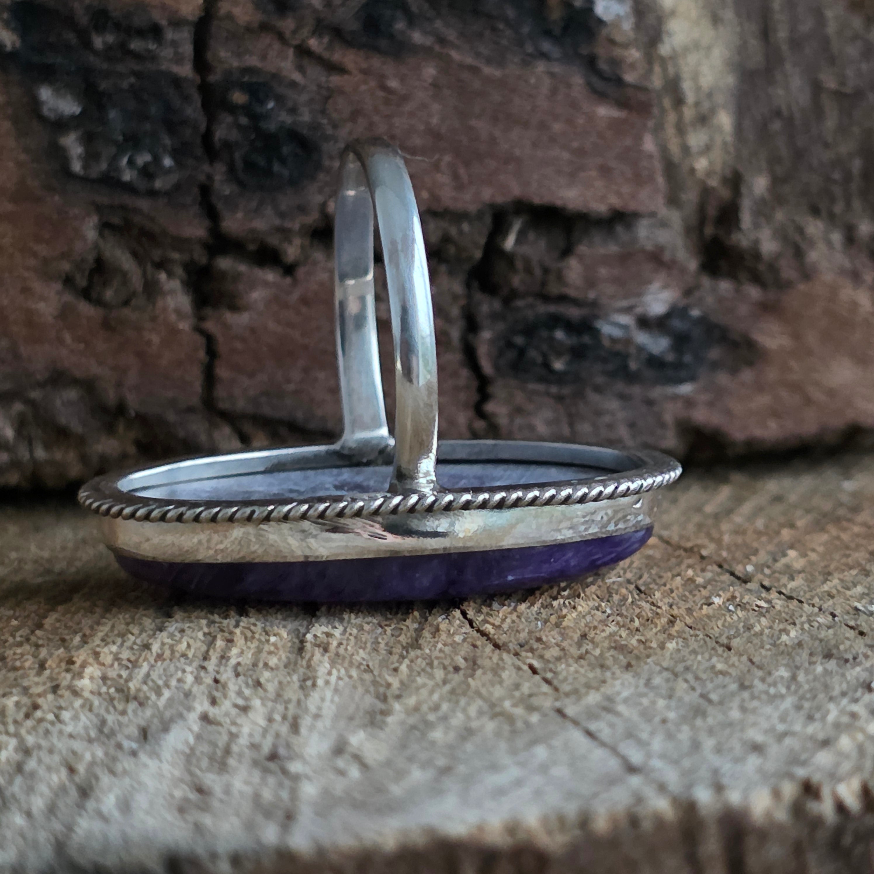 Един масивен, ръчно изработен пръстен от сребро 925, който съдържа естествен камък Хароит, с наситени виолетови нюанси и копринени отблясъци, напомнящи космическа картина. Декоративната рамка в стил twisted wire work добавя дълбочина и изтънченост, балансирайки модерната елегантност с традиционното майсторство.