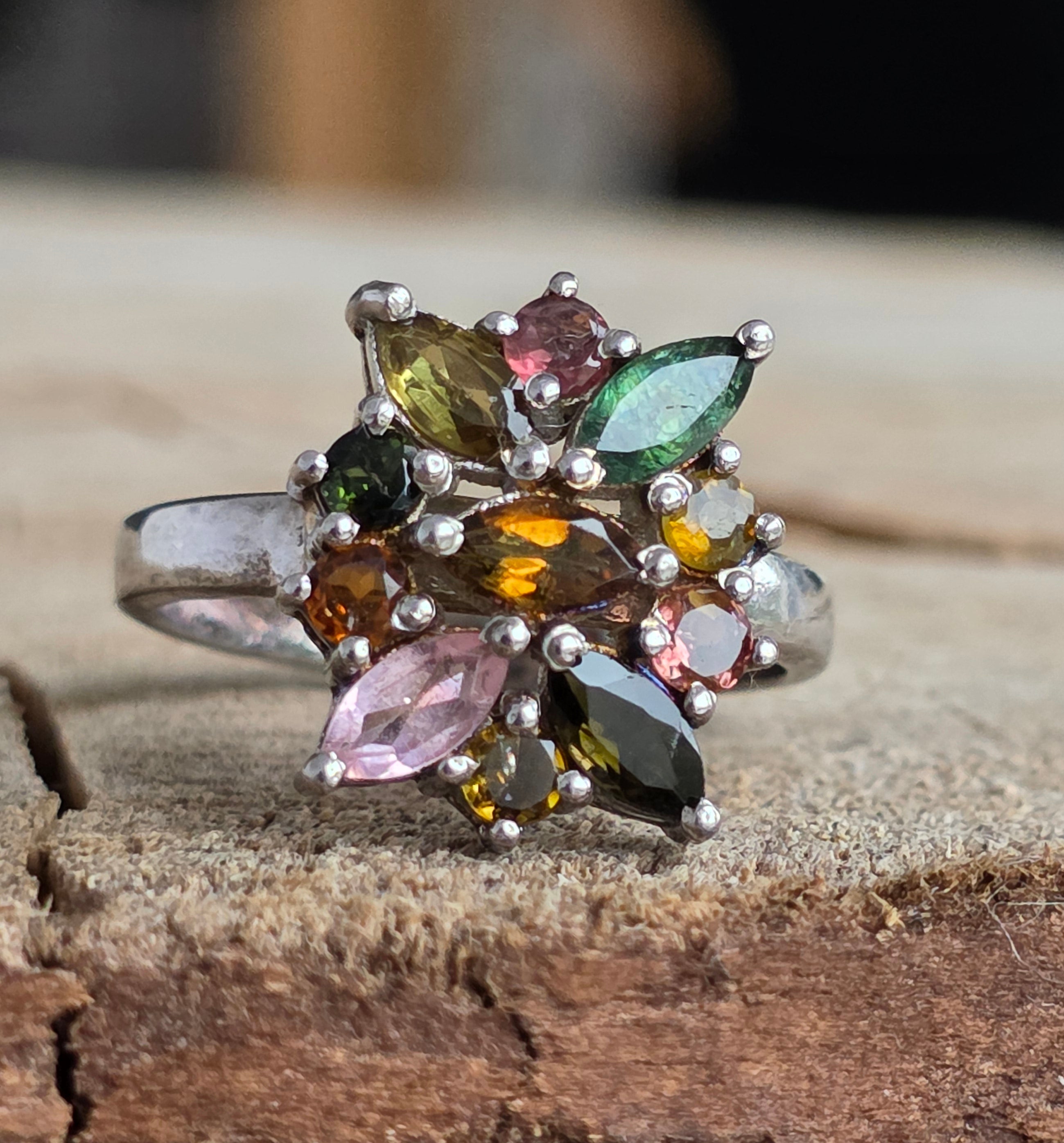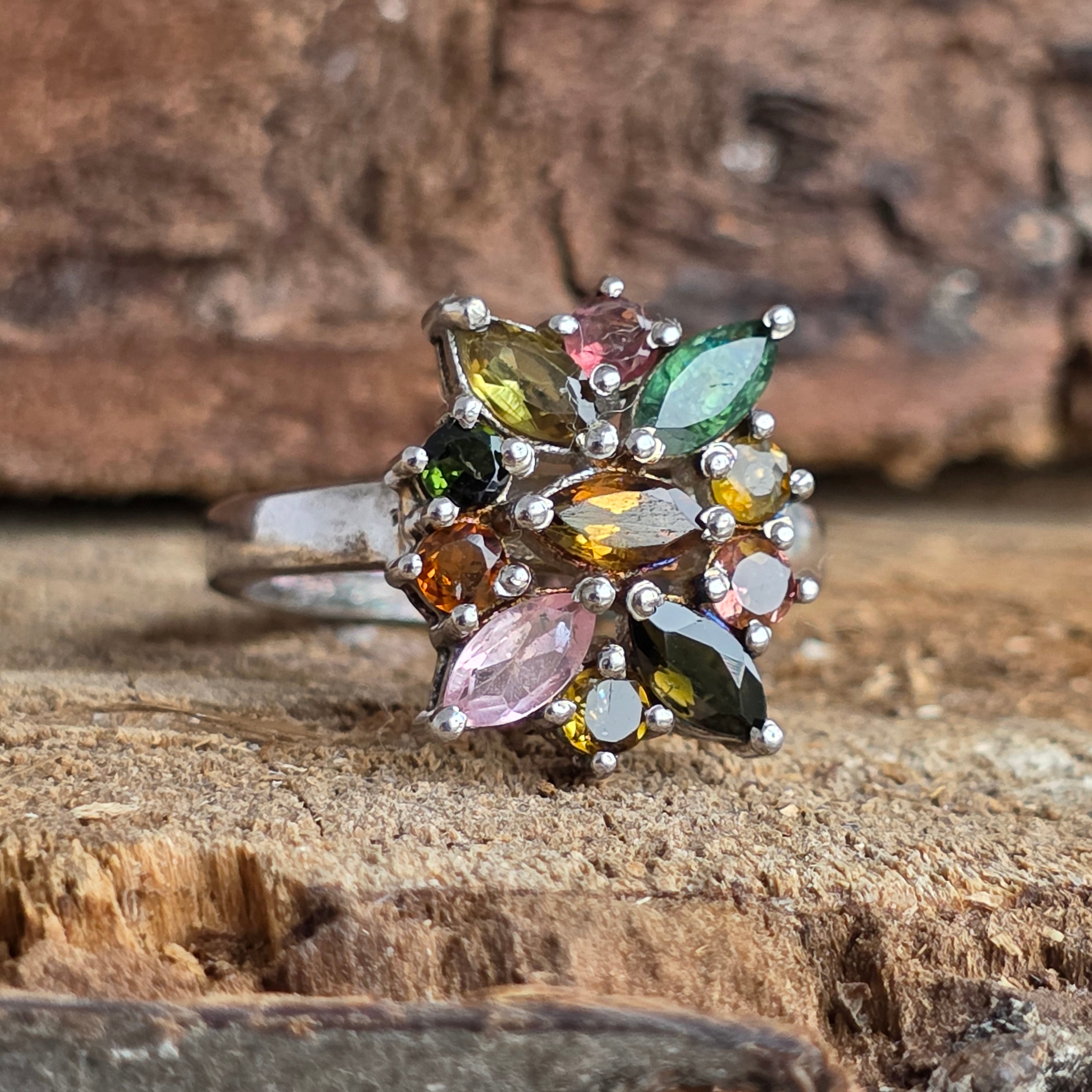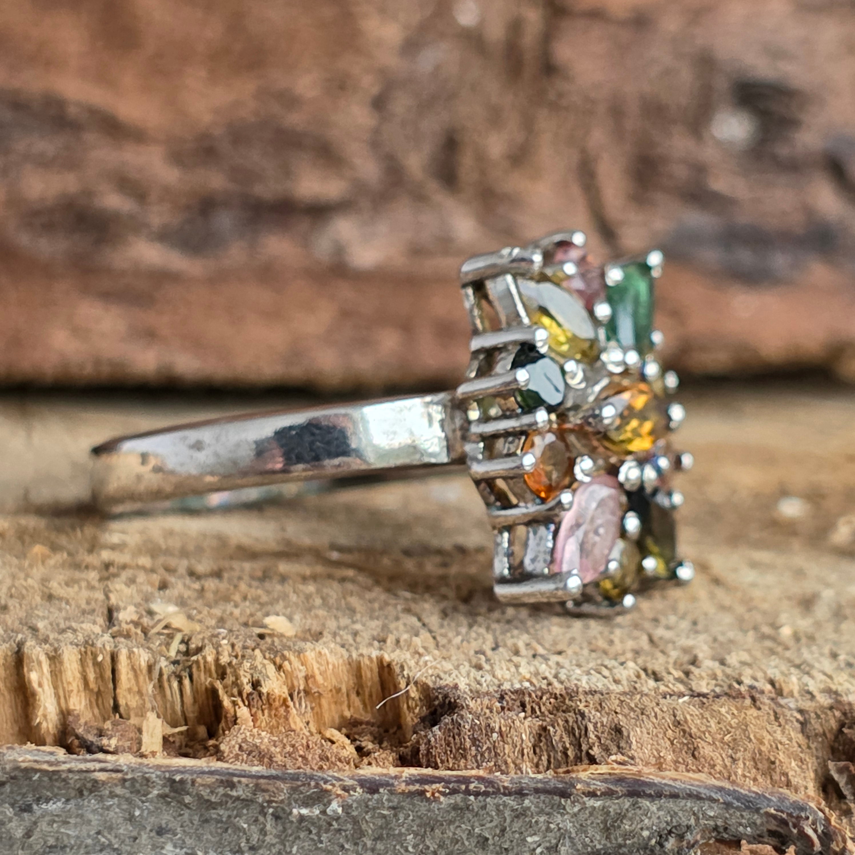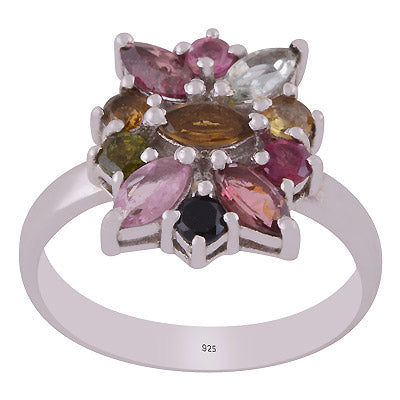 Експлозия от цвят и изтънченост – този Сребърен пръстен проба 925 с покритие от родий вдъхва живот на жизнения спектър на естествени турмалини, аранжирани в елегантен флорален дизайн.