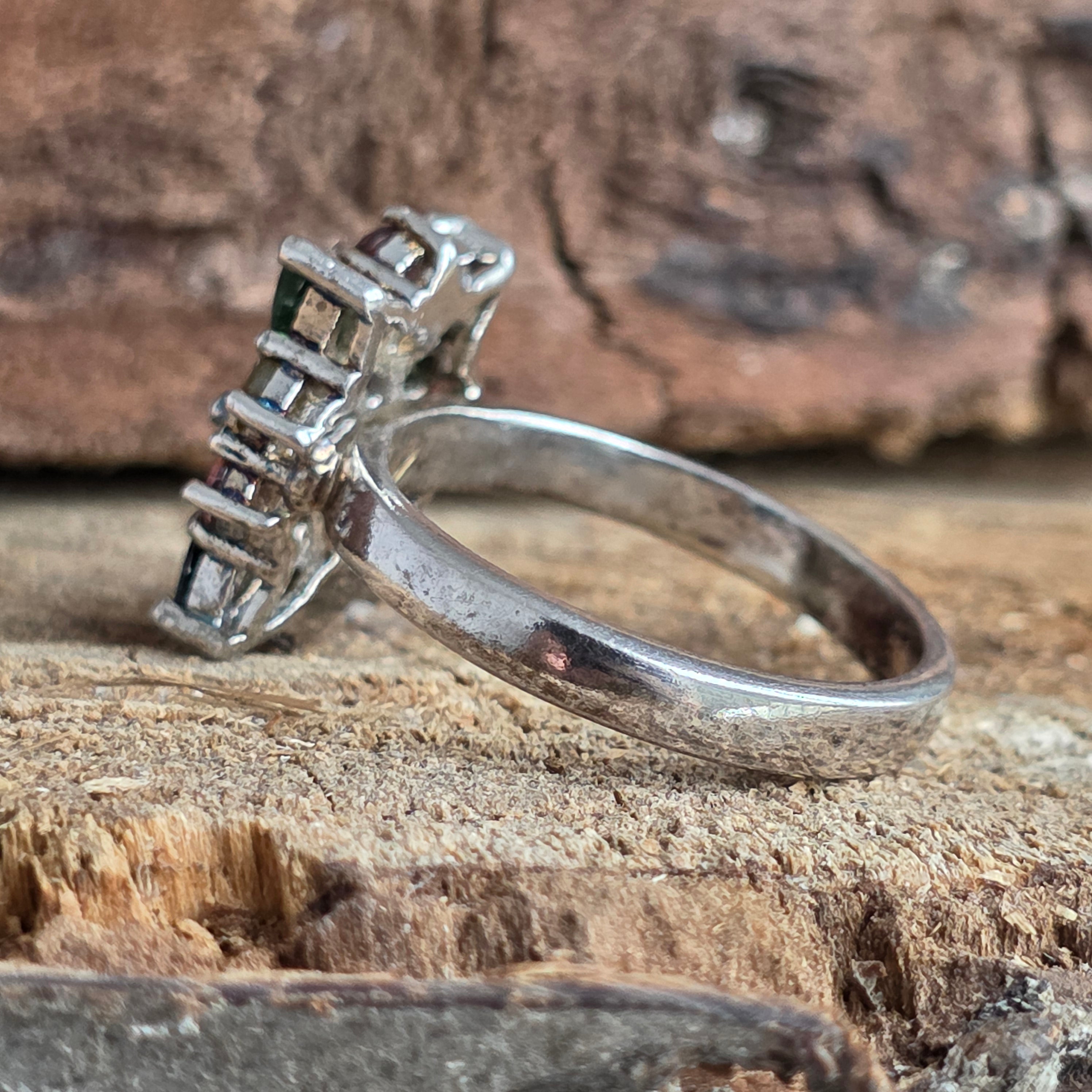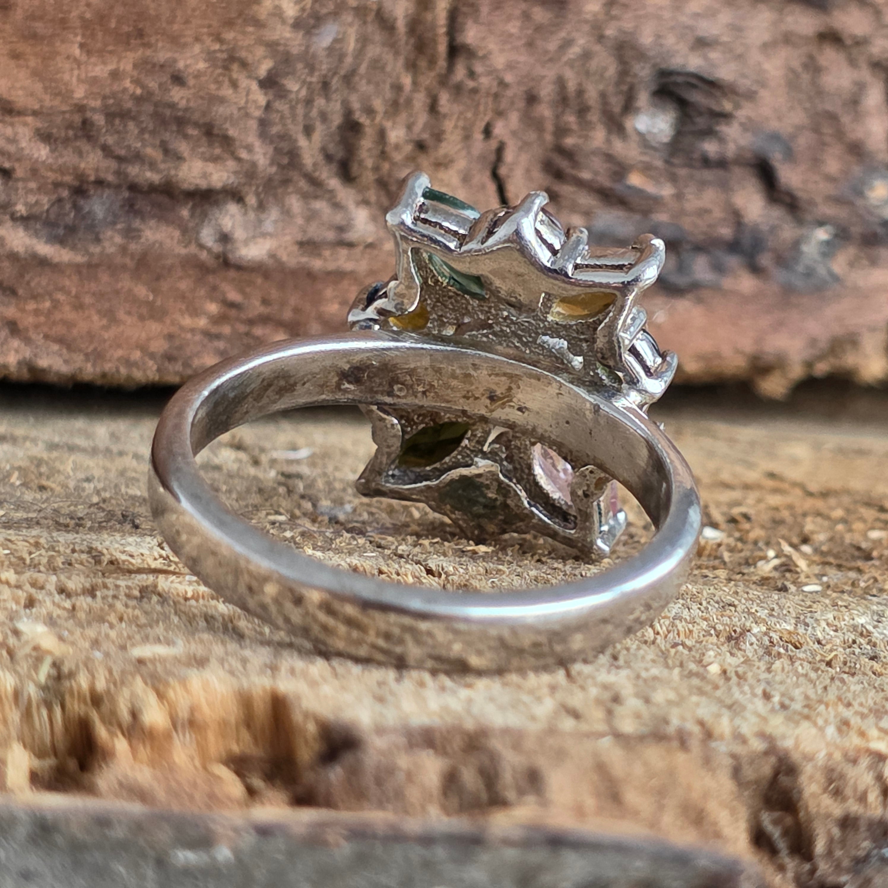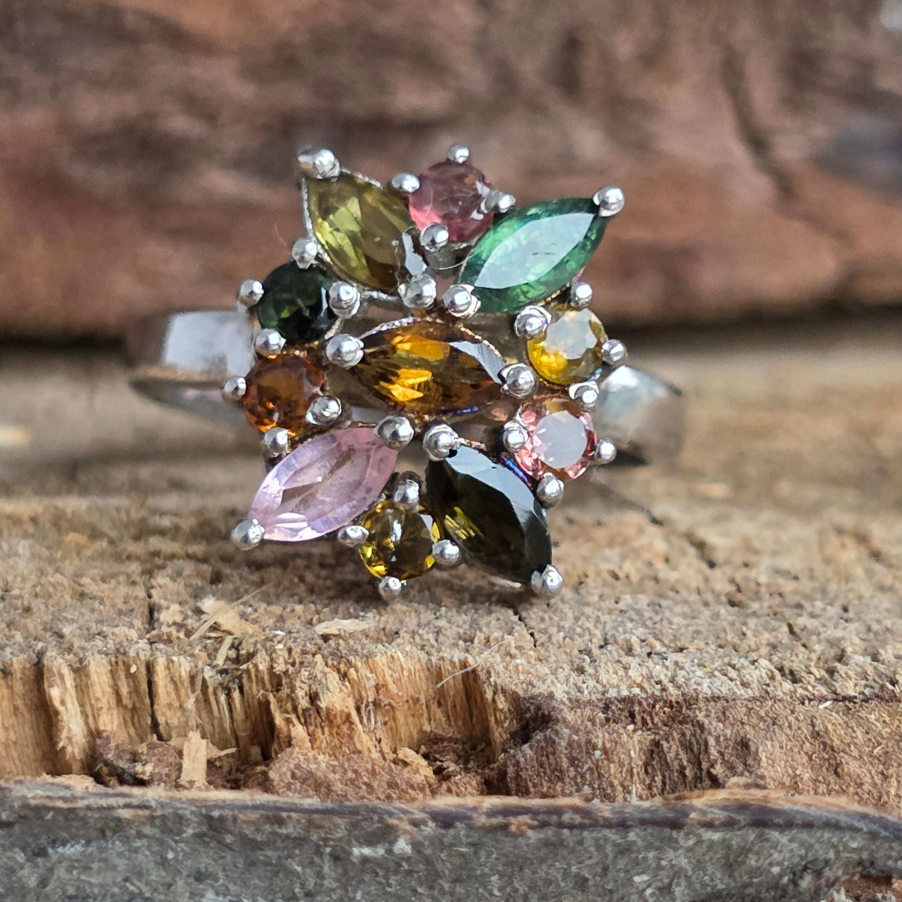 Експлозия от цвят и изтънченост – този Сребърен пръстен проба 925 с покритие от родий вдъхва живот на жизнения спектър на естествени турмалини, аранжирани в елегантен флорален дизайн.