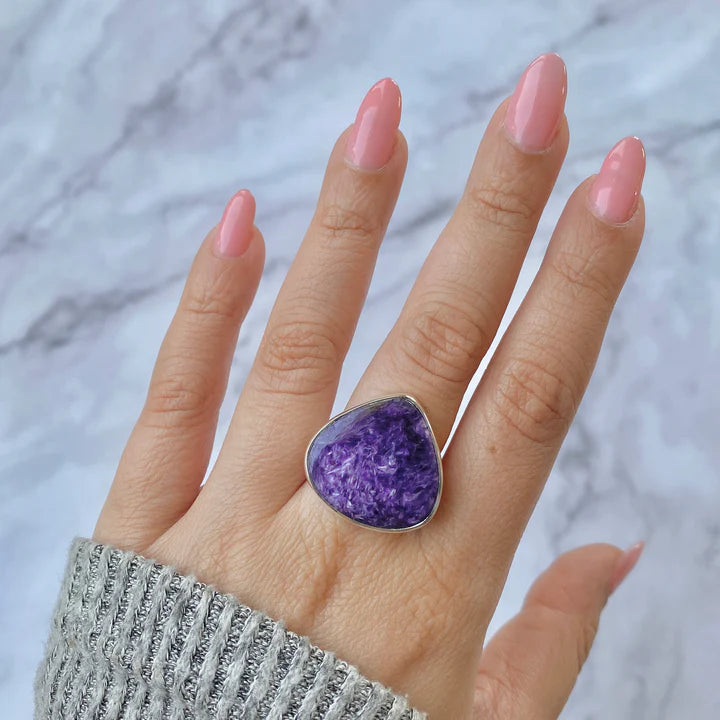 Изберете този сребърен пръстен с естествен чароит, уникален по своя вид, забележим с живите си лилави нюанси и неповторимите текстури. Закрепен в сребро 925, този пръстен подчертава естествената красота на камъка и добавя изтънченост към всяко облекло.