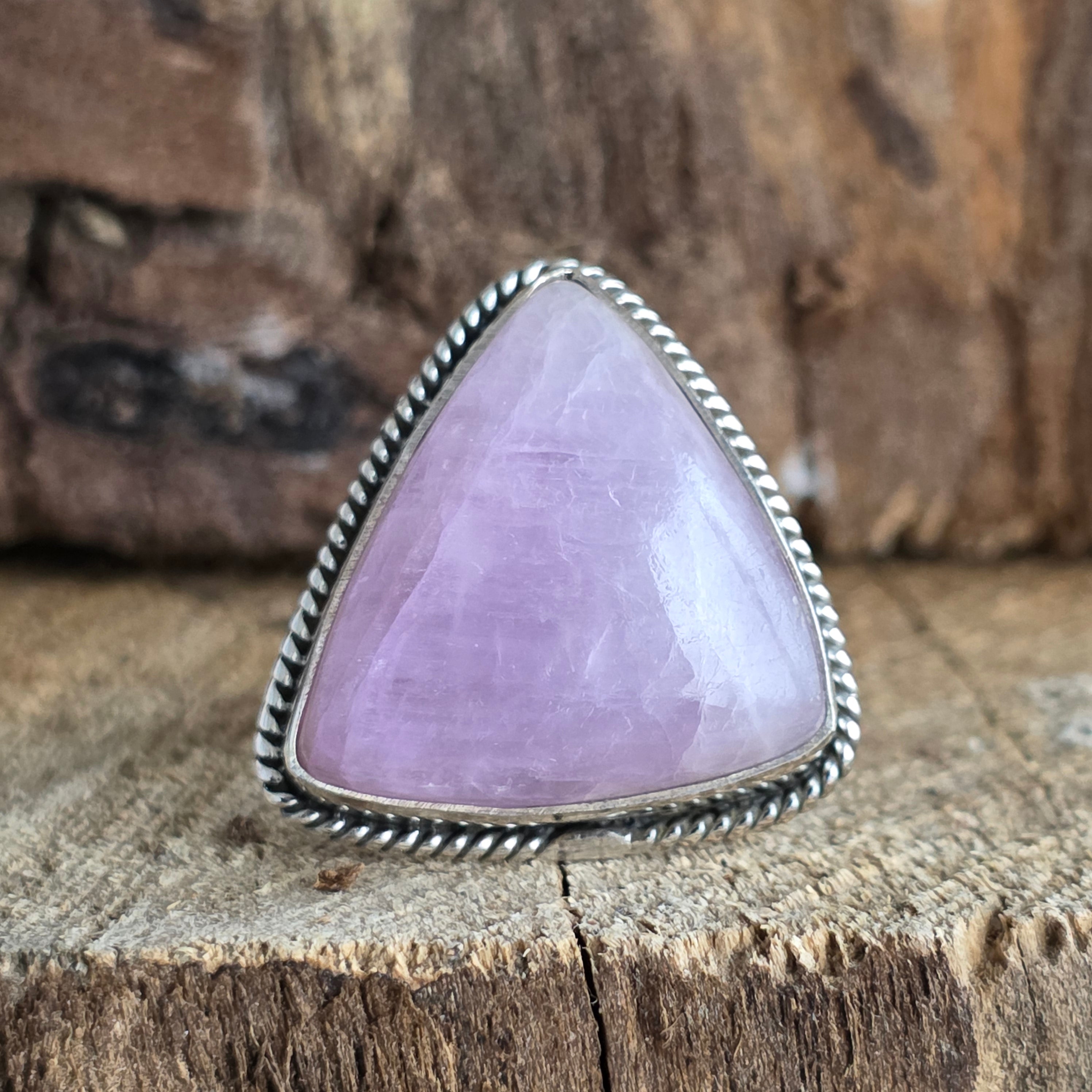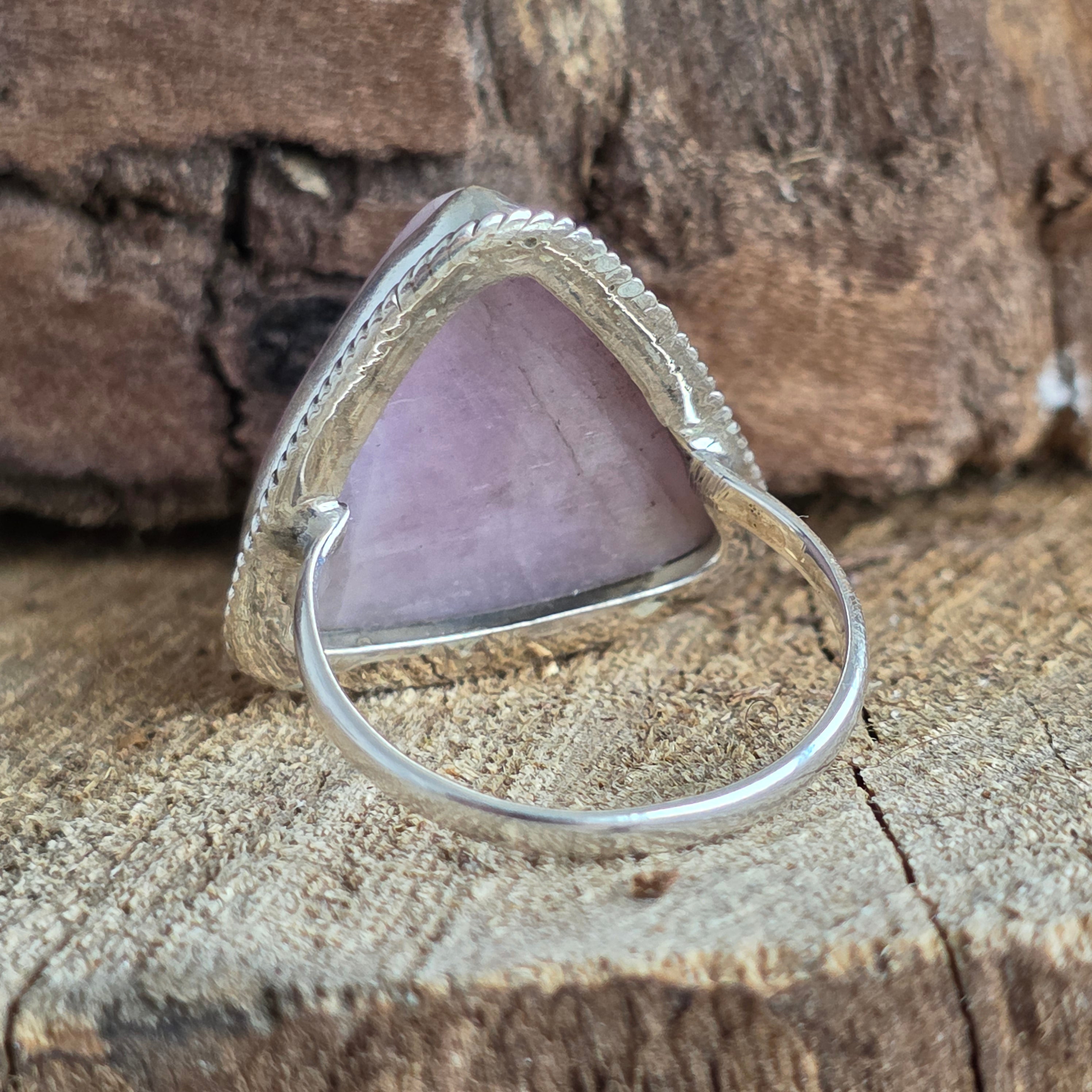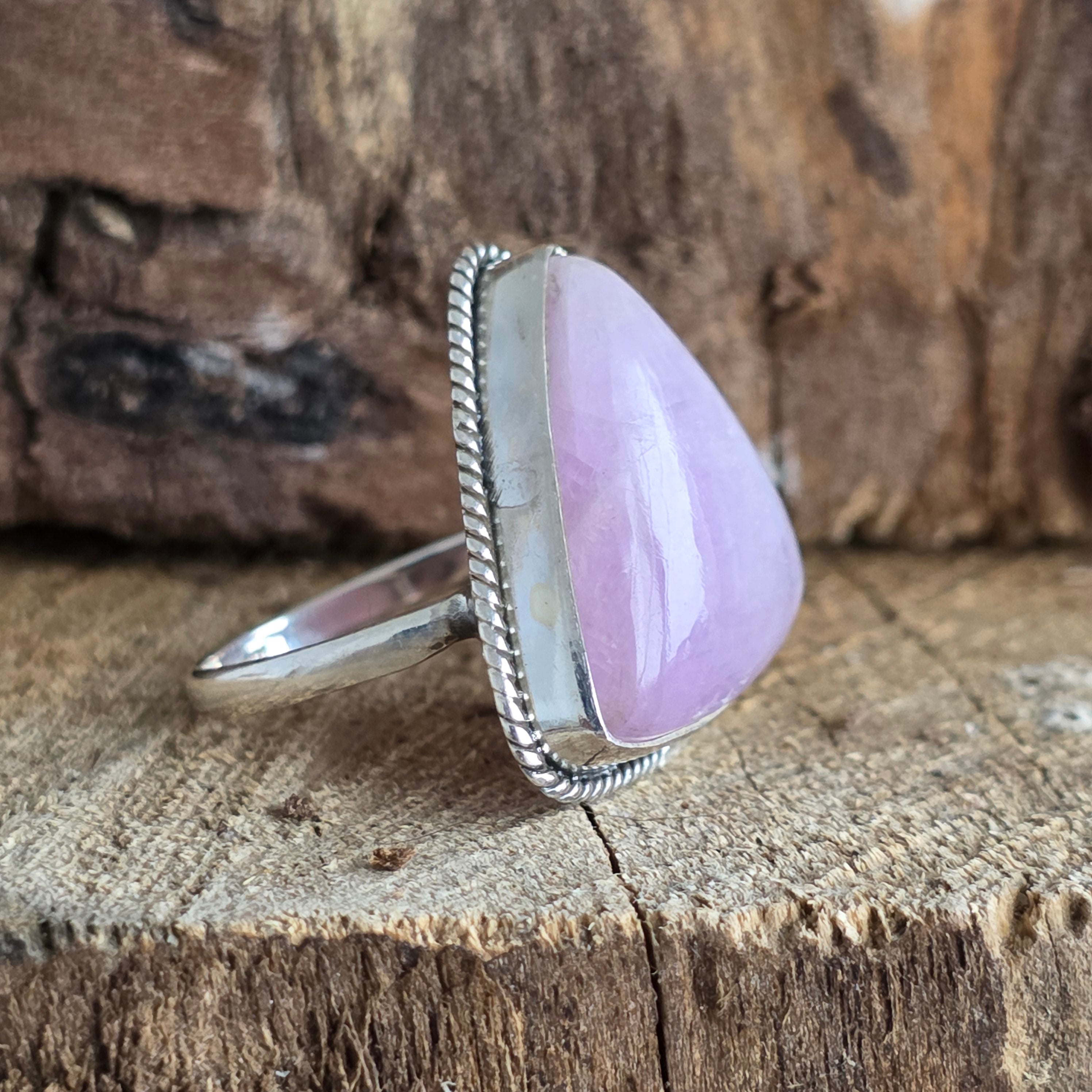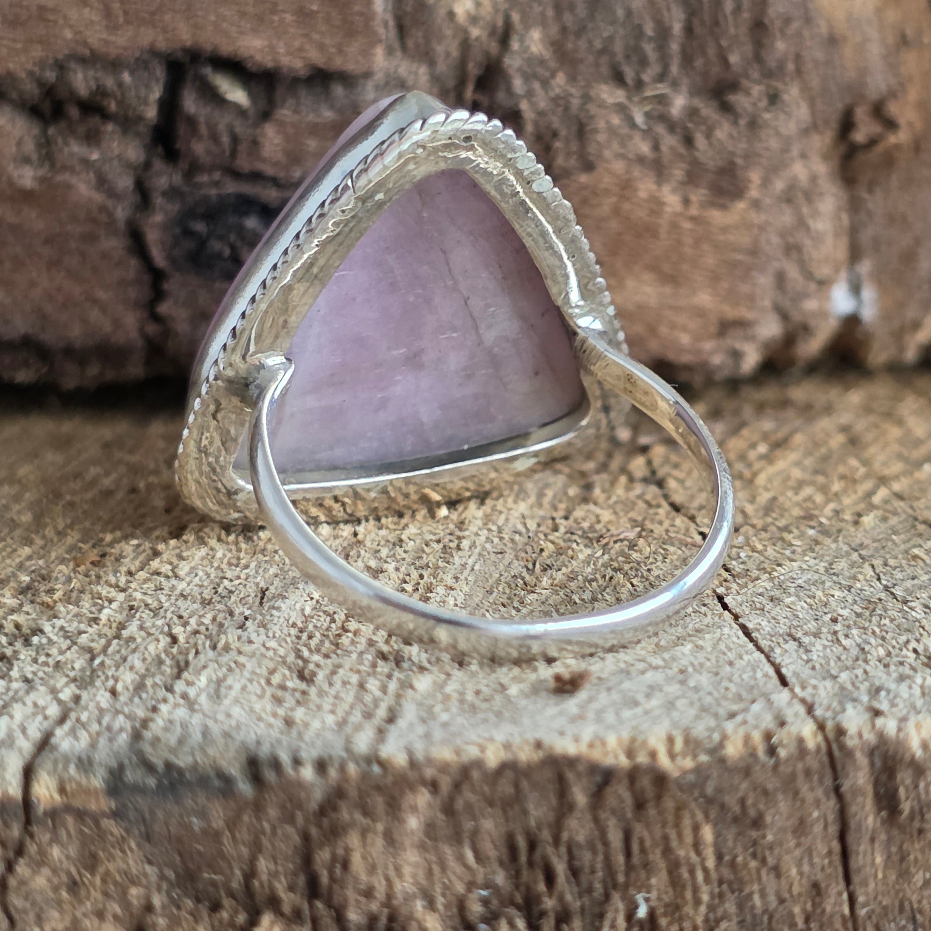 Изящен сребърен пръстен проба 925, който носи в центъра си изяществото на скъпоценен камък естествен кунцит – с фини бледорозови тонове и полупрозрачни отблясъци, които сякаш вдъхват светлина.