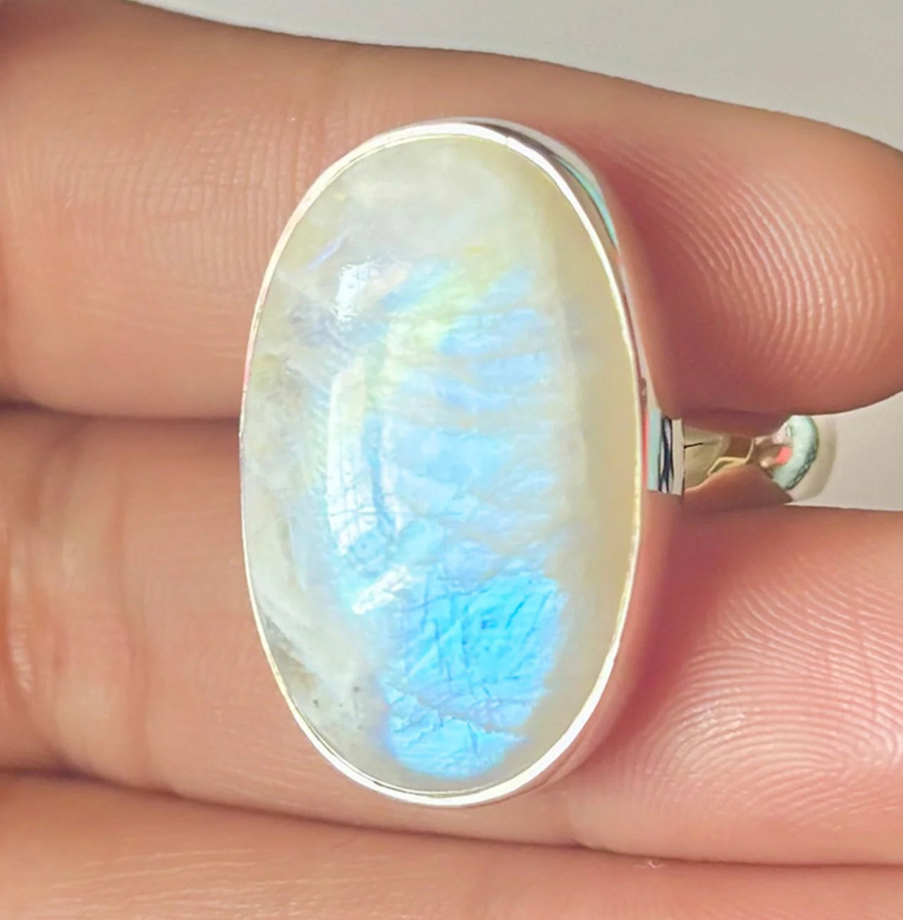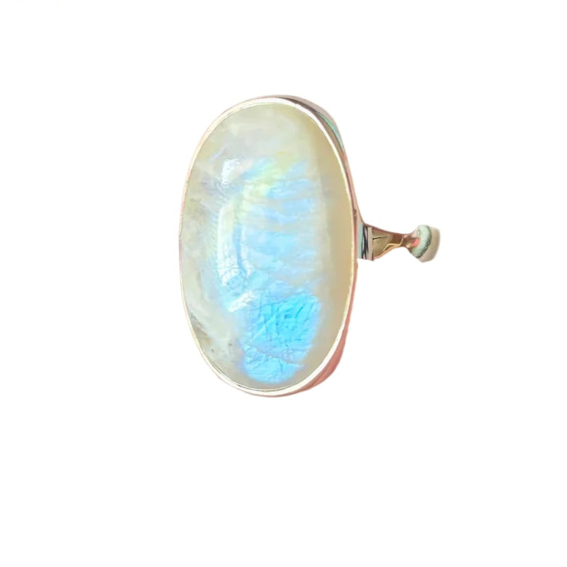 Уникален пръстен, в който дъговидният лунен камък разкрива нюанси на интензивно синьо и златни отблясъци, подобни на зори, докосващи небето. Неговите нереални отражения напомнят за танца на северното сияние, придавайки му мистичен и дълбок вид.