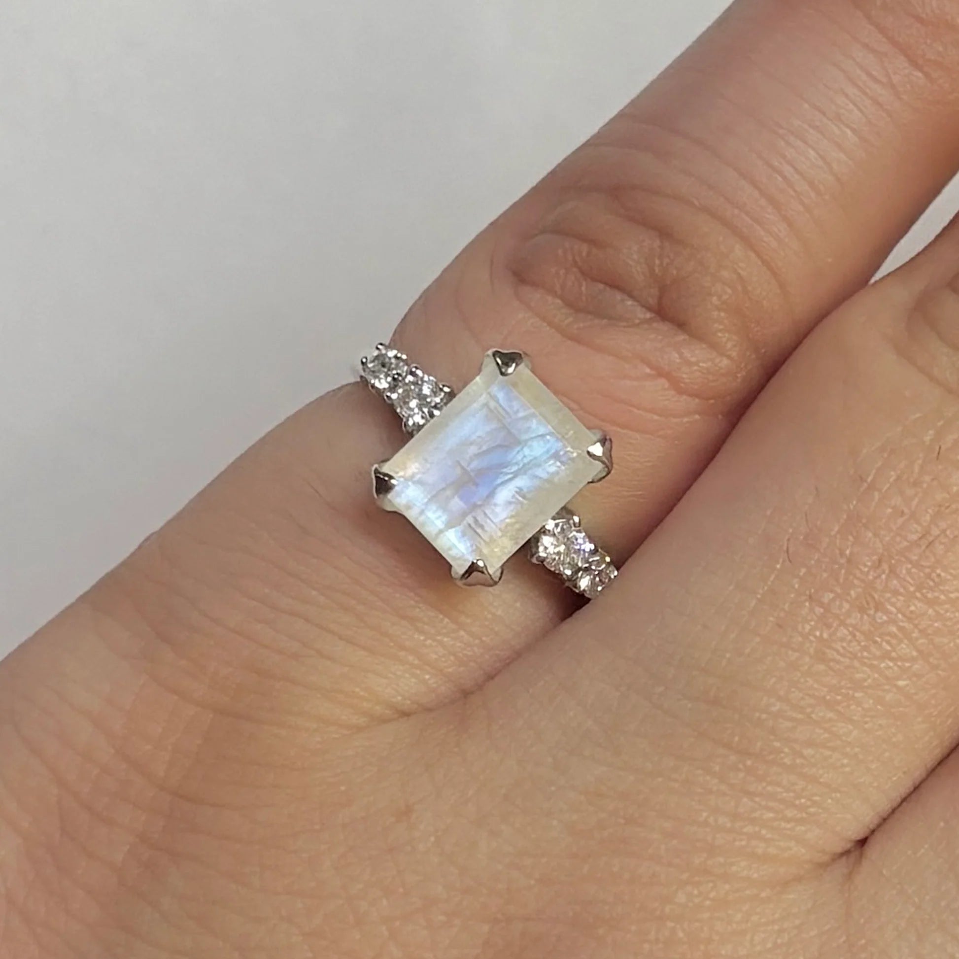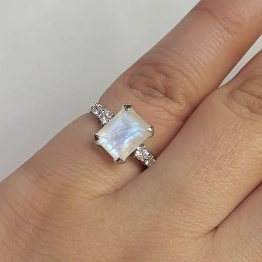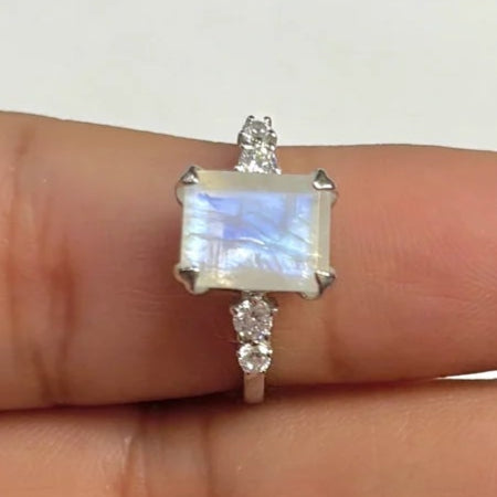 Този пръстен от сребро 925 с естествен лунен камък изрязан във форма Square съчетава модерна елегантност с мистерията на кристалите. Уникалните сини отблясъци на лунния камък се подчертават от нежния блясък на страничните цирконии, създавайки впечатляващо и изискано бижу.