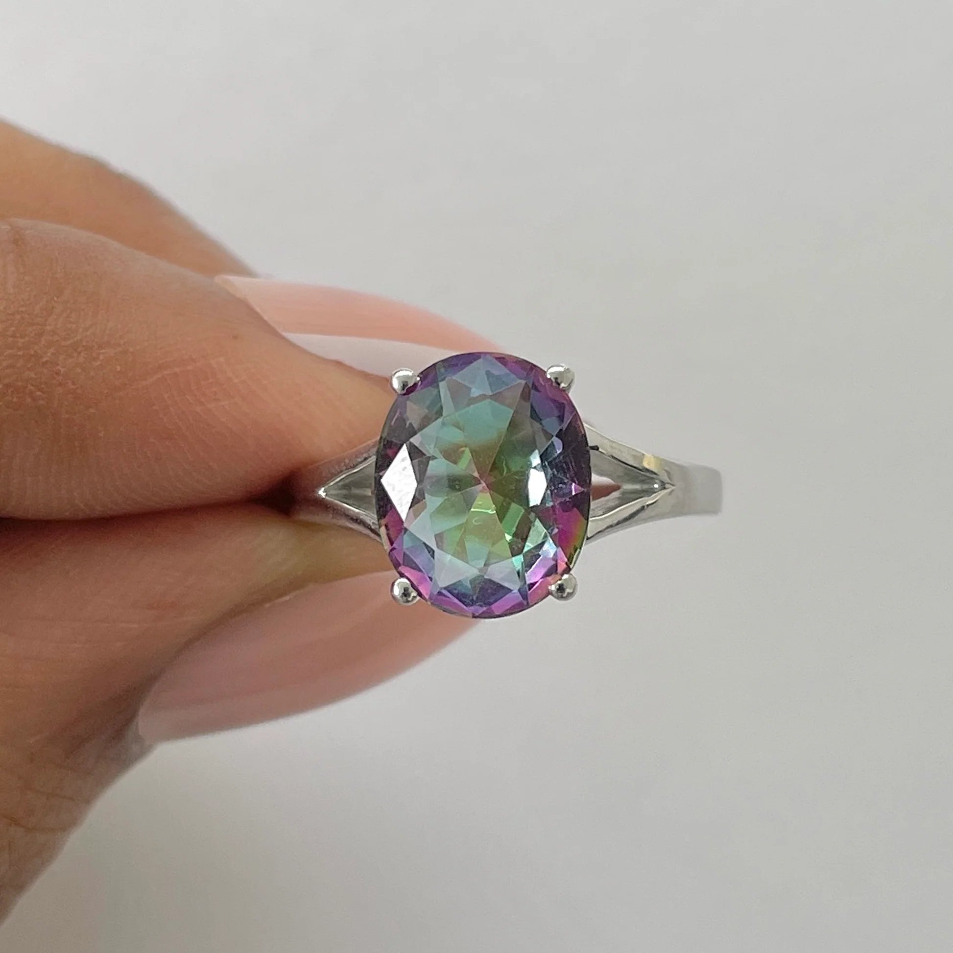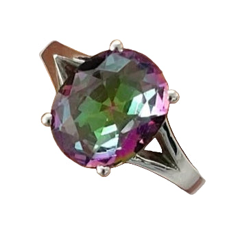Този пръстен от сребро 925 с мистичен топаз е впечатляващо бижу, което привлича погледа със своите калейдоскопични отражения. Всяка фасета разкрива експлозия от цветове – от смарагдово зелено и кралско лилаво до синкави нюанси – създавайки уникален блясък.