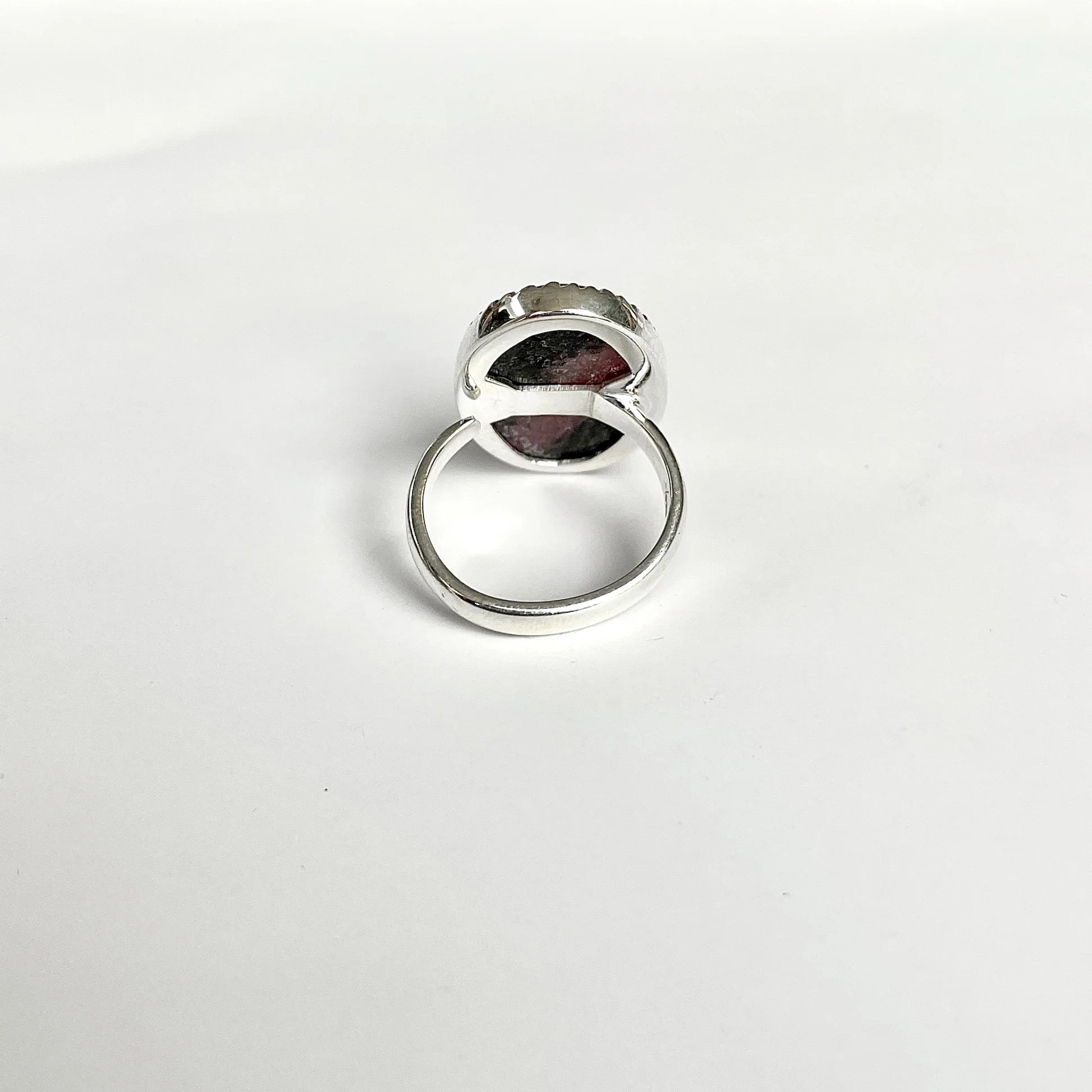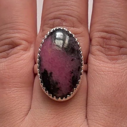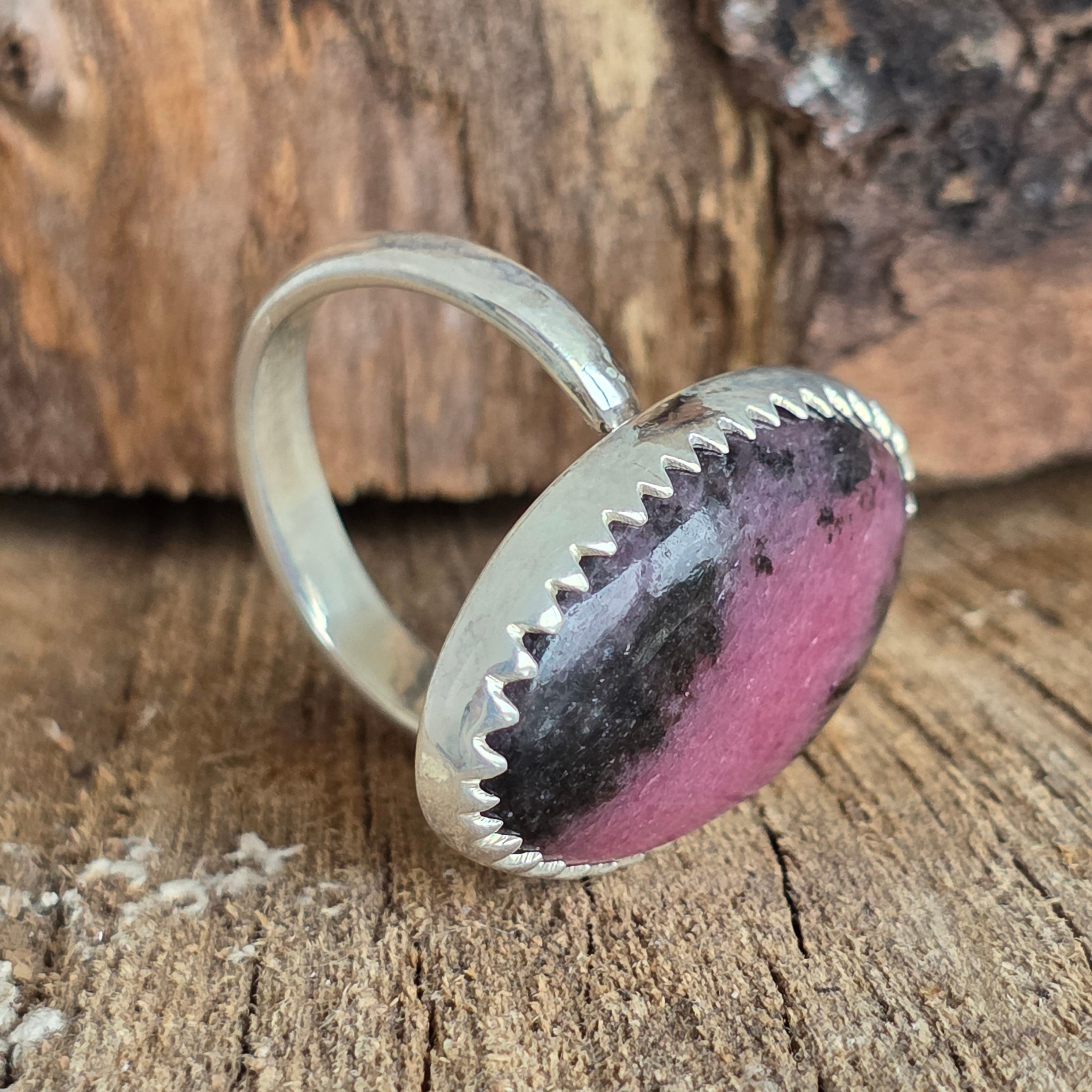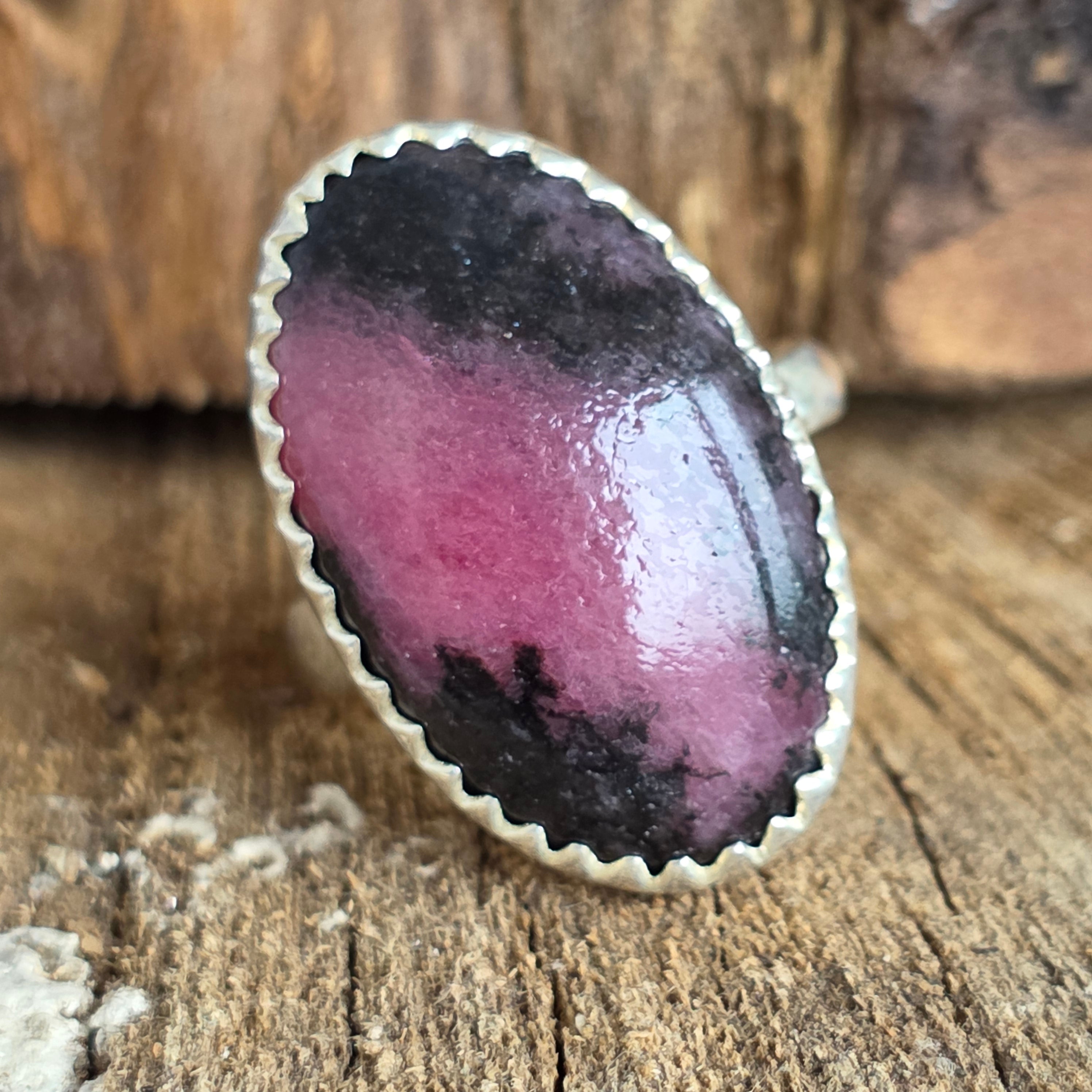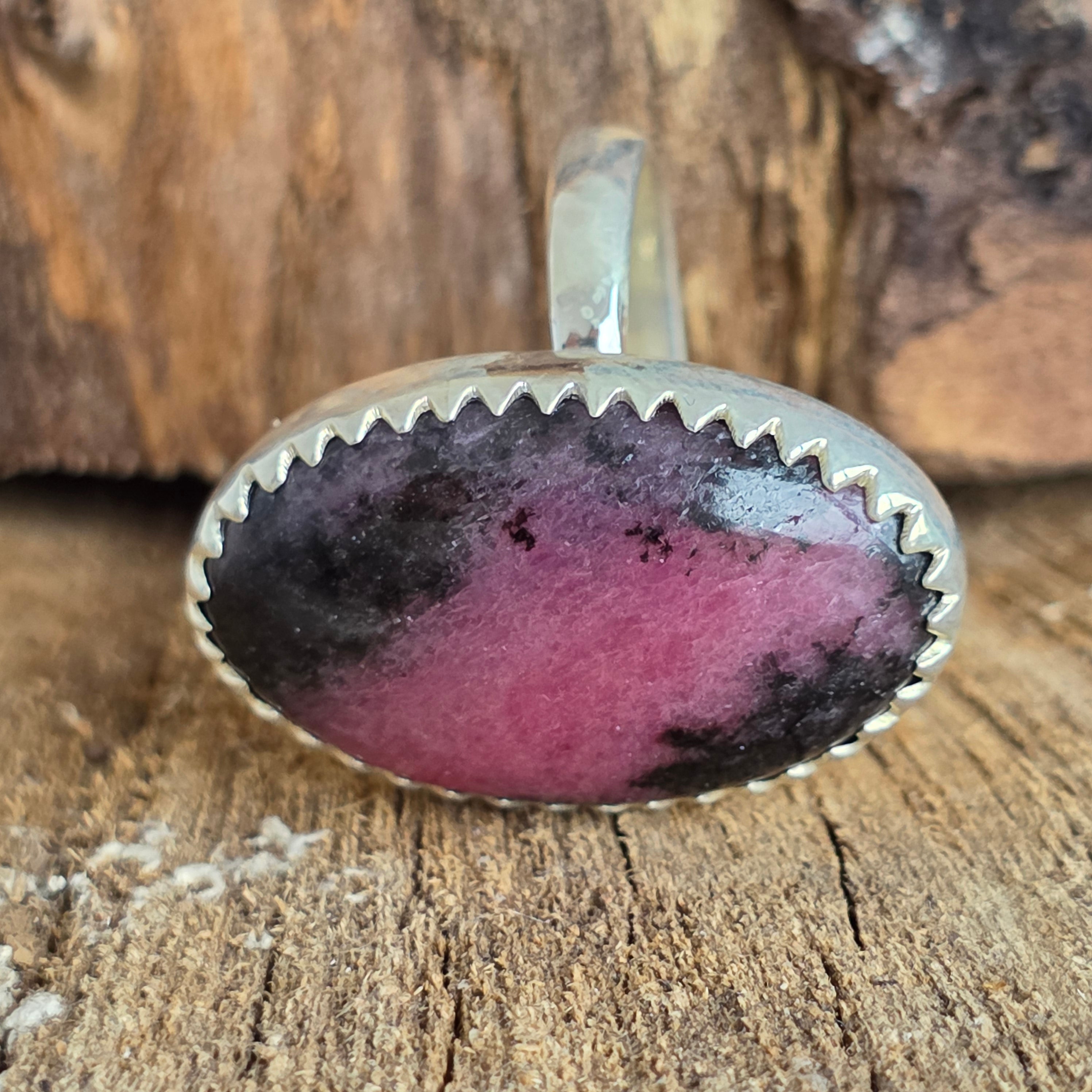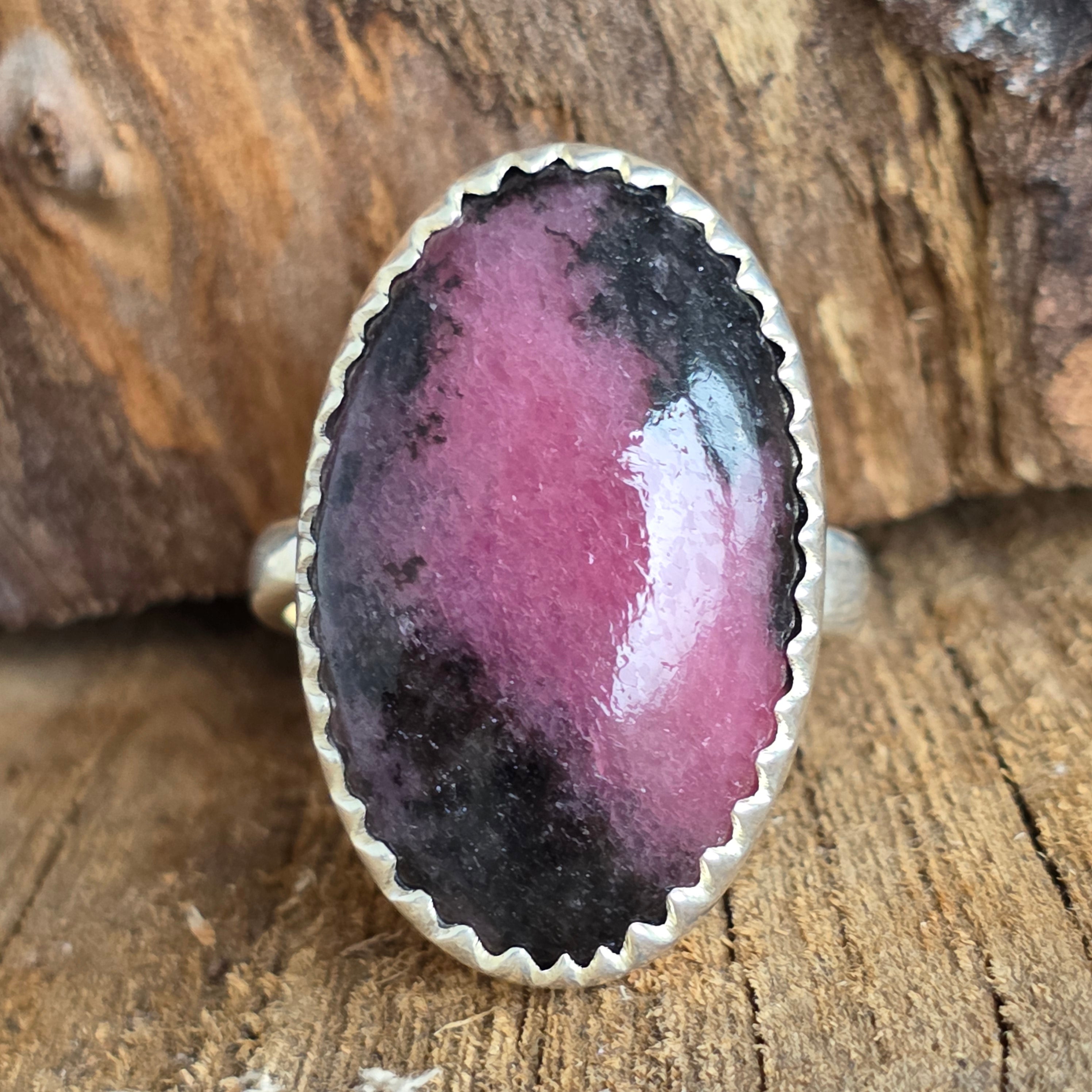 Този сребърен пръстен 925 с родонит е изискано и изразително бижу, където жизненият розов цвят на камъка се смесва с естествените черни нюанси, създавайки впечатляващ минерален узор. Всеки пръстен е уникален поради вариациите в цвета и текстурата на камъка, което му придава неповторим характер.