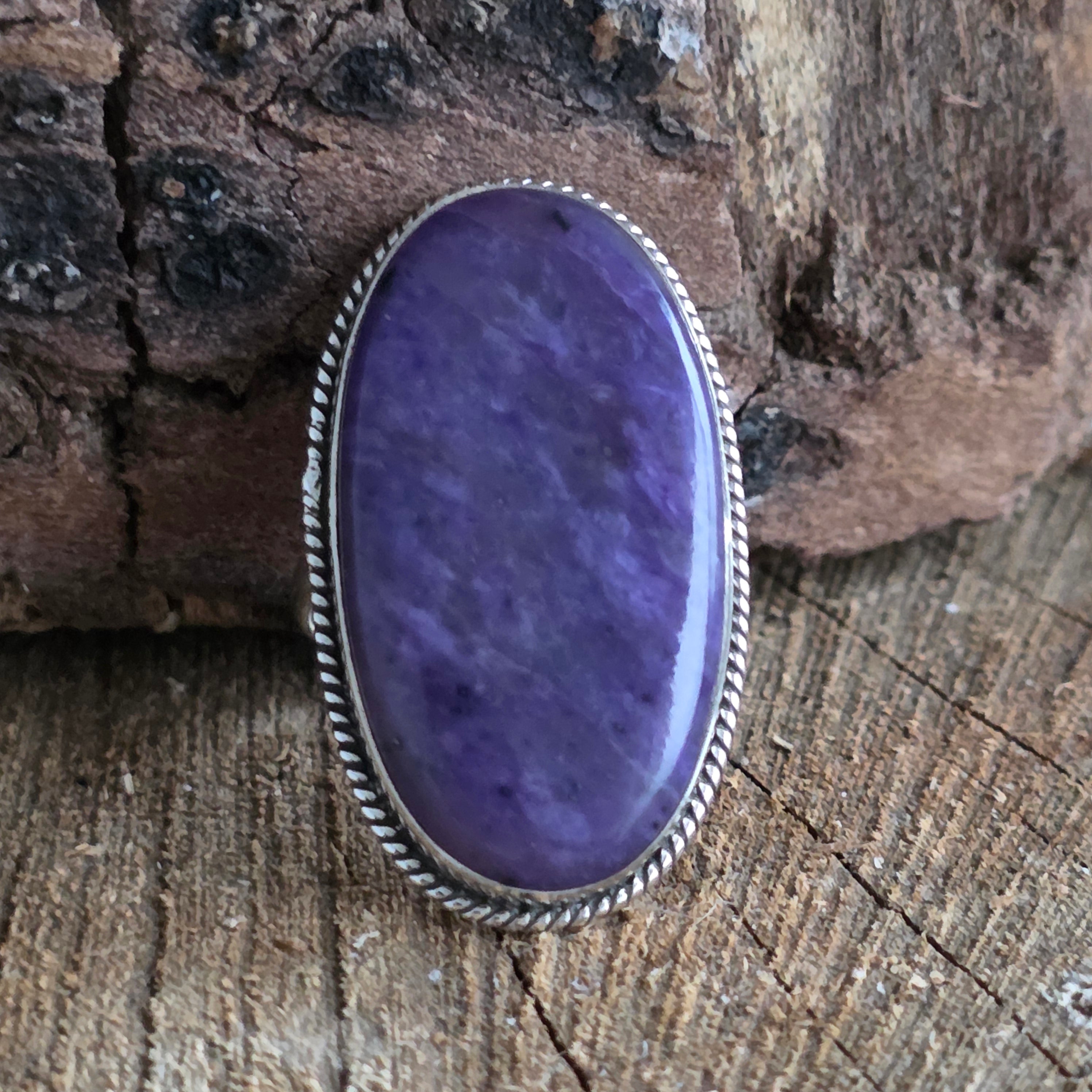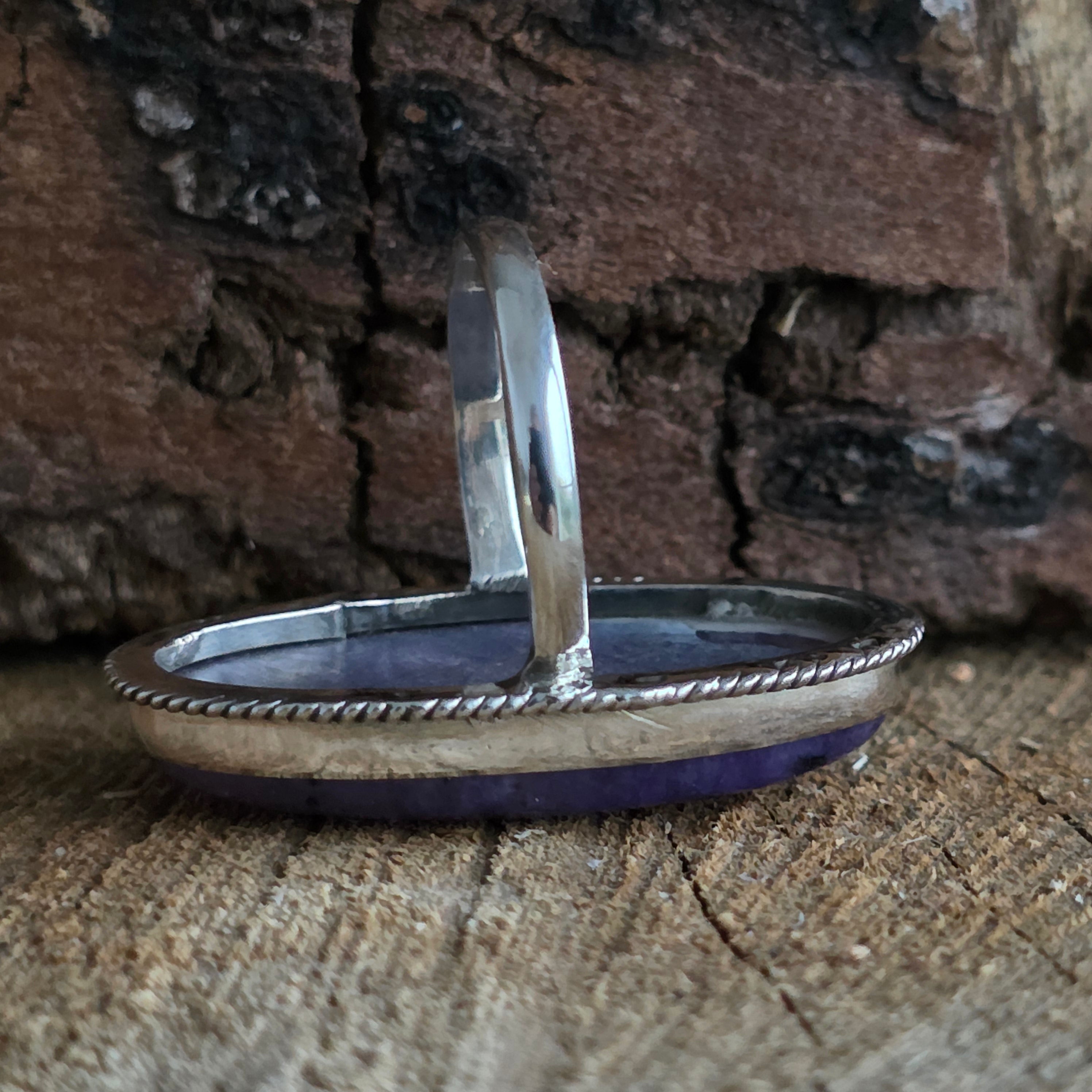 Един масивен, ръчно изработен пръстен от сребро 925, който съдържа естествен камък Хароит, с наситени виолетови нюанси и копринени отблясъци, напомнящи космическа картина. Декоративната рамка в стил twisted wire work добавя дълбочина и изтънченост, балансирайки модерната елегантност с традиционното майсторство.