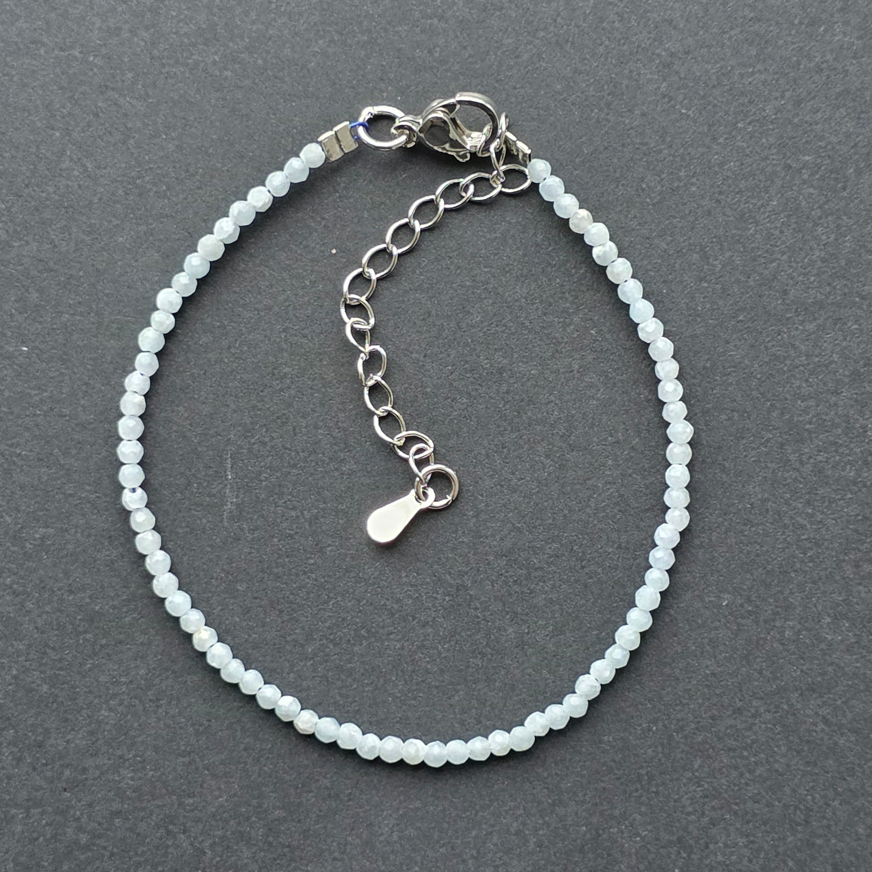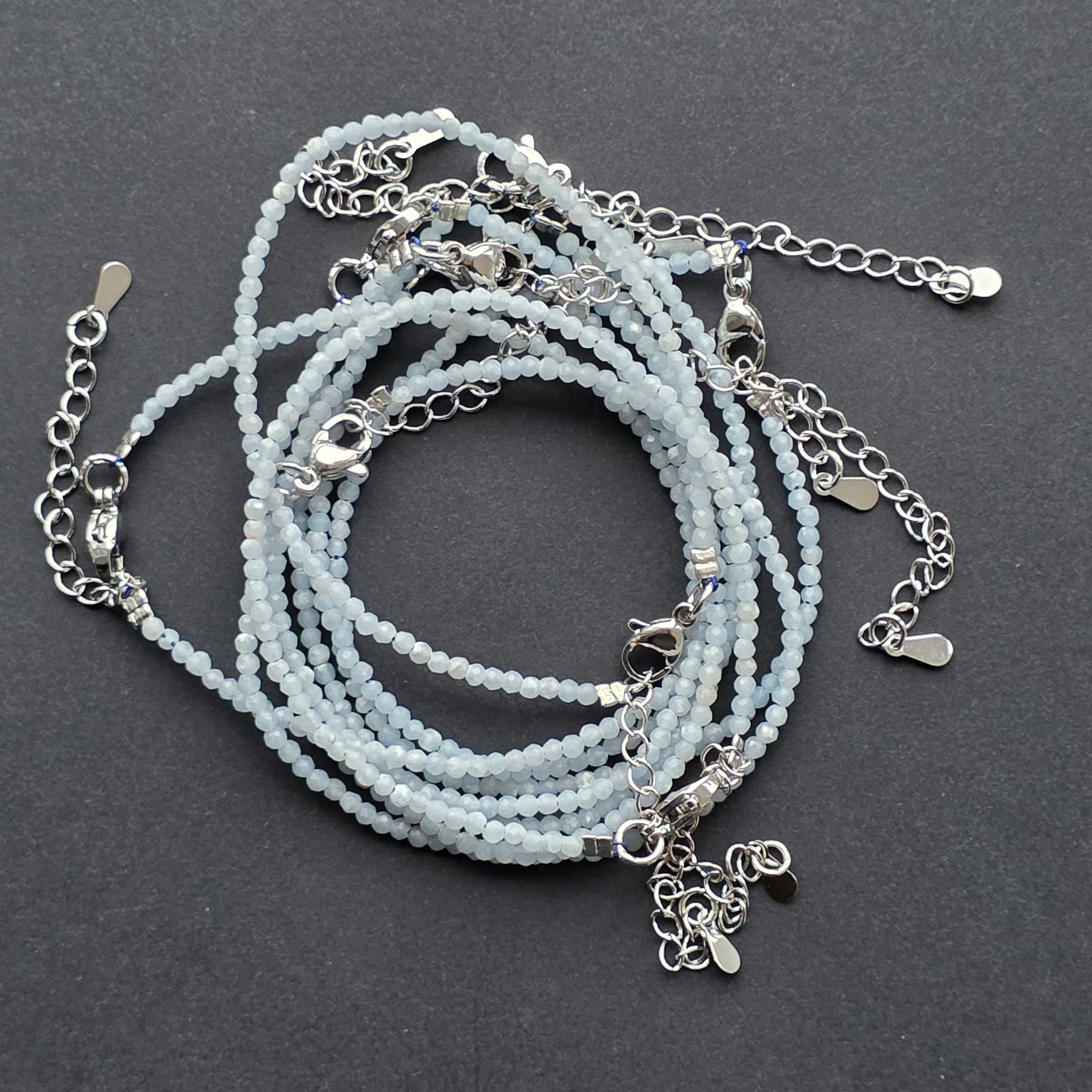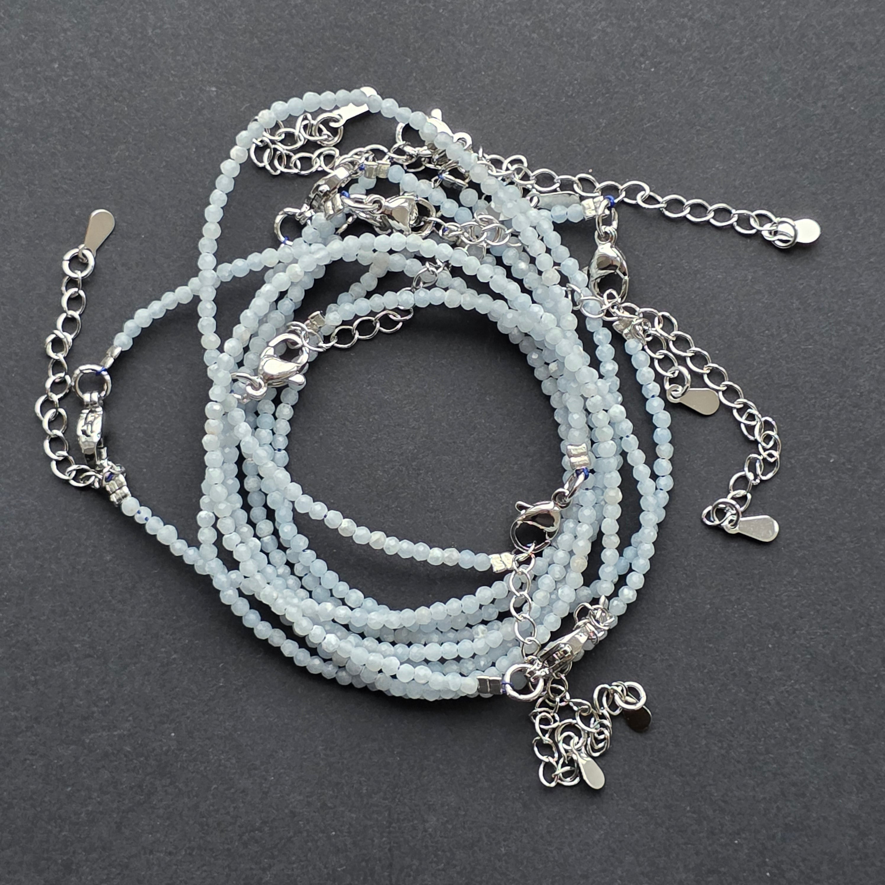 Анжелитът е камък с меко излъчване, като светлина, филтрирана през утринните облаци. В тази изящна гривна фасетираните мъниста от 2 мм улавят нежни сини нюанси, придавайки на бижуто усещане за спокойствие, чистота и вътрешен мир.