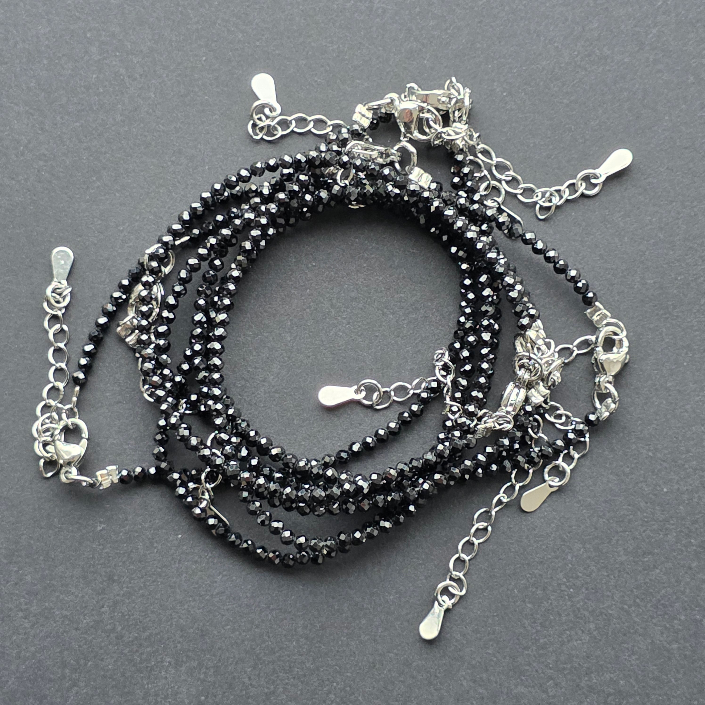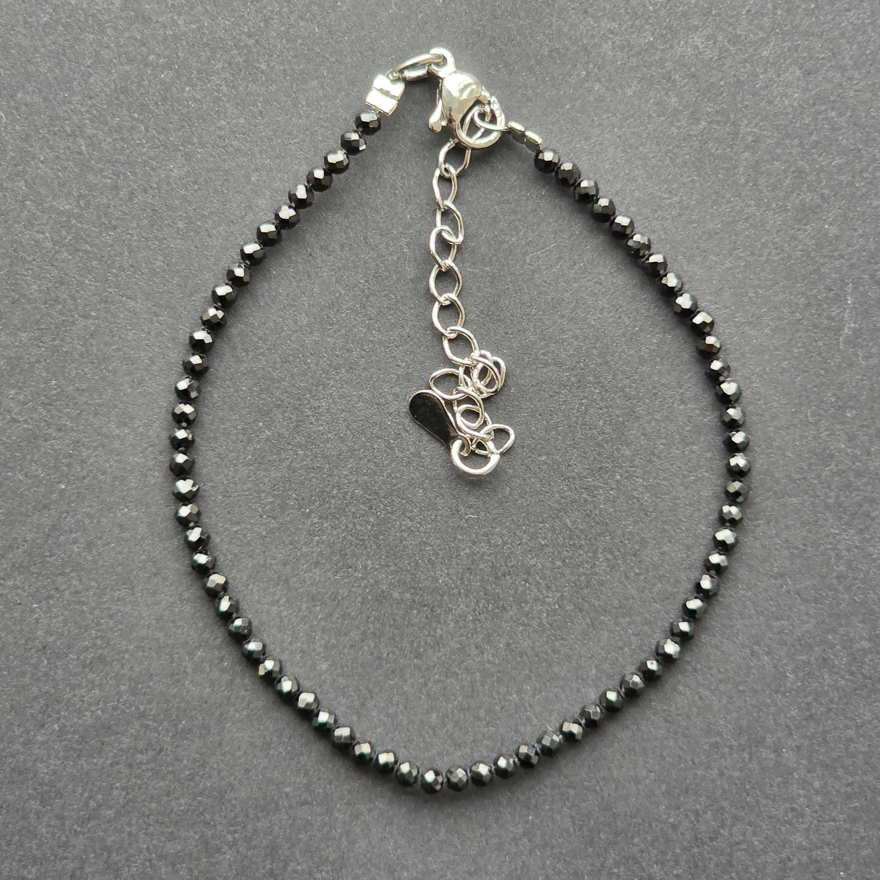 В тази деликатна гривна черният спинел се разкрива с изключителен блясък — дълбок, наситен и безупречен. Фините 2 мм мъниста, прецизно фасетирани, преобразуват светлината в сдържани, почти хипнотизиращи отражения, като ясна нощ, в която всяко движение запалва тихо искрица.
