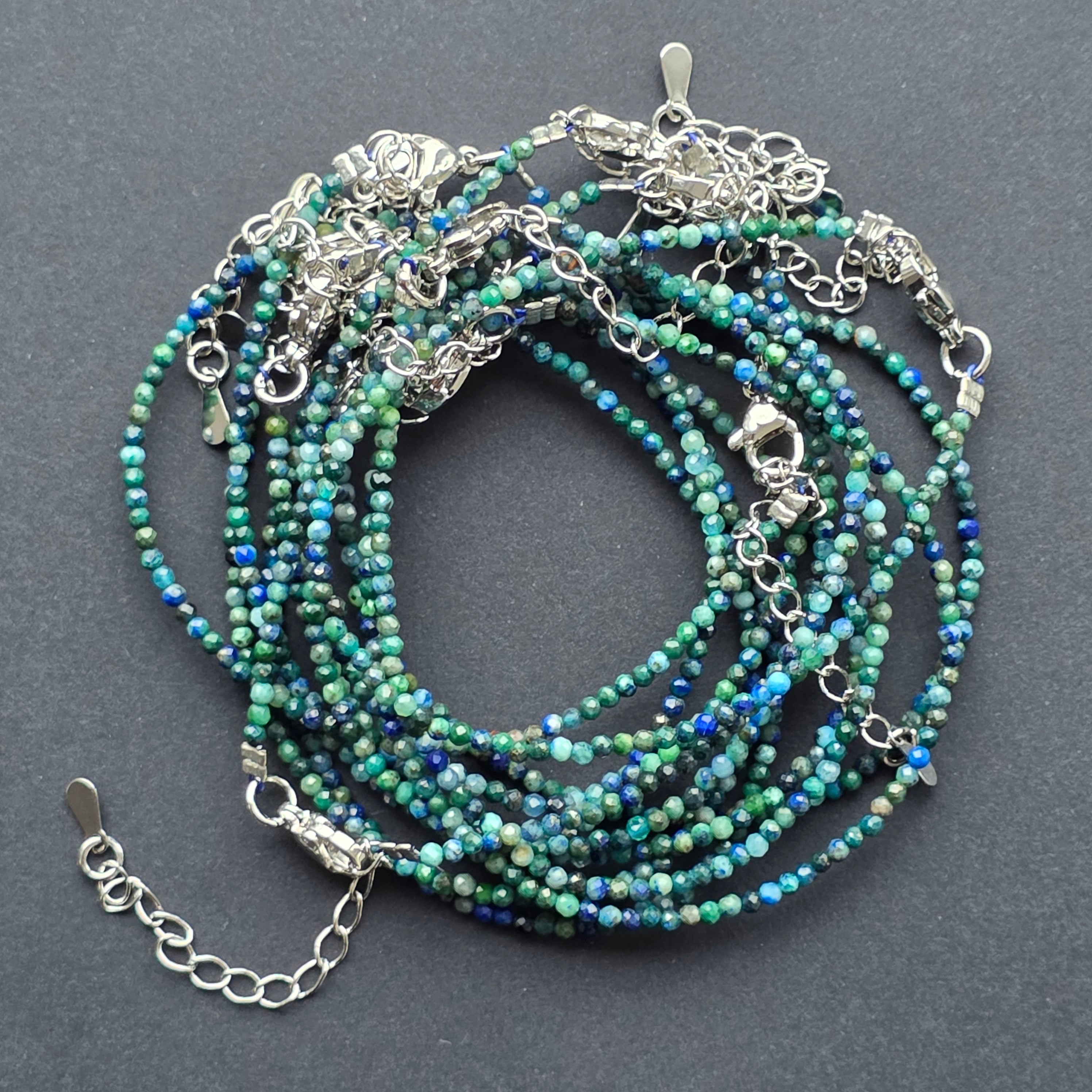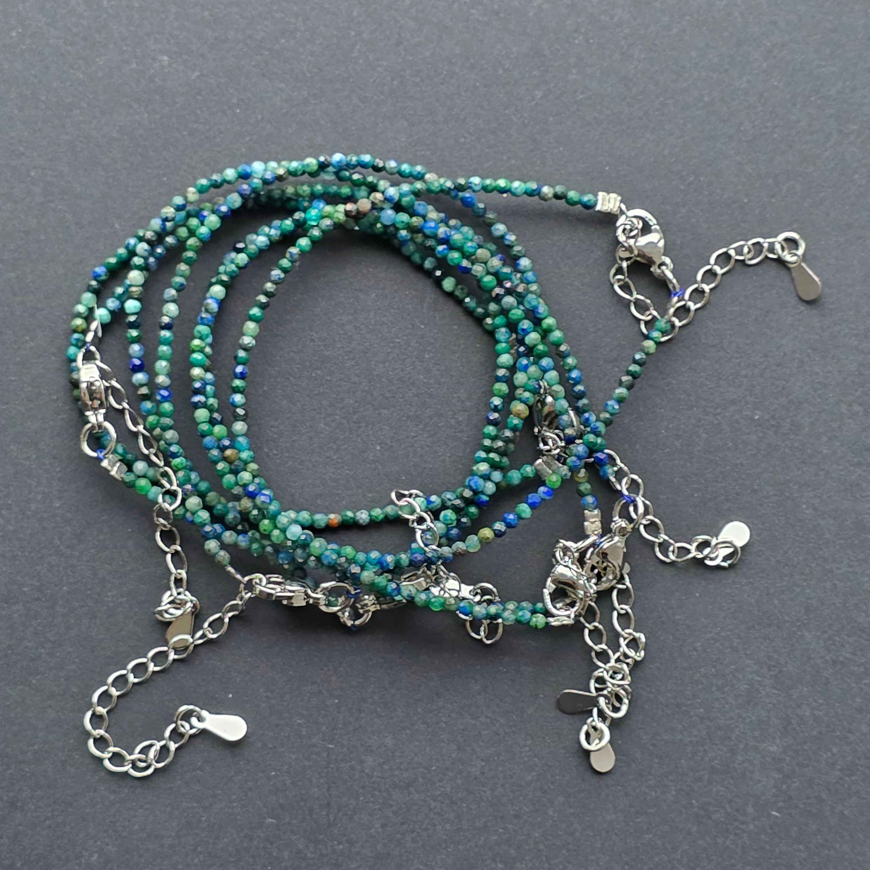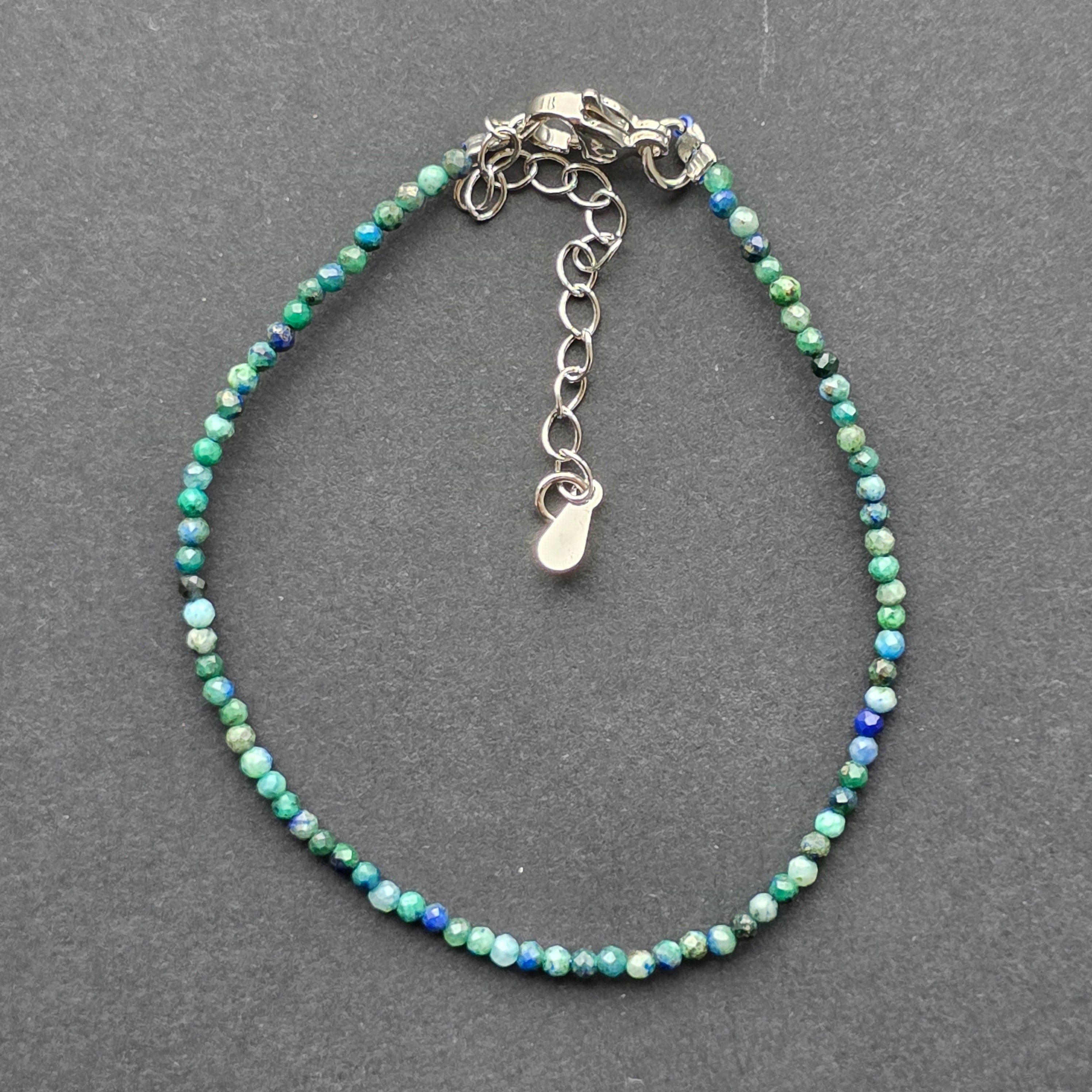 В деликатна, почти ефирна гривна азурит-малахитът оживява в сферични мъниста от едва 2 мм, фасетирани така, че да улавят светлината в малки зелени и сини искри. Всяко мънисто носи уникални нюанси, като концентрични кръгове, формирани с времето, скулптурирани от природата с търпение.