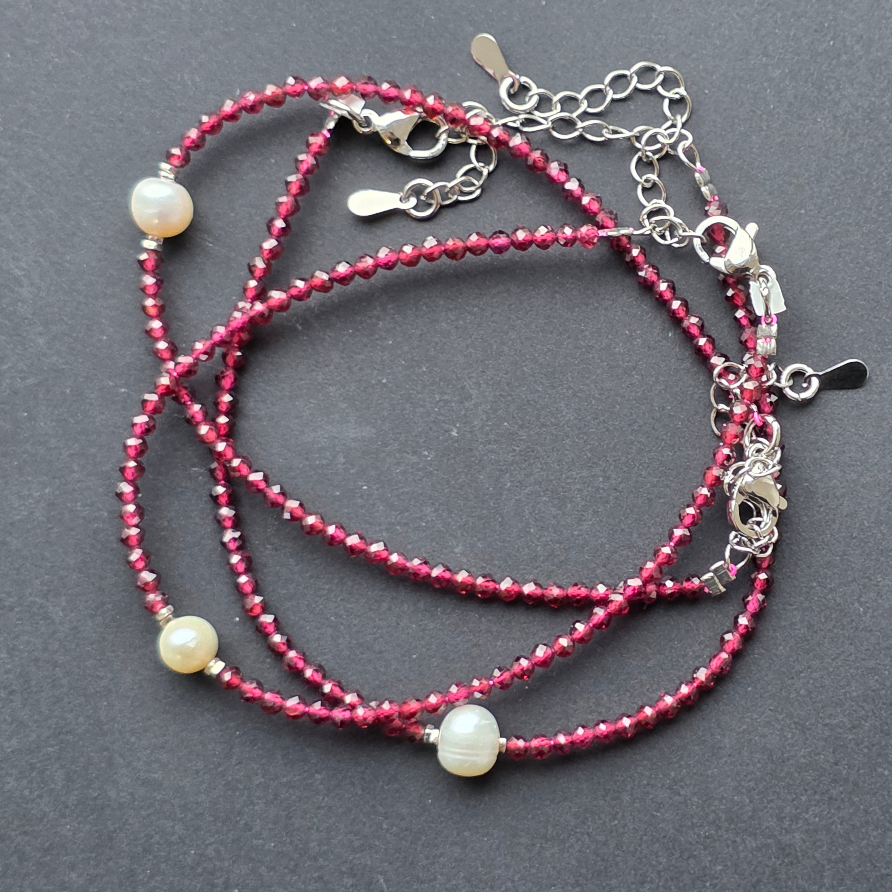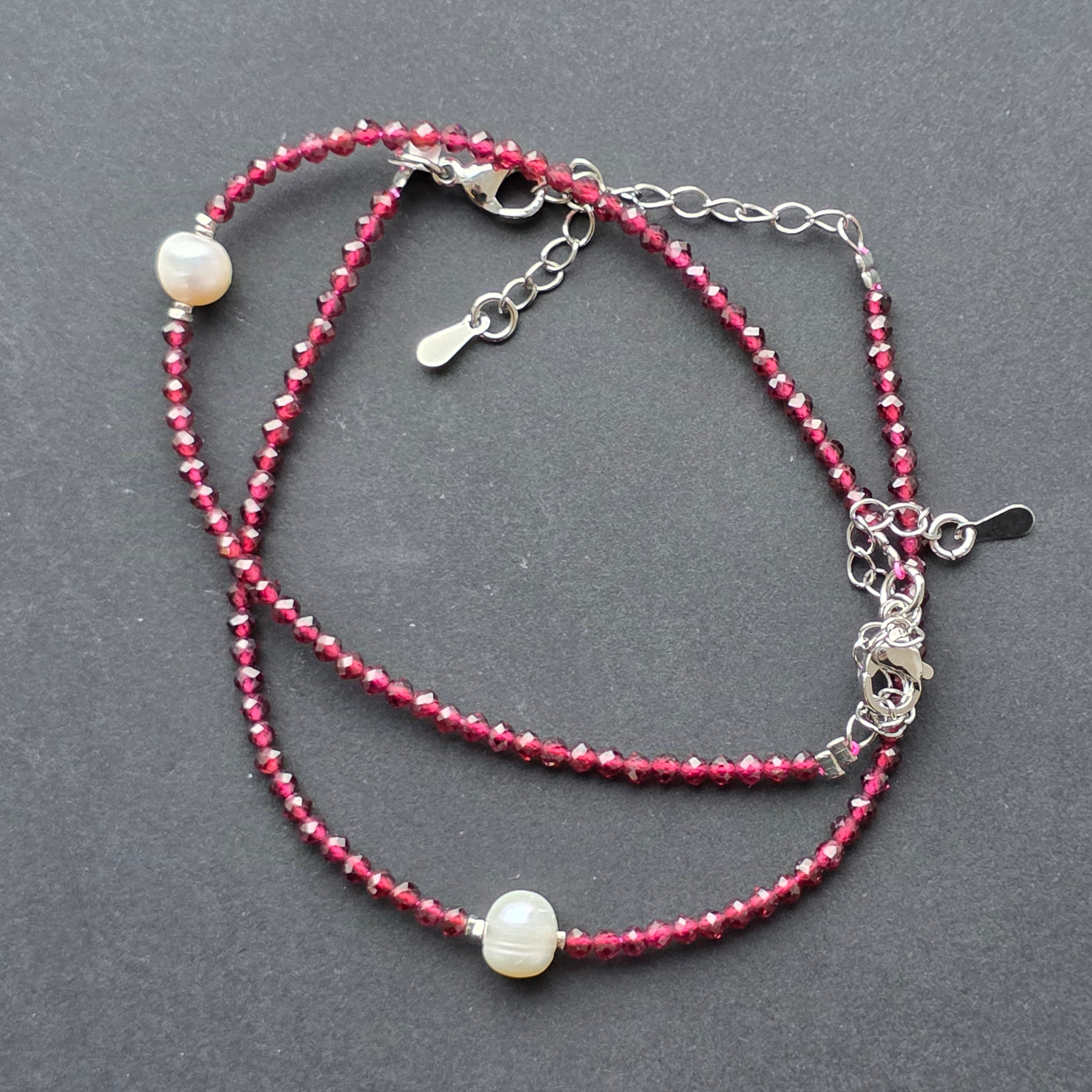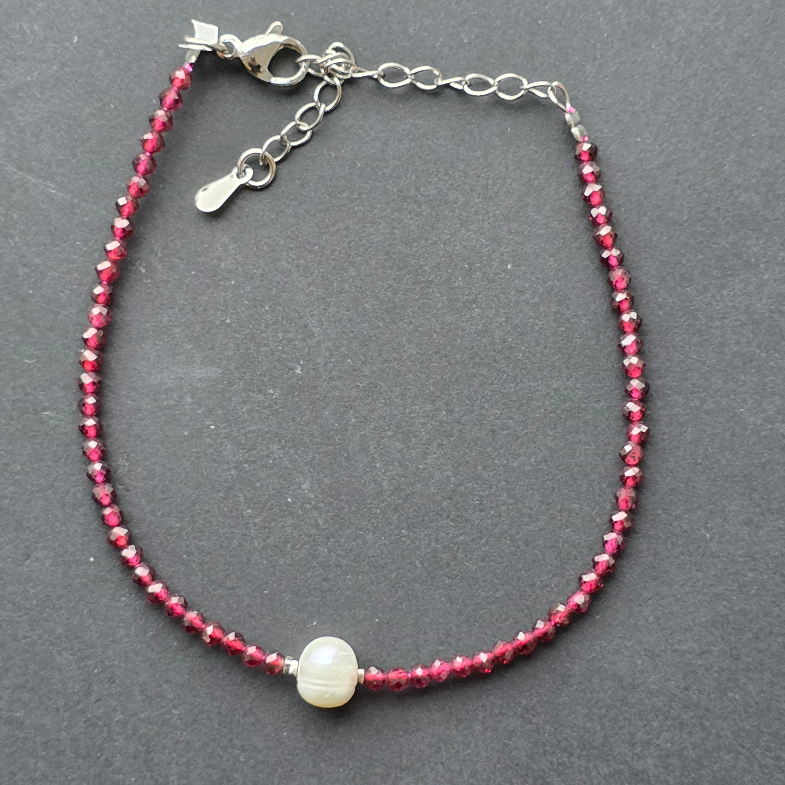 • Камъни: естествен фасетиран гранат 2–2,5 мм + перла