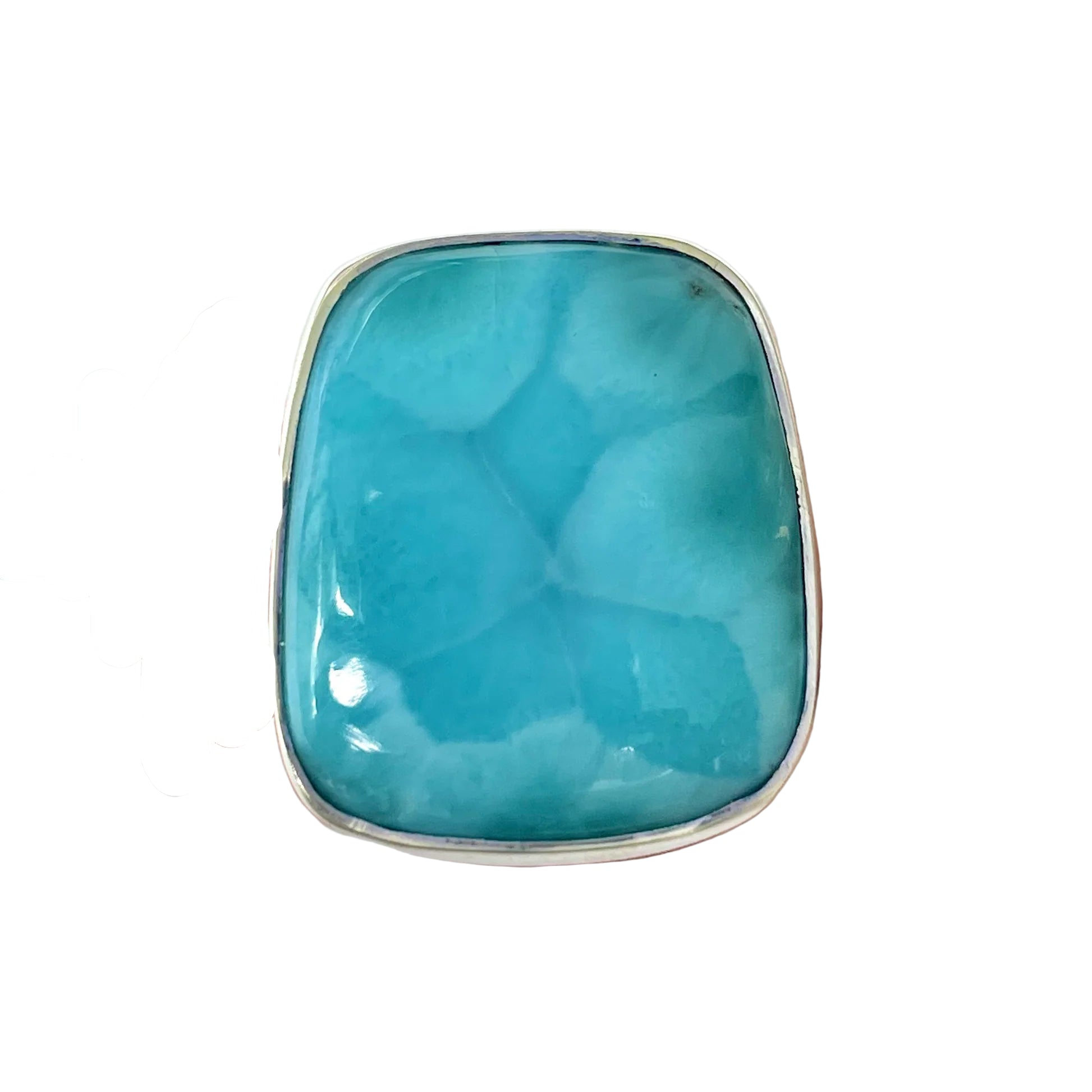 Уникален пръстен от естествен ларимар, известен като прав камък на небето и океана. Неговите нюанси на аква синьо, с бели отблясъци като вълните на морето, носят вътрешен мир и усещане за безкрайна свобода.