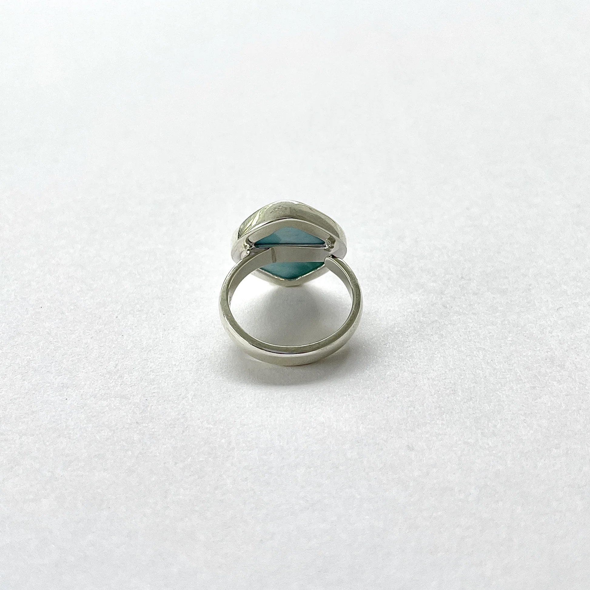 Уникален пръстен от натурален ларимар, известен като камъкът на небето и океана. Неговите нюанси на аквамариново синьо с бели отблясъци като морски вълни носят вътрешен покой и усещане за безкрайна свобода.